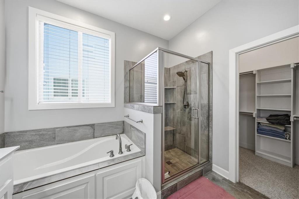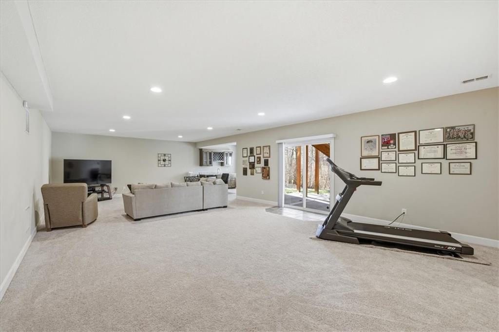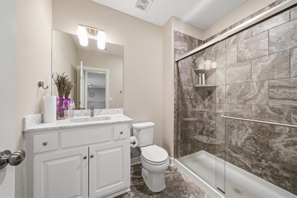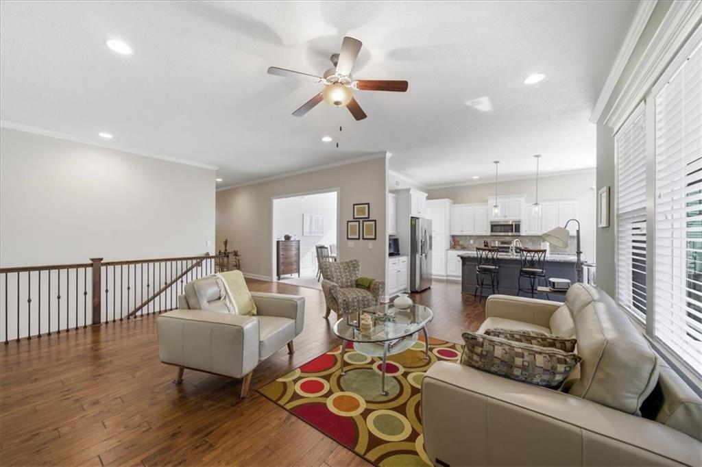 This beautifully maintained 4-bedroom, 3.5-bath ranch-style home is located in The Enclave at Shoal Creek Valley. The thoughtfully designed main level features three bedrooms, a private office with French doors, formal dining room, and a breakfast nook. Interior highlights include custom built-ins, extensive crown molding, and additional recessed lighting throughout the main living areas. The kitchen is equipped with granite countertops, a gas range, and under-cabinet lighting. Engineered hardwood flooring extends through the kitchen, foyer, great room, and primary bedroom. The primary bathroom offers a sliding barn door, custom cabinetry, and a soaking tub. The finished walkout lower level includes an additional bedroom, full bathroom, expansive family room, and wet bar—ideal for entertaining. The home backs to a wooded preserve, offering scenic natural views from the covered, stained deck and lower-level patio. Additional upgrades include high-efficiency blown-in insulation, a LeafFilter gutter guard system, epoxy-coated garage floor, insulated garage doors, and a utility sink in the garage. Age: 8.5 years (Original owners; purchased new on October 1, 2017) Total Finished Living Space: 3,415 sq. ft. Main Level: 2,345 sq. ft. Lower Level: 1,070 sq. ft. HOA Dues: $146/month ($1,750 annually) Gated entry with access to community pool Clubhouse and water park amenities