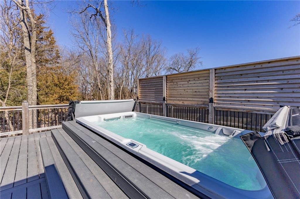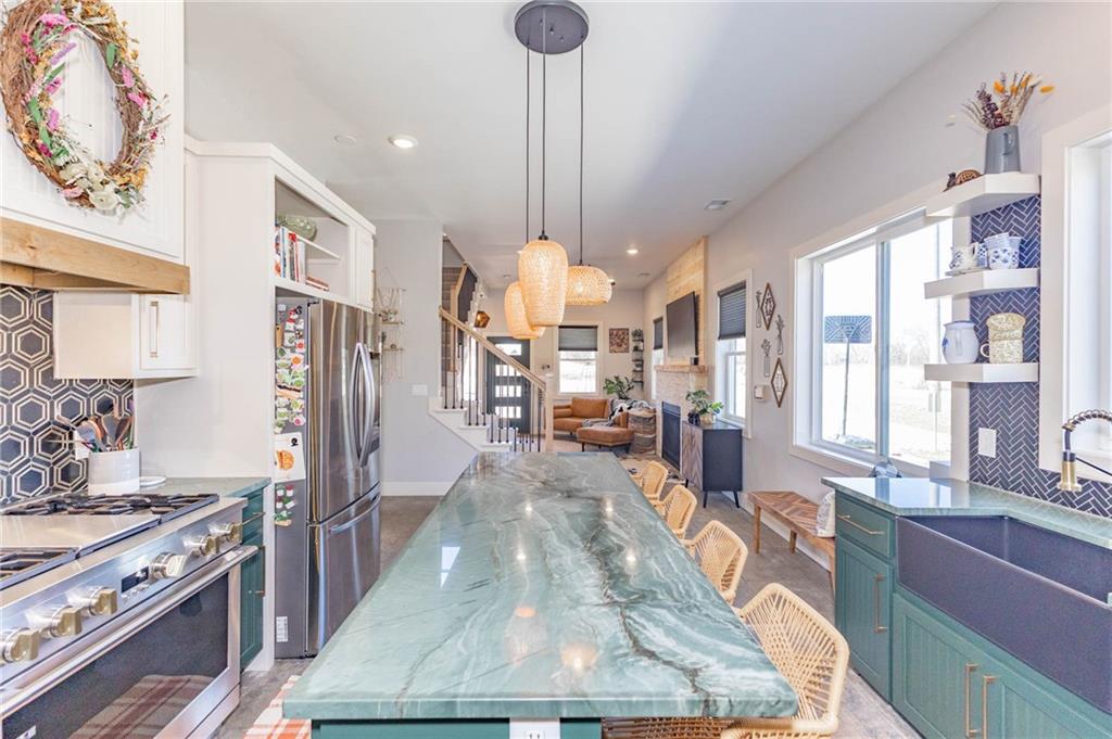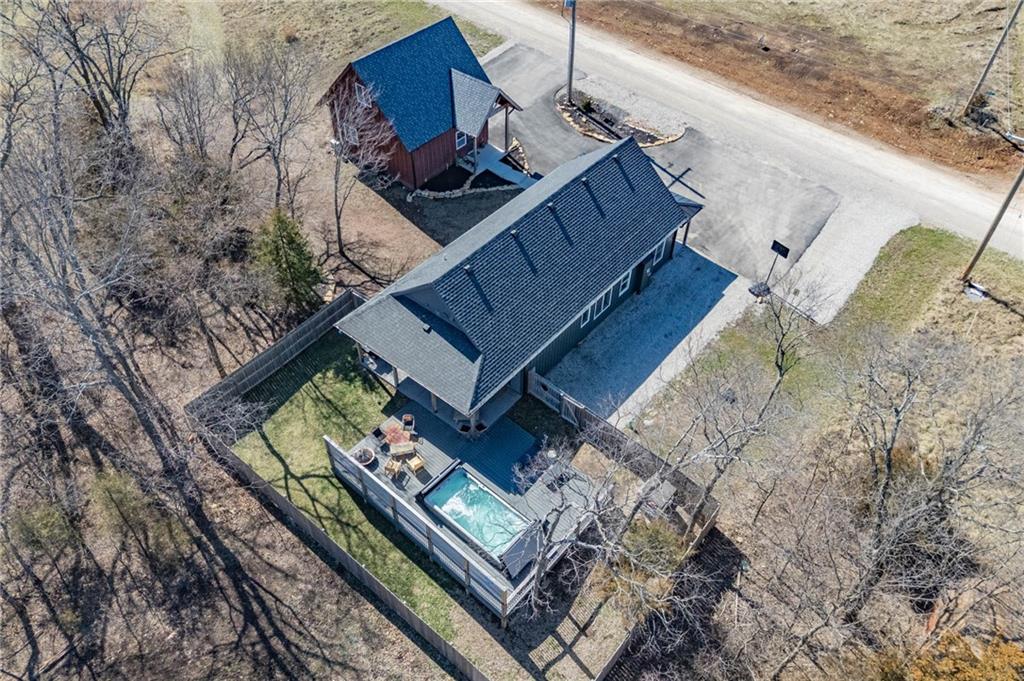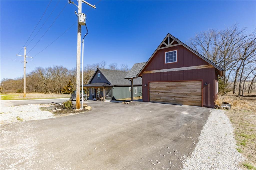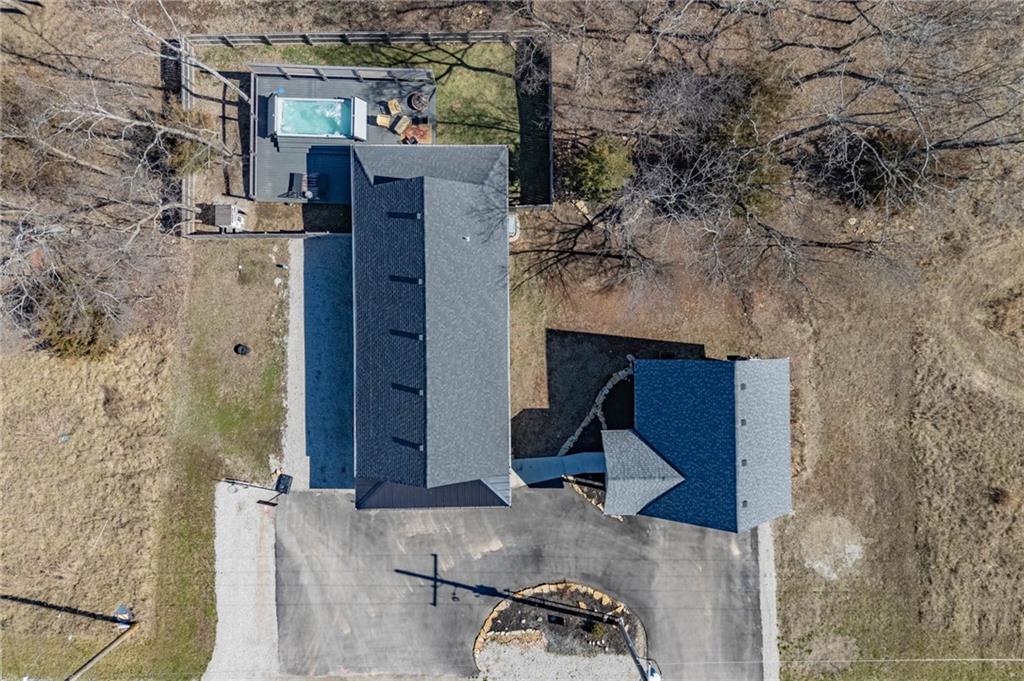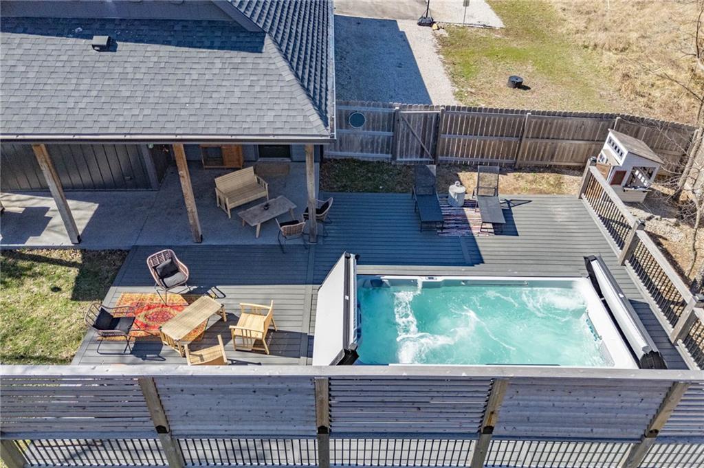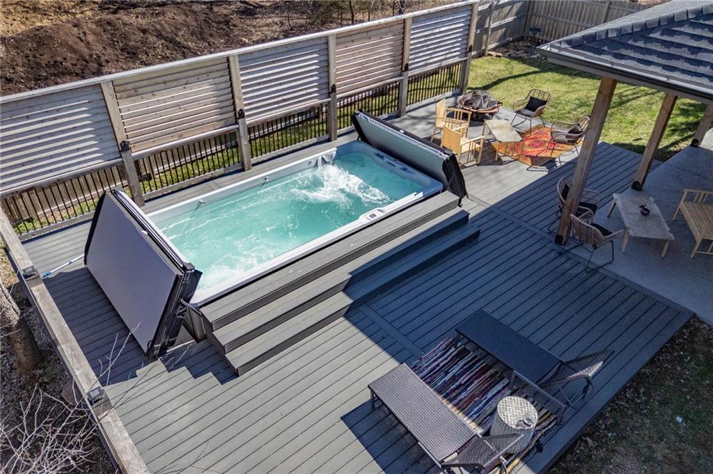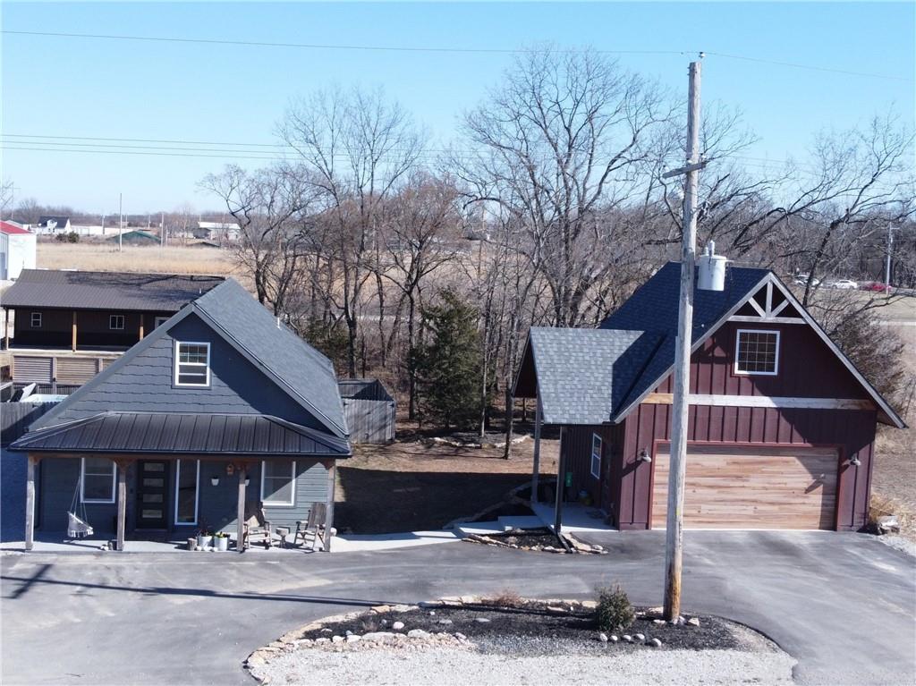 This is truly a custom home, located within the gated community of Linn Valley Lakes. Nothing about this home is builder grade including design, quality, features, or style. Enter the home and you are treated to a beautiful gas fireplace with a stone face, concrete floors, and designer fixtures. 10 ft ceilings provide the open look and feel throughout the entire main level. The chef's kitchen includes high-end stainless-steel appliances, a gas stove, custom cabinets with brass handles and stunning green quartzite countertops. The quartzite is heat resistant has the look of marble, yet it is easier to maintain. Four can sit at the island, but there is room for a small table if you wish. The backsplash is black subway tile laid in a herringbone pattern on one side and a beautiful gold and black hexagon pattern on the other. As you leave the kitchen and head to the back door, there is a large pantry, a laundry room, and a mudroom. Get ready to feel pampered in the primary suite. The large bedroom has a feature wall and lots of natural light. The primary bath includes a quartzite vanity with double sinks and beautiful brass lighting. The shower is a work of art with 4 different tiles that blend to create something beautiful. A bidet? You bet! The main bath and the second bedroom are also on the main floor. Going up the stairs, you have gray carpeting and white wood trim with black iron balusters. The 3rd bedroom is a loft, and it has a walk-in closet. The fully fenced backyard has a resort feel with over 200 sq feet of covered porch and then decking extending out to the large swim spa. The jets can create a water flow for swimming, and it feels more like a pool than a spa. The detached garage has a bonus room upstairs that is heated and cooled by a mini split and makes a great office, craft room or simply a get-away space for kids (or adults). It would be impossible to re-create this home for the list price, so make plans to see this special home soon!
