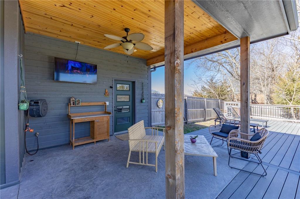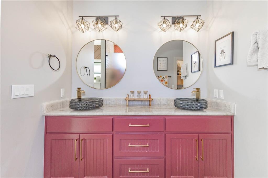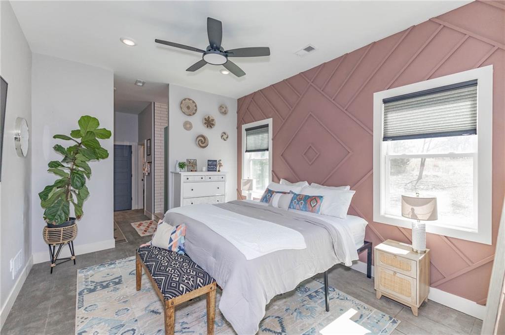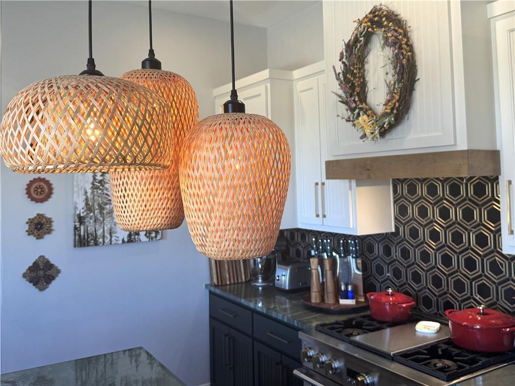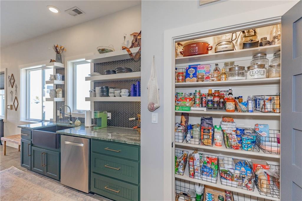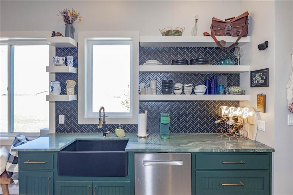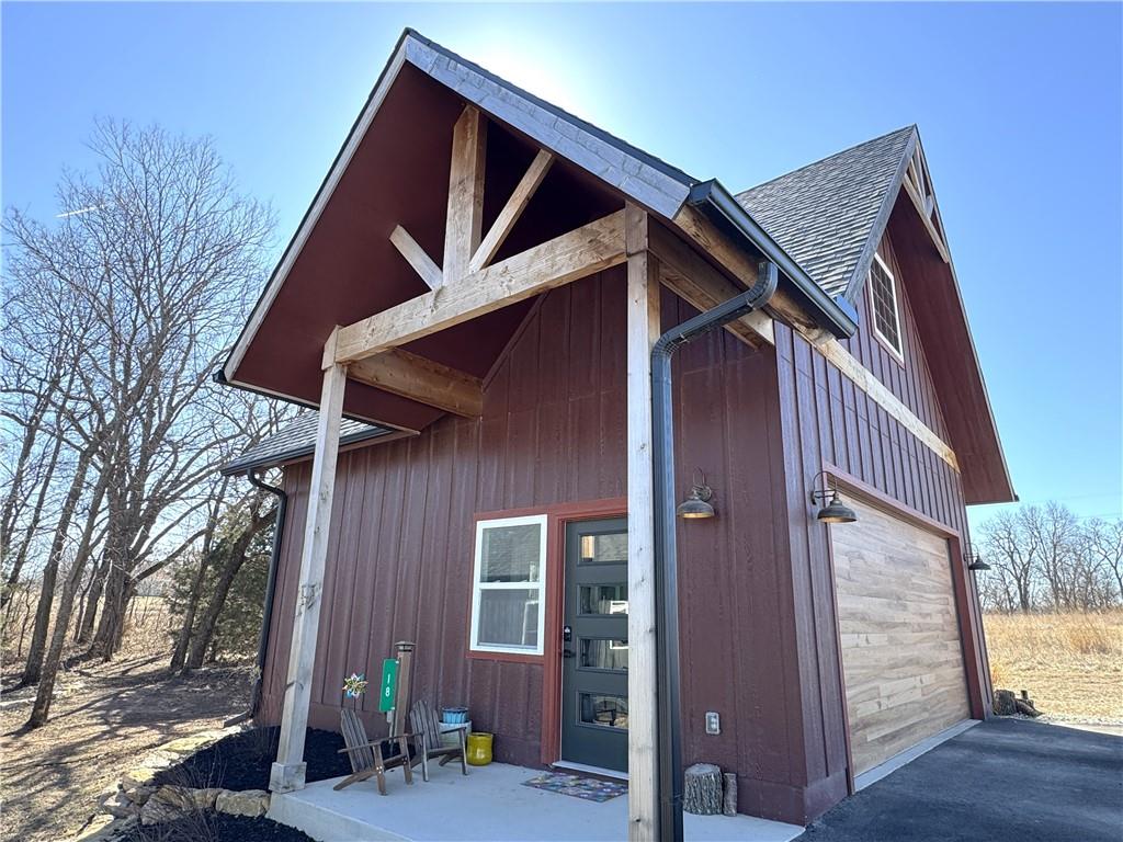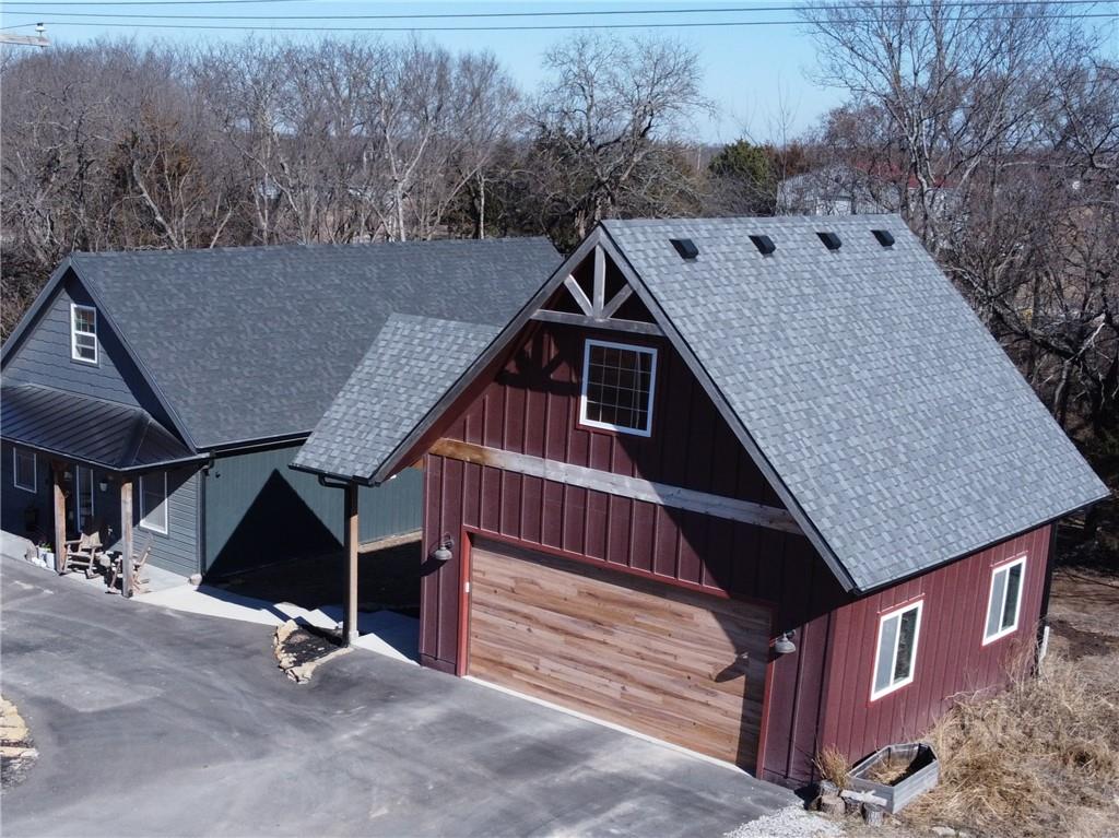 This is truly a custom home, located within the gated community of Linn Valley Lakes. Nothing about this home is builder grade including design, quality, features, or style. Enter the home and you are treated to a beautiful gas fireplace with a stone face, concrete floors, and designer fixtures. 10 ft ceilings provide the open look and feel throughout the entire main level. The chef's kitchen includes high-end stainless-steel appliances, a gas stove, custom cabinets with brass handles and stunning green quartzite countertops. The quartzite is heat resistant has the look of marble, yet it is easier to maintain. Four can sit at the island, but there is room for a small table if you wish. The backsplash is black subway tile laid in a herringbone pattern on one side and a beautiful gold and black hexagon pattern on the other. As you leave the kitchen and head to the back door, there is a large pantry, a laundry room, and a mudroom. Get ready to feel pampered in the primary suite. The large bedroom has a feature wall and lots of natural light. The primary bath includes a quartzite vanity with double sinks and beautiful brass lighting. The shower is a work of art with 4 different tiles that blend to create something beautiful. A bidet? You bet! The main bath and the second bedroom are also on the main floor. Going up the stairs, you have gray carpeting and white wood trim with black iron balusters. The 3rd bedroom is a loft, and it has a walk-in closet. The fully fenced backyard has a resort feel with over 200 sq feet of covered porch and then decking extending out to the large swim spa. The jets can create a water flow for swimming, and it feels more like a pool than a spa. The detached garage has a bonus room upstairs that is heated and cooled by a mini split and makes a great office, craft room or simply a get-away space for kids (or adults). It would be impossible to re-create this home for the list price, so make plans to see this special home soon!