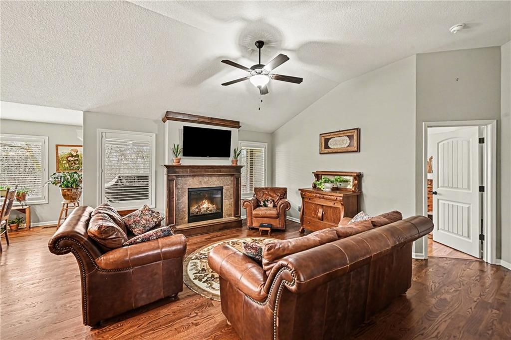 Located in the desirable Greyhawke neighborhood within Smithville School District, this home offers an ideal location just minutes from Smithville Lake, walking trails, a dog park, and a nearby golf course. Upon entering, you are welcomed by vaulted ceilings and beautiful wood floors that continue throughout the main living spaces, along with plantation shutters throughout the home. The open concept living room flows seamlessly into the kitchen and dining area and features large windows and a cozy gas fireplace. The kitchen offers a walk in pantry, stainless steel appliances, and warm wood finishes that complement the space. The primary bedroom includes vaulted ceilings, large windows, and private access to the screened in porch. The ensuite bathroom features dual sinks, a soaking tub, a separate shower, and a spacious walk in closet with direct access to the laundry room for added convenience. Two additional bedrooms and a full bathroom complete the main level along with a three car garage. The lower level provides a large basement ready to be finished and customized to your needs, along with a bedroom and full bathroom. A generous storage area offers plenty of space and includes double exterior doors for easy access. The backyard is fully fenced with black metal fencing and backs to a tree line, providing added privacy. Additional features include French drains and a gas line on the screened in porch, perfect for outdoor grilling and entertaining.
