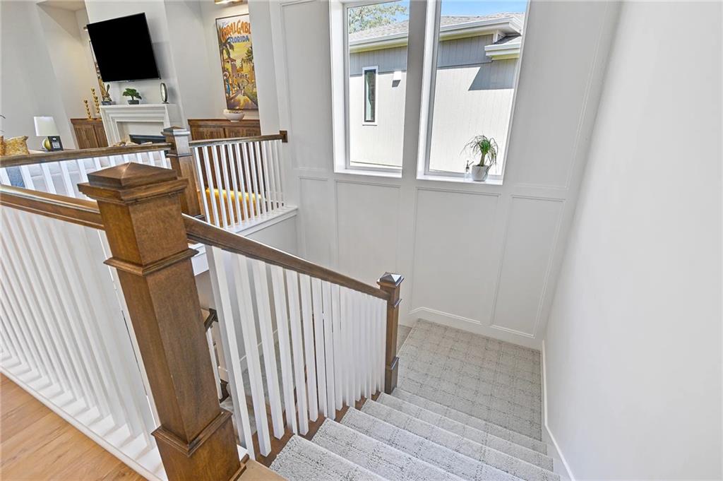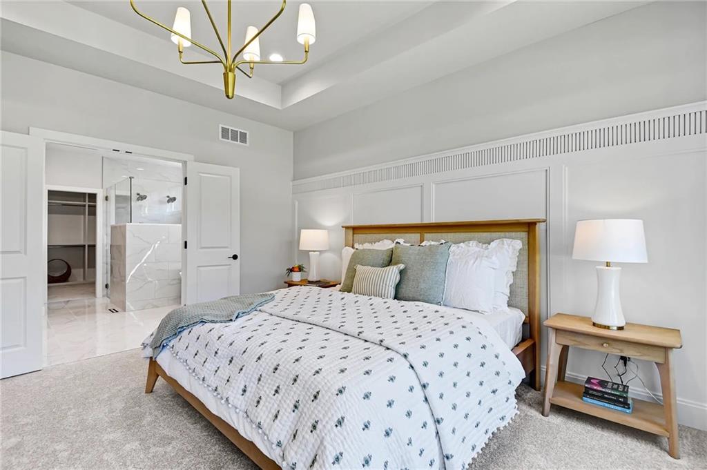 Now under construction in the highly sought-after WaterCrest Landing, The Rosebud—one of Roeser Homes’ most beloved reverse 1.5-story floor plans—offers timeless design paired with modern luxury on a beautiful daylight lot backing to serene greenspace. From the moment you step inside, this home impresses with its open, airy layout, soaring ceilings, walls of windows, elegant arched doorways, and curated designer finishes throughout. The chef-inspired kitchen is a true centerpiece, featuring a spacious island with seating for six, abundant cabinetry, and a generous dining area that comfortably accommodates an eight-person table—perfect for hosting gatherings large and small. The great room invites relaxation with a cozy fireplace flanked by custom built-ins and flows seamlessly onto the covered deck, complete with a second fireplace—an ideal setting for entertaining or quiet evenings enjoying views of the surrounding greenspace. Tucked away for privacy, the main-level primary suite is a peaceful retreat with a spa-like bath, showcasing a freestanding soaking tub, separate shower, and a large walk-in closet that conveniently connects to the laundry room. A second main-level bedroom near a full bath offers flexibility for guests, a home office, or additional living space. The finished lower level is equally impressive, featuring a wide staircase with abundant natural light, a spacious family room with a wet bar, two additional bedrooms, two full baths, and ample storage. Blending thoughtful design, comfort, and scenic surroundings, this exceptional home captures the best of luxury living in one of Lenexa’s premier communities. ***NOTE THE PHOTOS ARE FROM ANOTHER SIMILAR MODEL***