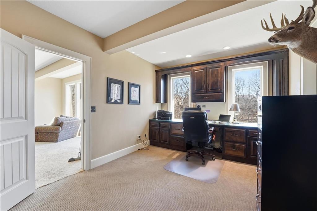 Nestled on a quiet cul-de-sac in the highly sought-after Thousand Oaks subdivision, this beautiful 1.5-story home offers space, style, and functionality. The main level boasts gorgeous dark wood floors, a spacious kitchen with a large island, touchless faucet, trash compactor, and soft-close cabinets, plus a convenient first-floor laundry room and a private home office. Retreat to the main-level master suite featuring ample space and comfort. The finished walk out lower level is perfect for entertaining, complete with a second home office, wet bar with seating and built in's and and incredible amount of storage throughout. Additional highlights include a suspended garage, screened-in porch off the kitchen, and a dog kennel accessible from the rec room. With 4 bedrooms, 4.5 baths, and thoughtful design at every turn, this home combines modern convenience with timeless charm—truly a must-see!