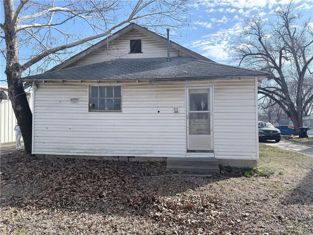 Back of property with a shingled roof and entry steps