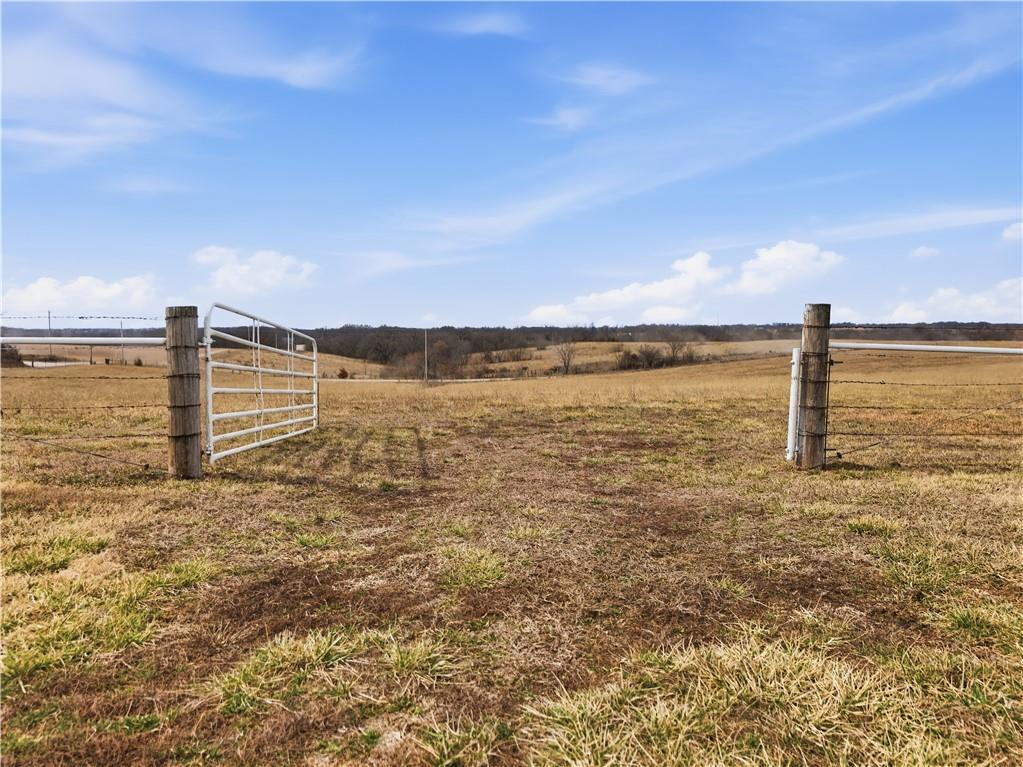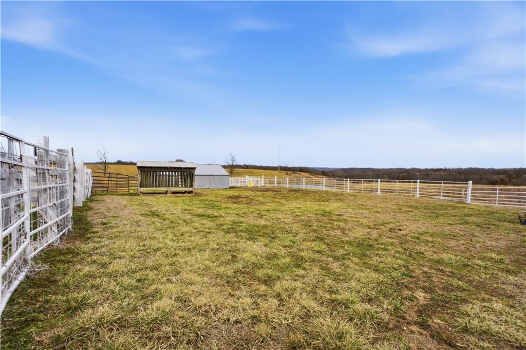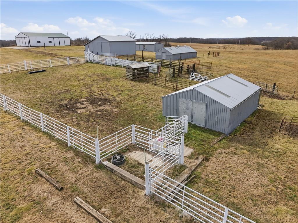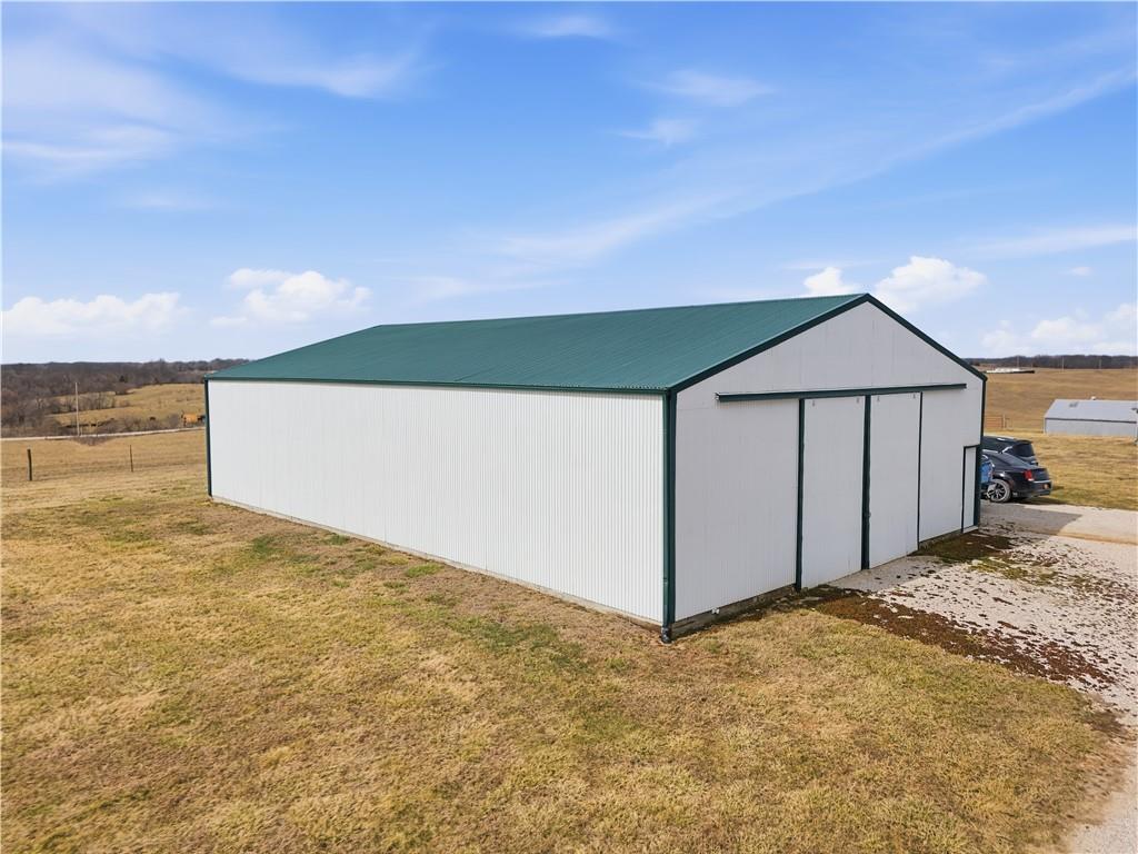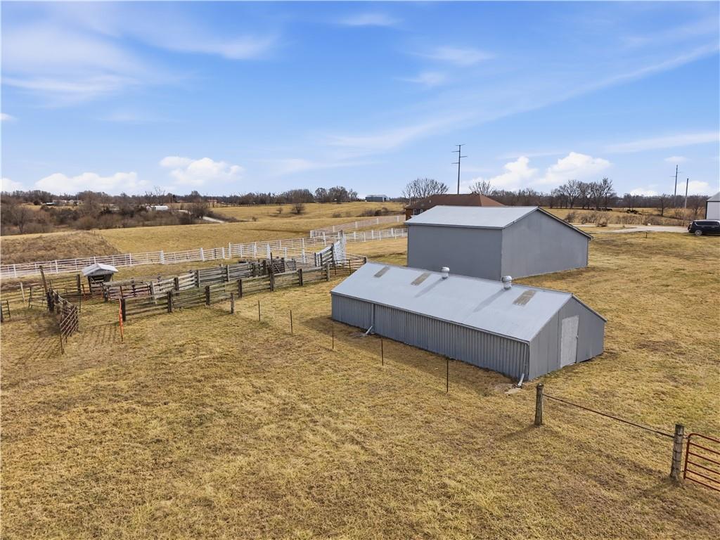 Beautifully maintained ranch home on 19+/- rolling acres featuring 2 main level bedrooms plus 3 non-conforming bedrooms in a fully finished walkout basement complete with a large second kitchen and spacious living room. Meticulously prepped for your comfort and located just 25 minutes from Kansas City, this property delivers the perfect mix of comfort, function, and wide open space. As you drive up, scenic views unfold across your land, buildings, fencing, and stocked pond. The large covered front porch is made for conversations that turn into lasting memories. The main level offers an open concept layout filled with natural light. The kitchen has northern exposure to the property, while the living room features large south-facing windows. Two oversized bedrooms sit on the main floor, including a spacious primary suite with private bath and pond views. A full hallway bath adds convenience. The kitchen includes granite countertops and space for a full size dining table. The walkout basement expands the living space with three additional non-conforming bedrooms and direct outdoor access, ideal for multi-generational living, guests, or entertaining. Formerly a cattle farm, the property is well suited for horses and includes recently painted fencing and gates, refreshed barns, and five total outbuildings. The 40x60 shop with concrete floors and power offers serious workspace. Fencing supports multiple farm animals, including that sought after Highland cow. An additional acreage directly north is available to expand your farm life even more. In the spring, the land comes alive with lush grass and vibrant views. Peaceful country living with city access within minutes. Well cared for. Move in ready. Built for lifestyle and legacy.