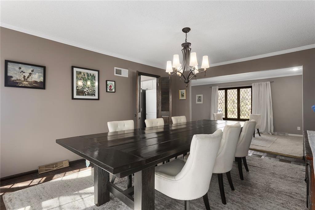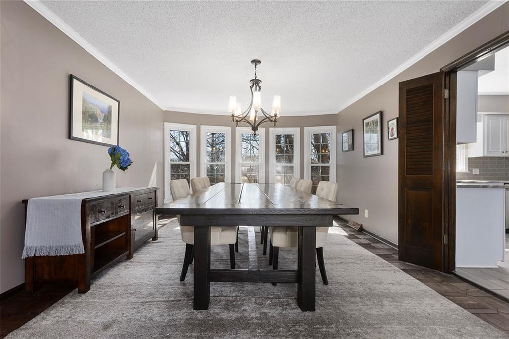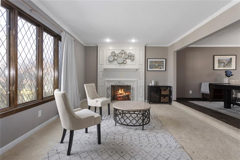 Charming Tudor with classic character and functional living spaces. Formal Living Room features a dramatic fireplace, abundant natural light, and crown molding. Spacious Formal Dining Room flows from the kitchen — ideal for entertaining. Hearth Room with brick fireplace and built-ins opens to a large deck overlooking the fully fenced yard. Luxury Primary Suite includes fireplace, double vanity, and generous storage. Finished walk-out basement offers a wet bar, fourth fireplace, and half bath. Located on a cul-de-sac in the coveted Staley/NKC School District in a market where homes in this region continue to hold value and see modest appreciation.