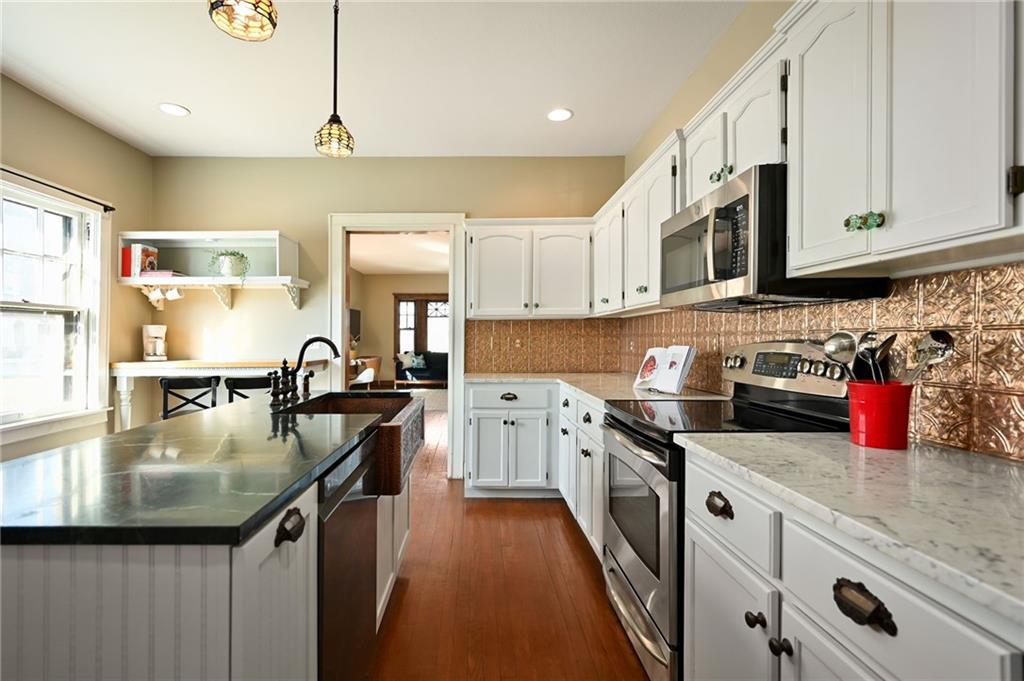 A rare opportunity in historic Hyde Park, this charming home offers 5 bedrooms and 3.5 bathrooms with timeless character and thoughtful updates throughout. Built with classic Missouri limestone shirtwaist construction, the home showcases beautifully preserved original woodwork and windows that highlight its historic craftsmanship. The main floor features two spacious living areas, including one with a cozy fireplace, along with a dining room that flows into a large kitchen complete with marble countertops and an island. A convenient main-floor primary suite with a recently renovated bathroom provides flexible living options. Upstairs, the second floor offers three generously sized bedrooms and a full bath, while the third floor boasts a massive private primary suite with a beautifully updated bathroom. Outside, enjoy the craftsman-style front porch perched high in the neighborhood—perfect for taking in stunning sunset views. A private driveway with a two-car garage adds rare convenience for the area. Ideally located just a short walk to Martini Corner, the Streetcar line, and all the vibrant amenities of Midtown living.