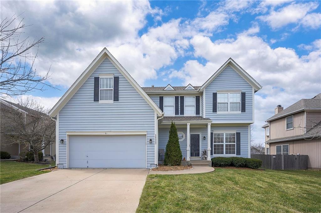 Fantastic 2-story home in a prime Olathe location, tucked away on a cul-de-sac street. Light, bright, and airy throughout with wall of windows. Front room offers flexible space for a home office, formal dining, or additional living area. You'll love the spacious family room featuring a fireplace and built-in bookshelves that flows seamlessly into the kitchen with large island, walk-in pantry, plus main level half bath. Upstairs, you’ll find a generous primary suite with an updated shower, double vanities, soaker tub, and a large walk-in closet. Two additional bedrooms, a full hall bath, and convenient bedroom-level laundry complete the second floor. The unfinished basement offers excellent storage or future finish potential. Enjoy the level backyard, 2-car garage, and fresh updates including new carpet on the main level and stairs. Olathe schools and move-in ready! OFFER DEADLINE: 10:00 a.m. Saturday, 3/28.