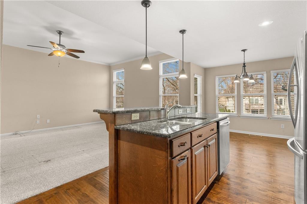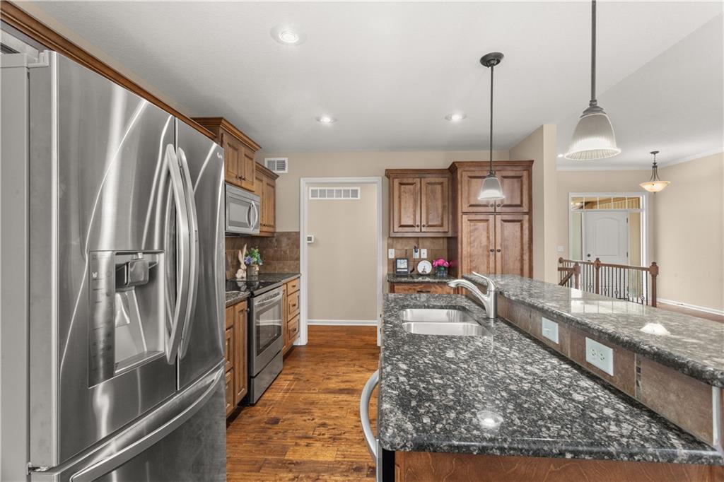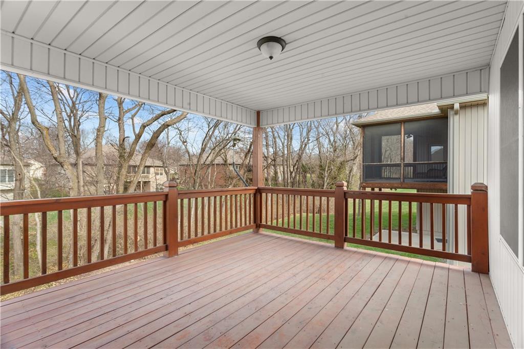 This is a beautiful home in Drumm Farm Villas with a partially wooded lot. Well-designed open floorplan with upgraded cabinets, stainless steel appliances and kitchen/dining combo. All bedrooms are conveniently located on the main level. The primary bedroom sits privately on one side with large closet, double sinks, updated shower and jetted tub. High quality hardwood flooring in the dining room, kitchen, entry way and hallway. Large laundry room on main and bedroom level. Mudroom off garage entrance. Energy-efficient upgrades include Low-E Argon double-hung windows, 1" form-fitting Styrofoam insulation under the siding, 1/2" ThermalStar insulation in the sidewalls, 4" exterior walls wrapped in Tyvek, and additional attic insulation. Several interior doorways are wider than standard for improved accessibility. Enjoy the beautiful backyard which is ideal for watching nature and the birds on the covered deck. The unfinished walk-out basement provides excellent storage or potential for future expansion. There is a room in the basement with 4 concrete walls that can be used as a storm shelter. Sprinkler system. HOA covers lawn maintenance, trash and snow removal for low-maintenance living. This is a home that has been meticulously cared for and is move-in ready.