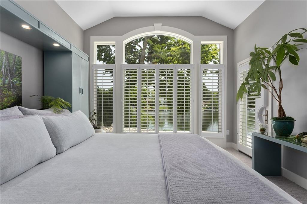 Tucked away on one of the most coveted lakefront lots in the Northland, this one-of-a-kind, custom-built home was thoughtfully designed by an interior designer to take full advantage of its breathtaking views. Nearly every room in this meticulously maintained residence has water views. Step into the grand foyer where soaring columns and faux marble accents set an elegant tone. From there, a second entry welcomes you with a barrel-vaulted, hand-painted ceiling and sweeping lake views that draw you further into the heart of the home. The French country-inspired kitchen is a dream for any entertainer or home chef, featuring a hand-selected marble island, custom cabinetry, a cozy stone fireplace, built-in entertainment center and desk, and an all-glass breakfast room with arched windows overlooking the lush, landscaped yard with multiple water features. The hearth room flows into a spacious living room with a see-through fireplace, a wall of glass framed with plantation shutters. The primary suite is a peaceful retreat with patio access, high ceilings, custom built-ins, upgraded carpet, and plantation shutters. The ensuite bath offers a spa-like experience with a dome ceiling over the soaking tub, walk-in shower, and dual vanities. A second bedroom also has direct patio access and features elegant travertine floors. Recently added second living quarters include a full gourmet kitchen, living area with built-ins, breakfast nook, second master suite with luxurious bath, large walk-in closet, and even a second laundry room—perfect for guests, in-laws, an adult child, or anyone looking for privacy and independence. The space also features its own private entrance. Additional highlights include a spacious three-car garage with high-end epoxy floors, a private dock with a pontoon boat included, full irrigation system, expansive patio and deck spanning the length of the home, and professional landscaping throughout. This is more than just a home—it's a lifestyle.