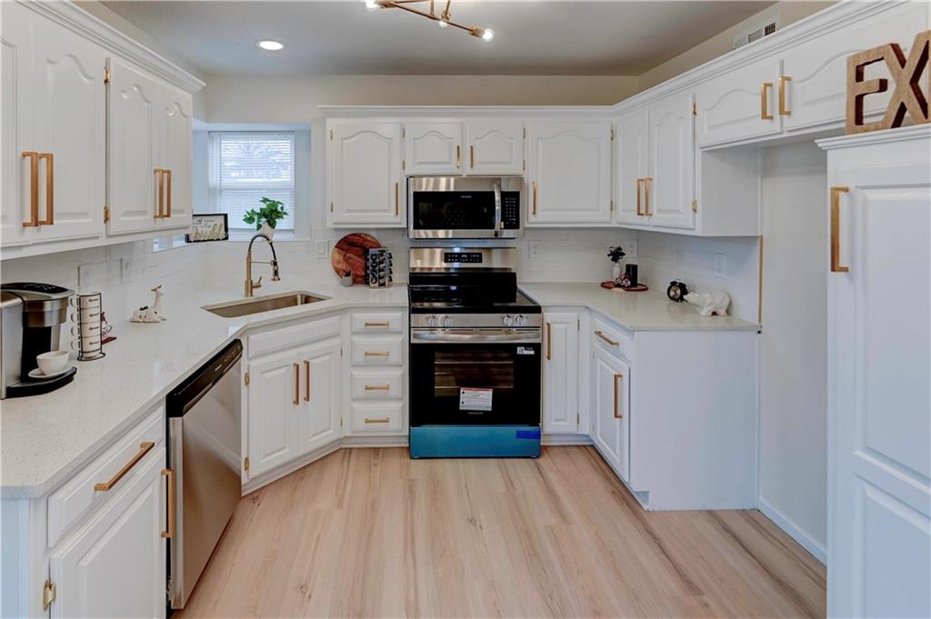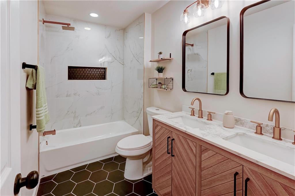 Stop the Car! Totally Renovated & Ready to Impress - A Modern Masterpiece awaits! This isn't just a house; it's a lifestyle statement. From the moment you pull up to the striking exterior with its bold red door, you'll know this home is something special. Inside, prepare to be wowed by an open-concept sanctuary where every detail has been curated for contemporary luxury. The gourmet kitchen is a true centerpiece, featuring a massive quartz island, custom white cabinetry with trendy gold hardware, and a sleek tile backsplash. Flowing effortlessly into the living area, you'll find soaring ceilings, a designer ceiling fan, and a magnificent floor-to-ceiling modern fireplace with a beautiful starburst accent. Retreat to the primary suite, which offers a stunning bath experience: think opulent marble-style tile, a frameless glass rainfall shower with black and gold fixtures, and a custom double vanity. The second finished level is an entertainer's dream, complete with a fabulous wet bar featuring a chic geometric tile wall, more sleek quartz counters, and a unique display niche. Additional highlights include: Designer fixtures and lighting throughout. Two distinct finished levels offering flexible living spaces. A spacious 2-car garage with updated openers. A newly enhanced, private backyard with vibrant green grass. Large rooms with walk-in closets. With all-new finishes and incredible attention to detail, this home is better than new. Don't wait—this one will be gone in a flash! Schedule your showing today!