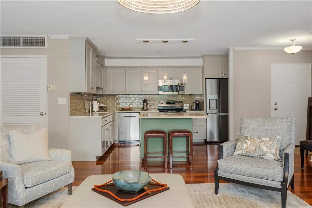 Absolutely stunning South facing unit offers open fl plan with beautiful cherry floors. well-designed open kitchen with quartz countertops, center island and stainless appliances, under cabinet lighting and electric outlets for sleek backsplash, Walk in pantry, cabinet roll outs, soft close drawers, windows & sliding door leads to large treed balcony with Hunter Douglas blinds to allow light and privacy. beautiful built in's living rm, french doors from liv to bedroom/dining room w/enormous wall of closets, walk-in closet in primary bedroom, large walk-in shower in primary bath,. Laundry room, party room and exercise room in common areas. leisurely walk to Plaza, Loose Park, entertainment, restaurants and more. **BEST PRICE PER SQUARE FOOT ON THE PLAZA. HOA TOTAL OF $1928 INCLUDES ALL PROPERTY TAXES, WATER, HEAT AND A/C!!! AS WELL AS THE IN DOOR HEATED $100 PARKING FEE **