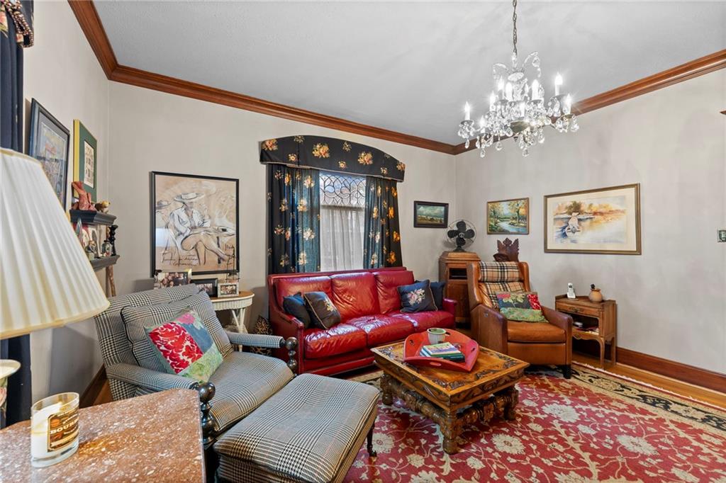 Expect to be impressed as you step into the timeless elegance of the "Washburn" house, a rare residence that masterfully blends old-world charm with sophisticated modern comfort. Meticulously updated while preserving its historic integrity, this home showcases authentic craftsmanship through unique chandeliers, ornate trim, wide crown and baseboard moldings, and original solid wood interior doors. The architectural character shines in the 3 sets of beautiful pocket doors and the lead glass windows that grace the front of the home, while modern peace of mind is provided by newer windows throughout the rest of the house and a central heat and air system installed within the last 5 years. A large, covered front porch invites you into a grand entry room, flanked by an elegant living room featuring an original fireplace and a lovely, sunlit parlor. The gourmet kitchen is a chef's dream, boasting cherry cabinetry, a quartz island, and high-end appliances including a gas stove and a new convection oven with air-frying capabilities. Two butler doors offer seamless flow into the massive formal dining room, perfect for hosting memorable gatherings. The main level features gorgeous hardwood floors and houses 3 spacious bedrooms—including a primary suite —all equipped with walk-in cedar closets and accompanied by 2 full. bathrooms. Upstairs you will find a fourth bedroom, a third bathroom, a cozy den, and a sprawling unfinished area brimming with potential for additional living space. With laundry hookups available on both the main floor and the basement, a detached garage with a finished room above, and a courtyard-style yard ideal for summer barbecues, this property is truly one of a kind. Located within walking distance of the historic Paola square, this home is ready for its next chapter—schedule your private tour today!
