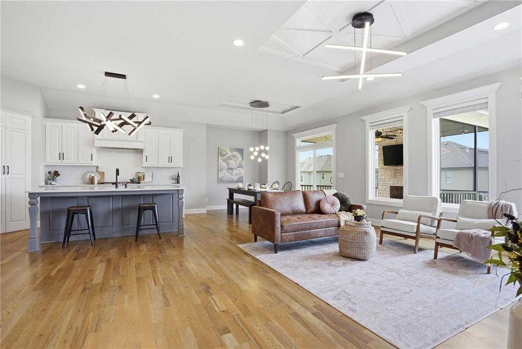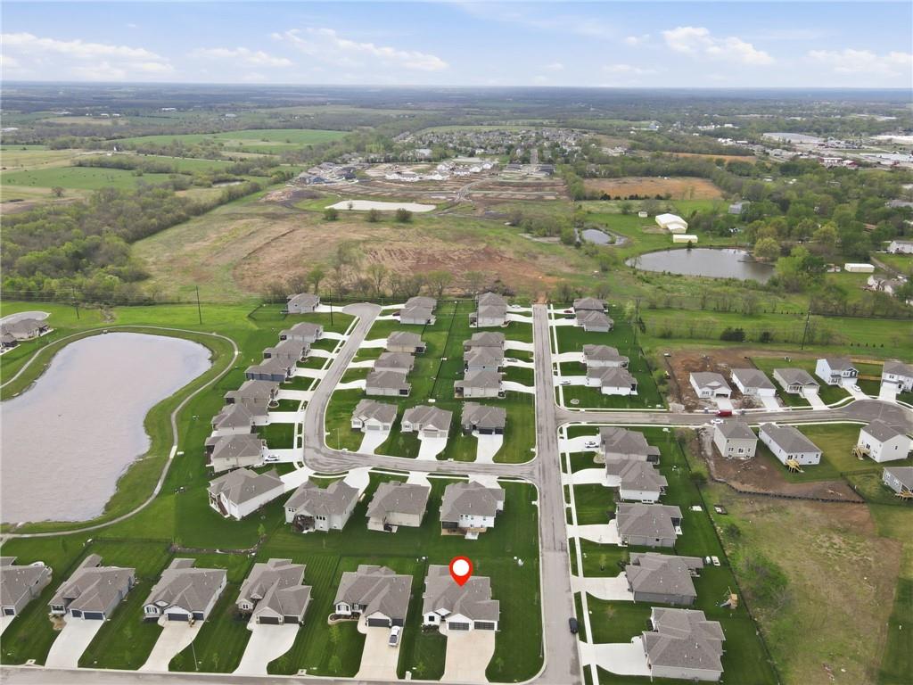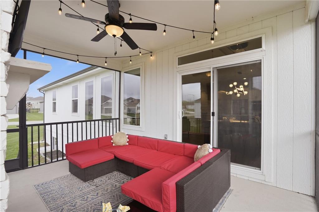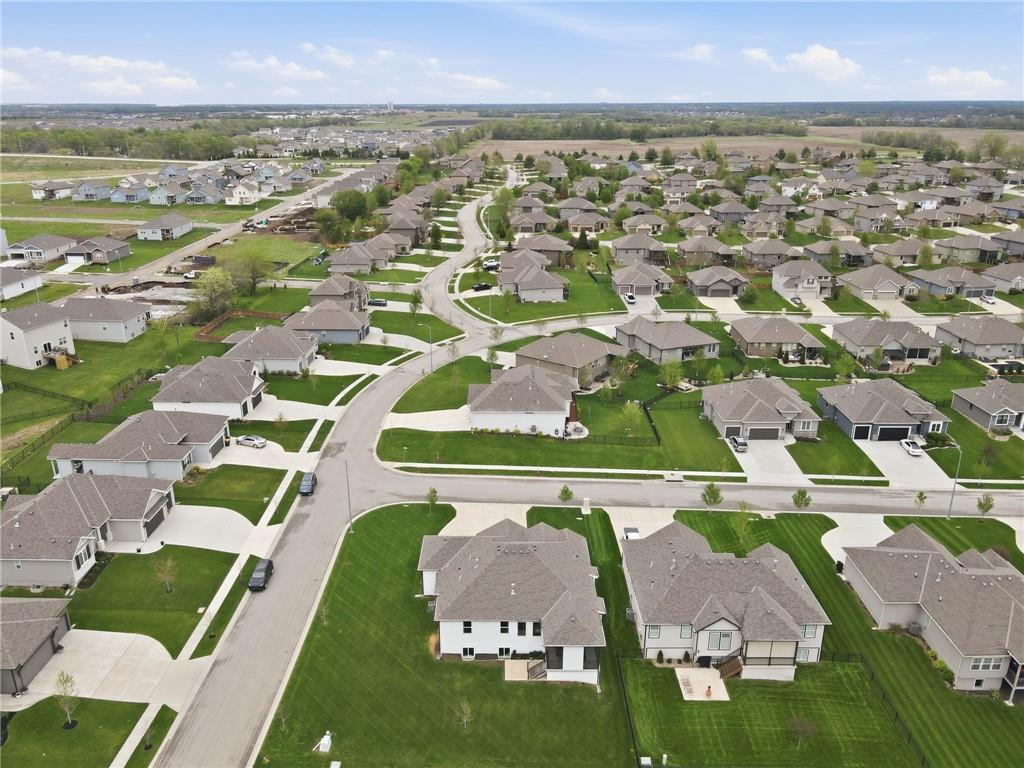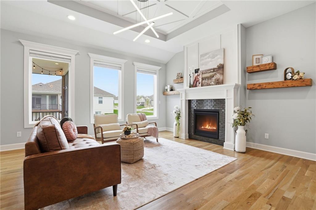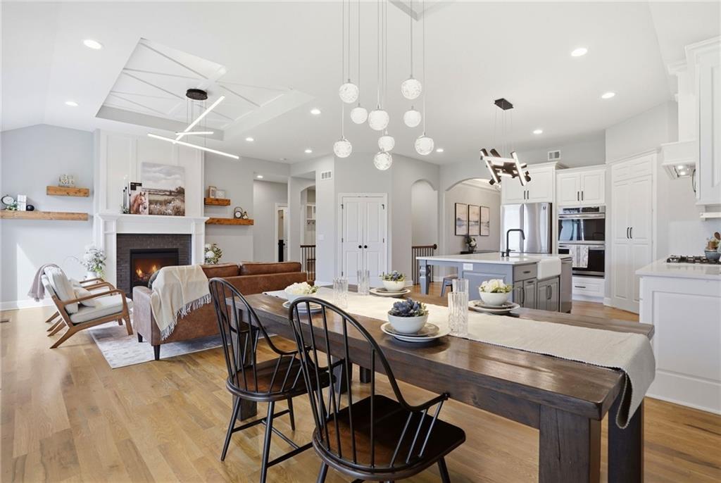Welcome to your next neighborhood! Brookwood Farms is a vibrant, warm, welcoming, and social community with a pool, playground, fishing pond, and walking trails. Welcome to your next home! The home features Main-level Living, Hardwoods, Quartz Countertops Throughout, Upgraded Light Fixures, Ethernet in All Rooms, Hardwired Camera System, Covered-Screened-In Patio with Gas Fireplace, 220v Outlet for EV Charging Station, Built-In Ceiling Speakers in the FOUR-CAR Garage! This home is ideal for the remote worker, tech enthusiast, car collector, hobbyist, growing household, sports &/or outdoor enthusiast, or boat owner (Hillsdale Lake is just 16 minutes!). Inside this reverse 1.5 story home, find a spacious open floor plan designed for comfortable living and entertaining along with 4 bedrooms and 3 full bathrooms; providing plenty of room for you, your family and/or guests. Every detail considered! This home stands out from others with it's first impression curb appeal of the white & black modern farm-house style, to 4 frosted glass panel garage doors, to interior upgraded features that you will love - dramatic barrel-vault entry hall, arched openings, stainless steel double ovens and gas range, farmhouse style sink in large kitchen island, granite counter tops, shiplap feature wall framing the living room fireplace, boxed ceiling in primary bedroom, free-standing soaker tub in ensuite, walk-in shower, modern light fixtures, and soft backlighting throughout. Step outside to take-in sunrise over the neighborhood pond or the sunset as the day winds down, all from the screened-in covered deck with stone fireplace which creates a cozy outdoor living space you can use year-round. A rare combination of functional living space and an exceptional garage/workshop setup that’s increasingly hard to find. This home truly has it all in the fastest growing residential community of Spring Hill, Kansas!