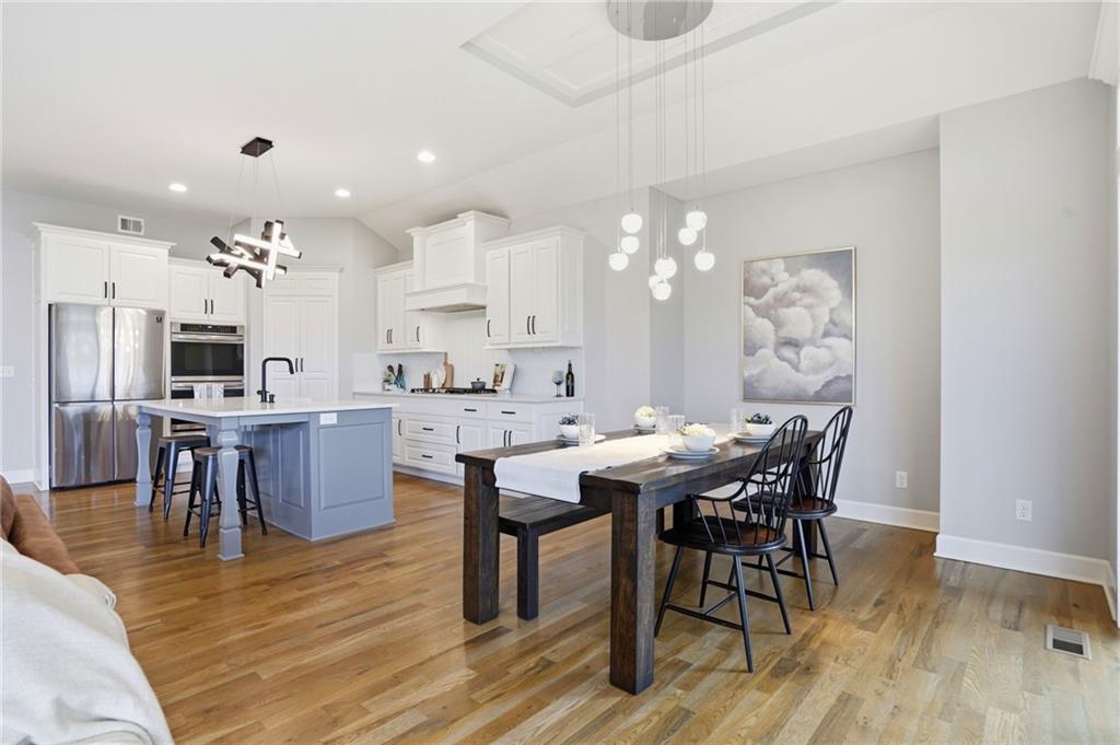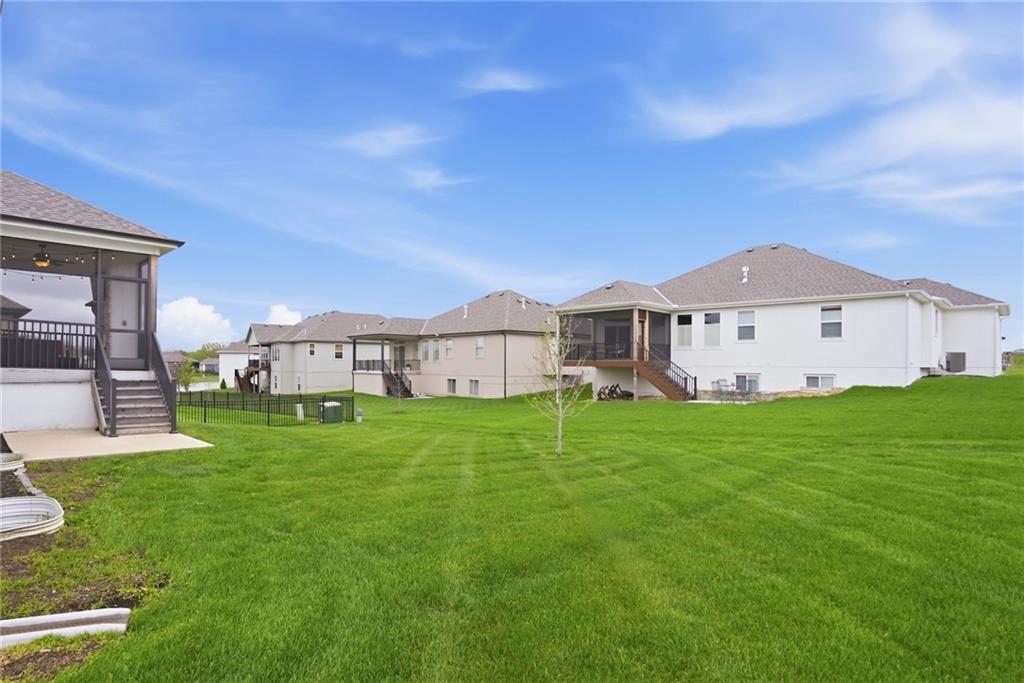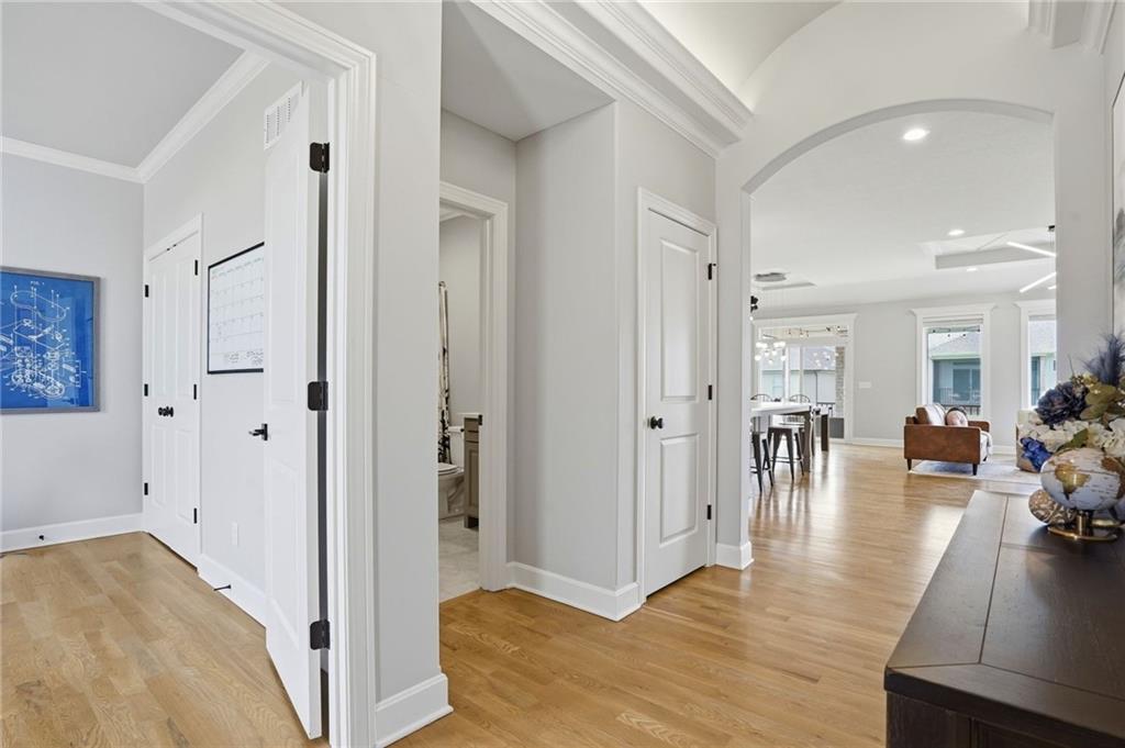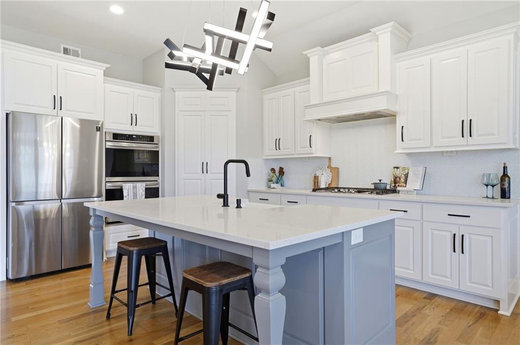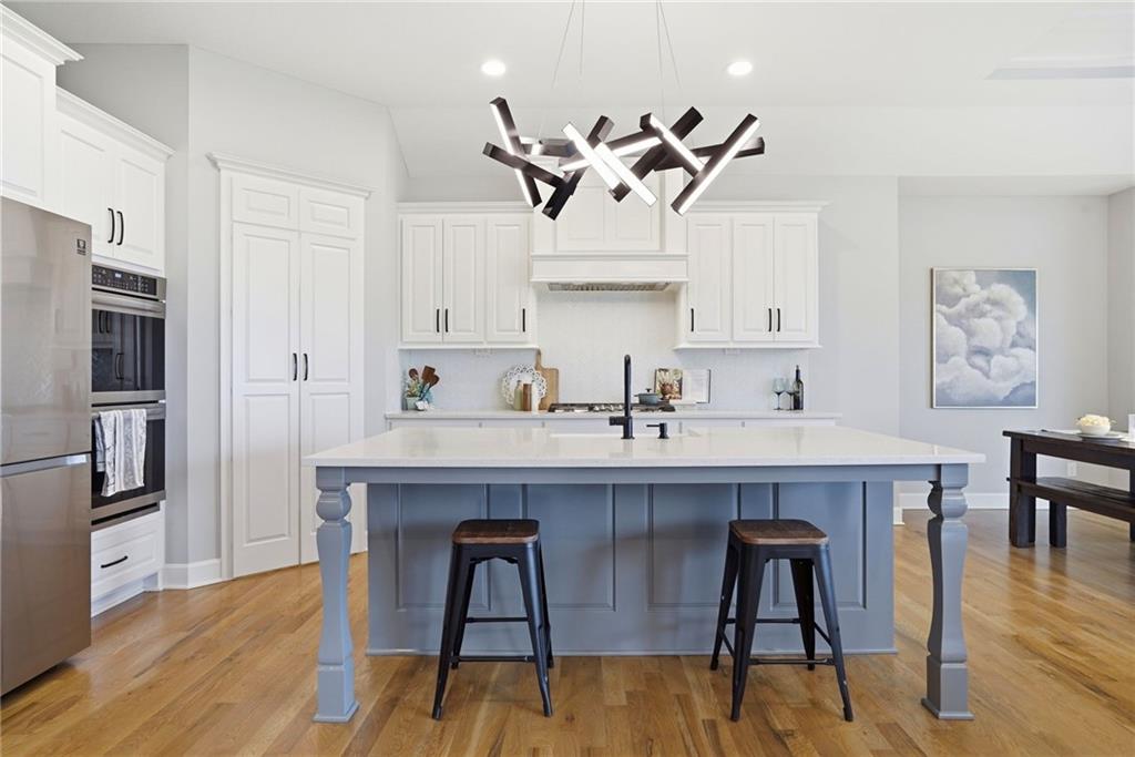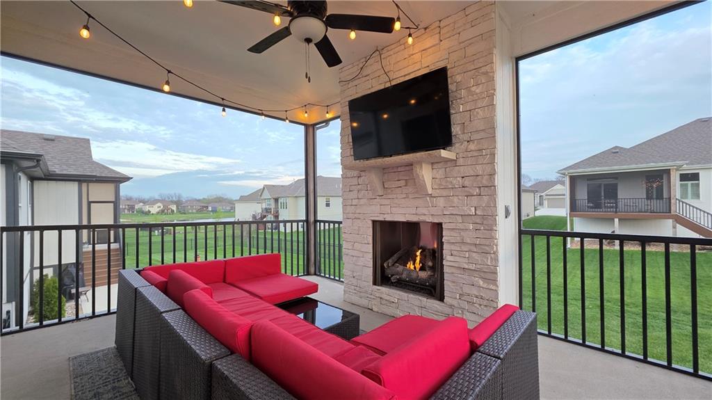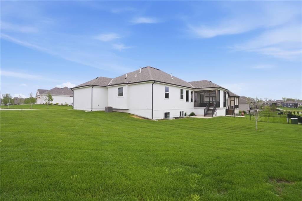 Welcome to your next neighborhood! Brookwood Farms is a vibrant, warm, welcoming, and social community with a pool, playground, fishing pond, and walking trails. Welcome to your next home! The home features Main-level Living, Hardwoods, Quartz Countertops Throughout, Upgraded Light Fixures, Ethernet in All Rooms, Hardwired Camera System, Covered-Screened-In Patio with Gas Fireplace, 220v Outlet for EV Charging Station, Built-In Ceiling Speakers in the FOUR-CAR Garage! This home is ideal for the remote worker, tech enthusiast, car collector, hobbyist, growing household, sports &/or outdoor enthusiast, or boat owner (Hillsdale Lake is just 16 minutes!). Inside this reverse 1.5 story home, find a spacious open floor plan designed for comfortable living and entertaining along with 4 bedrooms and 3 full bathrooms; providing plenty of room for you, your family and/or guests. Every detail considered! This home stands out from others with it's first impression curb appeal of the white & black modern farm-house style, to 4 frosted glass panel garage doors, to interior upgraded features that you will love - dramatic barrel-vault entry hall, arched openings, stainless steel double ovens and gas range, farmhouse style sink in large kitchen island, granite counter tops, shiplap feature wall framing the living room fireplace, boxed ceiling in primary bedroom, free-standing soaker tub in ensuite, walk-in shower, modern light fixtures, and soft backlighting throughout. Step outside to take-in sunrise over the neighborhood pond or the sunset as the day winds down, all from the screened-in covered deck with stone fireplace which creates a cozy outdoor living space you can use year-round. A rare combination of functional living space and an exceptional garage/workshop setup that’s increasingly hard to find. This home truly has it all in the fastest growing residential community of Spring Hill, Kansas!