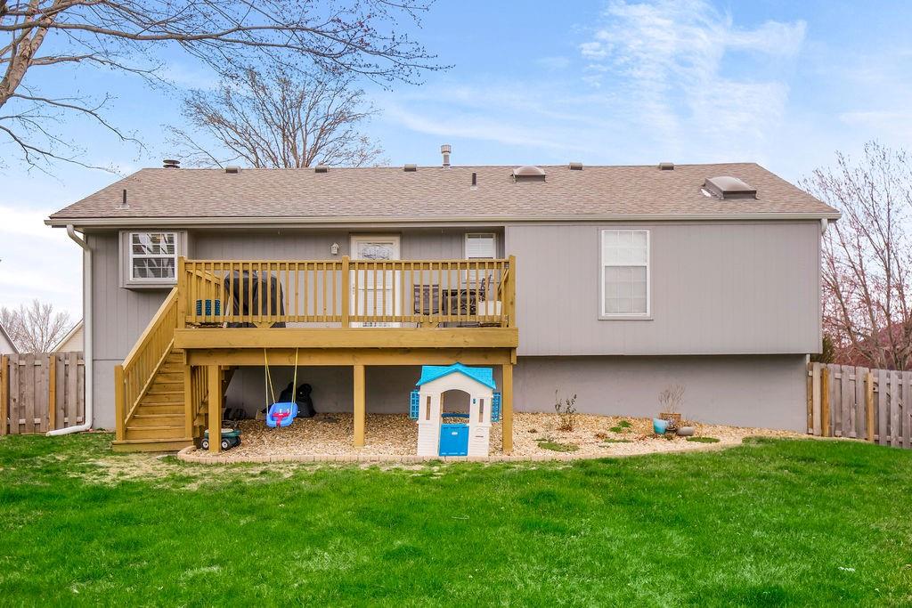 So much to love in this inviting Lee's Summit home! The spacious living room features a cozy fireplace and a stunning vaulted ceiling with a beautiful wood beam accent—perfect for relaxing or entertaining. The kitchen and dining area showcase hardwood floors, abundant cabinetry, and easy access to the back deck—ideal for morning coffee or evening gatherings. The primary suite is a true retreat, offering a vaulted ceiling, skylight, walk-in closet, and a private bath with a walk-in shower. Additional bedrooms are generously sized and include carpet, ceiling fans, and window blinds for comfort and convenience. The hall bath features tile flooring and a shower/tub combination. The finished lower level adds valuable living space with a comfortable family room and a convenient half bath—great for guests or game nights. Step outside to enjoy the deck overlooking a fully fenced backyard, perfect for entertaining, pets, or play. Plus, enjoy peace of mind with a roof that’s only 6 years young! Located in an unbeatable spot just minutes from restaurants, shopping, St. Luke’s Hospital, and with easy highway access—this one checks all the boxes.