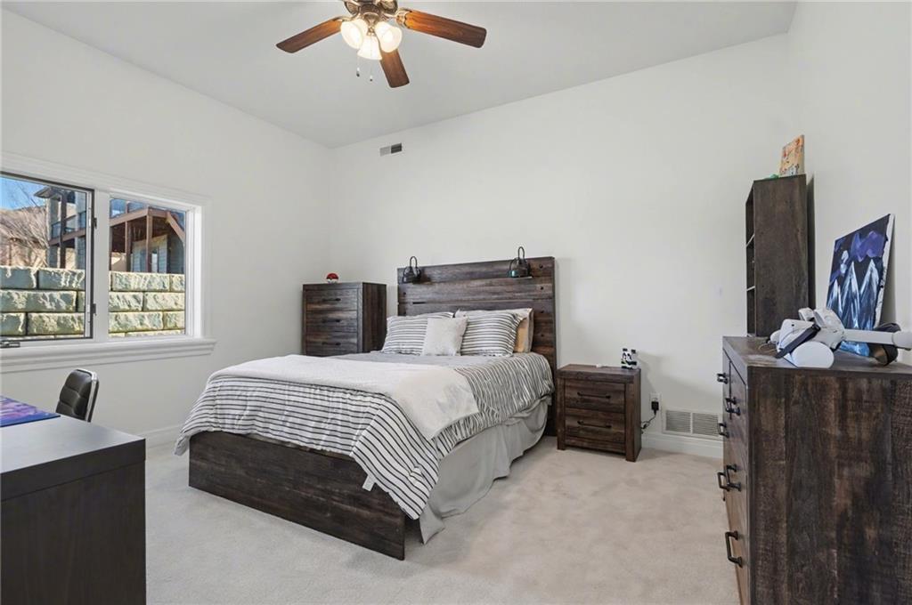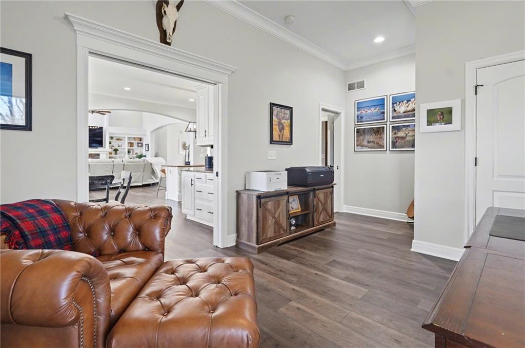 Unique opportunity to own an expertly crafted luxury home located in a quiet neighborhood. Soaring ceilings, high end finishes, 1,380 sq ft of unfinished storage with natural light and windows everywhere. Major expense updating trim & cabinet paint, double HVACs, flooring, lighting, etc. Kitchen has double wall ovens, gas cooktop, a large kitchen island next to a screened in deck overlooking all of the land going down to the lake that the neighbor owns. Formal dining room offers a refined space for entertaining or hosting special holiday gatherings. Guest room on the front and office/3rd bedroom on the back. The full walkout basement has even more living space with 2additional bedrooms and a large second living area. A wet bar complete with a pantry, refrigerator, dishwasher, and microwave perfect for hosting guests or watching movies. Enjoy colorful Kansas sunsets in your back yard with no HOA to answer to.