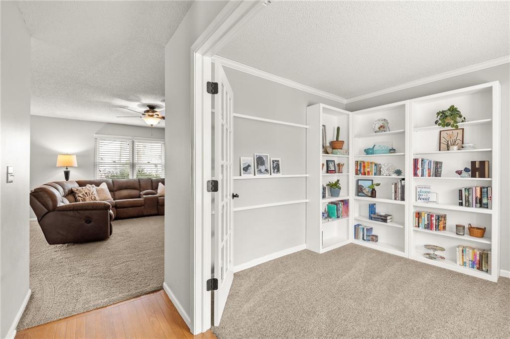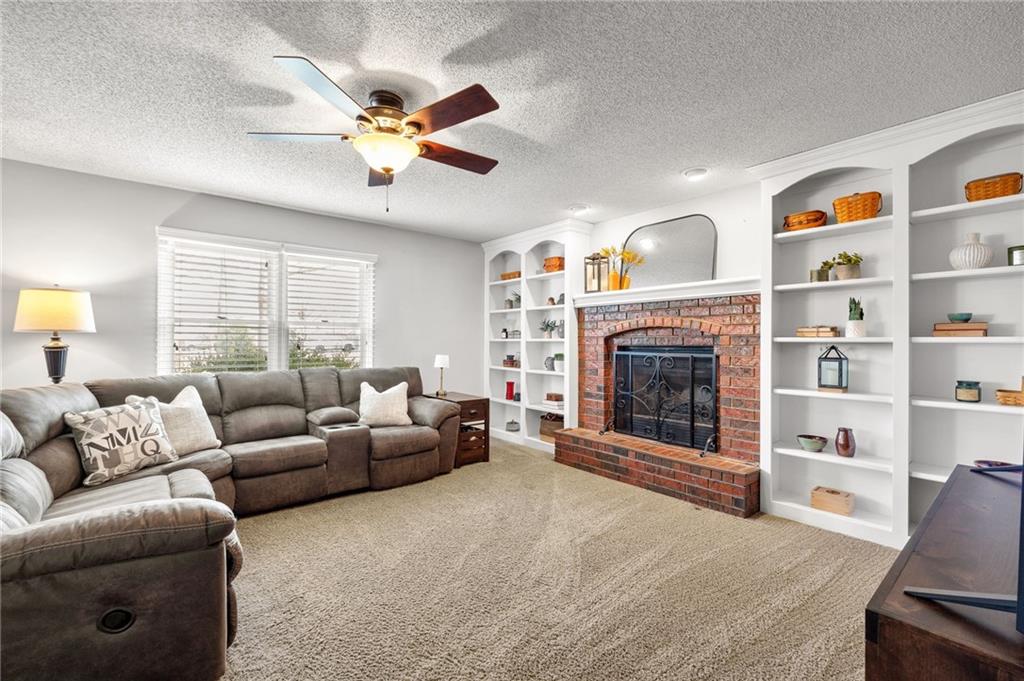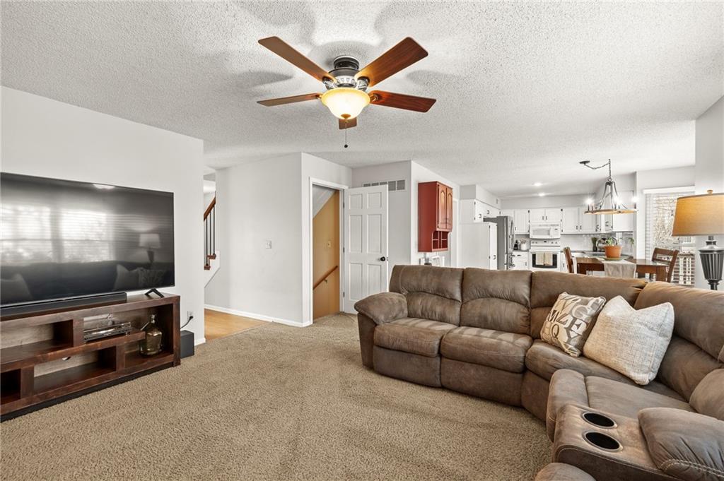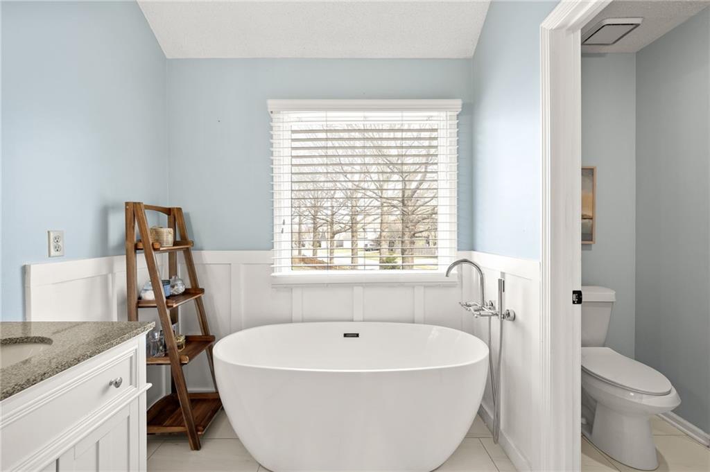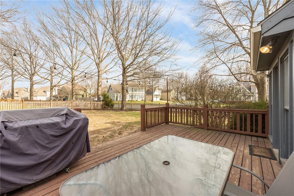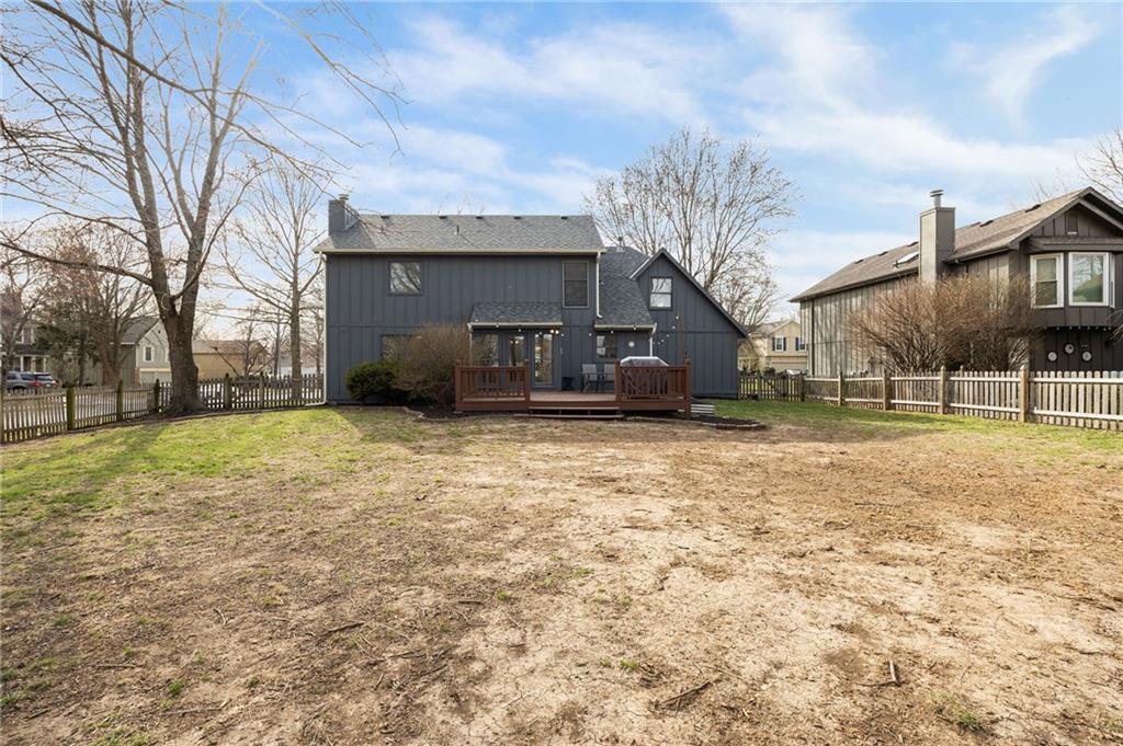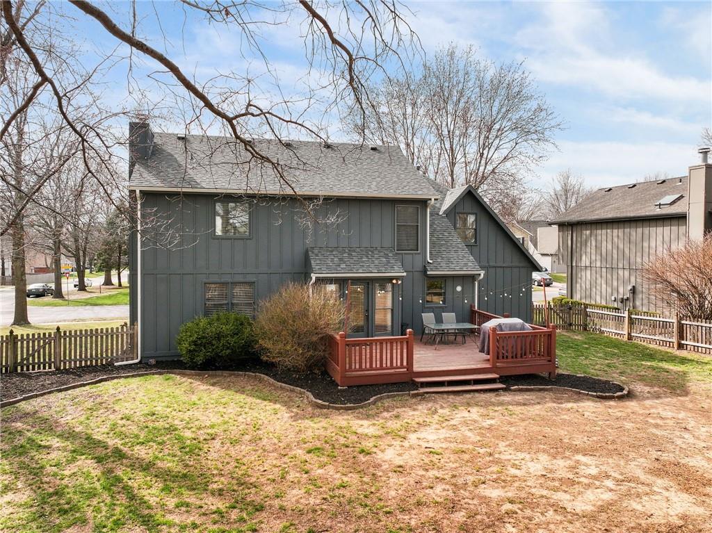 OFFER DEADLINE: SATURDAY, MARCH 28th @ 10:00 AM. Welcome to this beautifully maintained two-story home in the highly sought-after Heatherstone subdivision in Olathe, located within the award-winning Olathe School District. Step through the full glass storm door into a hardwood foyer that sets the tone for the inviting layout. To the right, French doors open to a private office featuring built-in bookshelves and ledge shelving, ideal for working from home. To the left, the formal dining room offers classic charm with a chair rail accent. Just beyond the office, the great room is filled with natural light from a wall of windows overlooking the backyard and features plush carpeting, a masonry fireplace, and white painted built-in bookshelves that create a warm and welcoming focal point. The great room flows seamlessly into the breakfast area and kitchen, both with wood flooring. The breakfast area includes a convenient built-in desk for managing busy family schedules and walks out to an expansive deck overlooking the fenced backyard—perfect for relaxing or entertaining. The adjoining kitchen offers granite countertops, white cabinetry, a pantry, and an undermount black sink with a gooseneck faucet. A laundry and mud room is conveniently located between the kitchen and formal dining room and provides access to the garage. Upstairs, the spacious primary suite features plush carpeting, a vaulted ceiling with ceiling fan, and a beautifully updated ensuite bath with double vanity granite counters, modern soaking tub, tile flooring, and a separate shower with subway tile surround and octagonal tile flooring. Three additional bedrooms, each with carpeting and blinds, share a hall bath with tile flooring and a tiled shower/tub combination. Enjoy a neighborhood surrounded by nature yet just minutes from shopping, dining, and everyday conveniences. Premium living is within reach in this welcoming Olathe community.