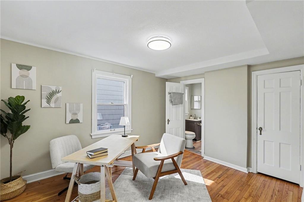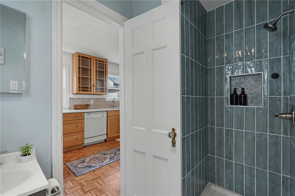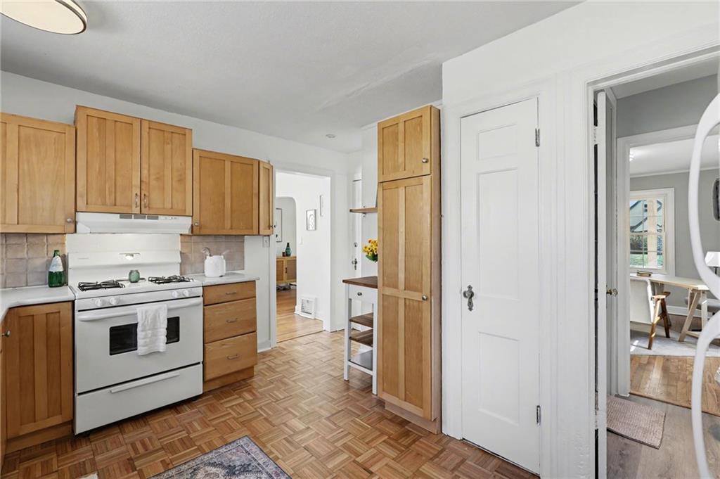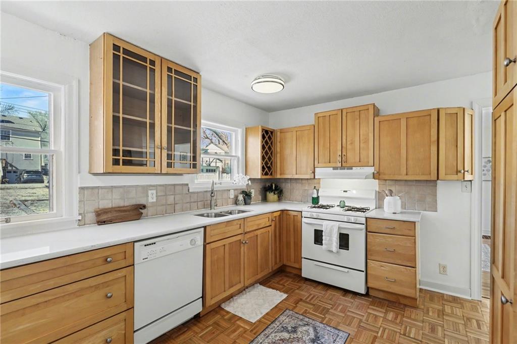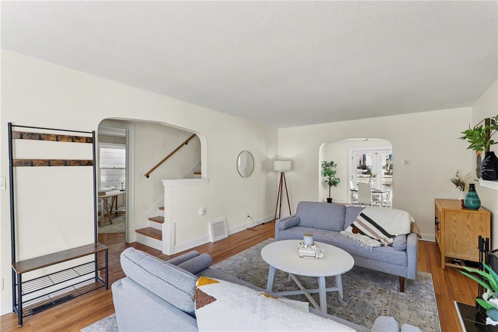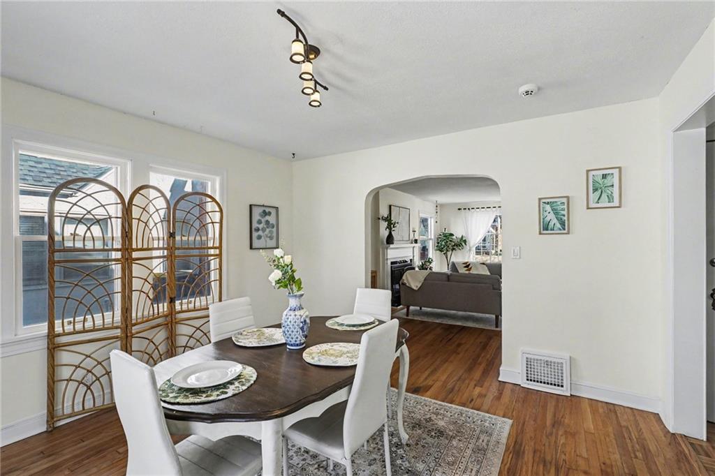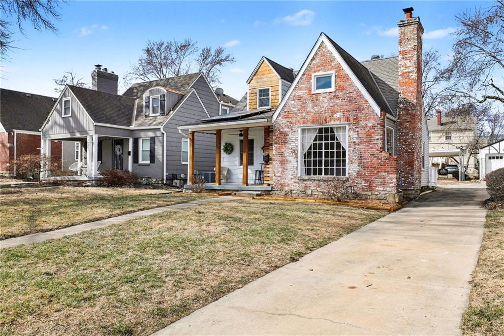 7234 Baltimore St • 1.5-Story Tudor/Traditional • Solar panels • 3BR/2BA • 1,659 SF • Classic 1937 charm meets clean updates in this brick-and-trim Tudor with a covered front porch and dormer details. Inside, the living room features hardwood floors, a large picture window for natural light, and a masonry fireplace. The kitchen offers ample cabinetry, white counters, tile backsplash, dishwasher, and a gas range, with room for a breakfast nook. Two refreshed bathrooms showcase modern fixtures and standout tilework. Main-floor bedroom plus additional bedrooms upstairs; huge walk in closet! Full stone/rock basement provides storage and utility space. Brand New HVAC. Outdoor living includes a patio/deck, and parking is served by a shared driveway with carport-style covered parking. Solar panels are already installed to help offset electric costs. Convenient access to Ward Parkway and W Gregory Blvd.