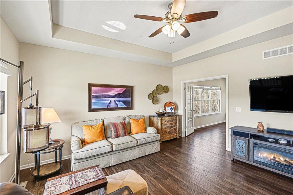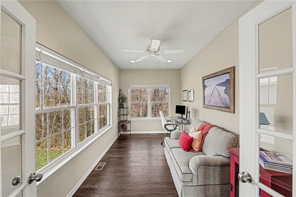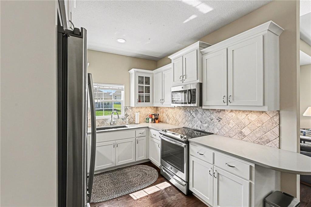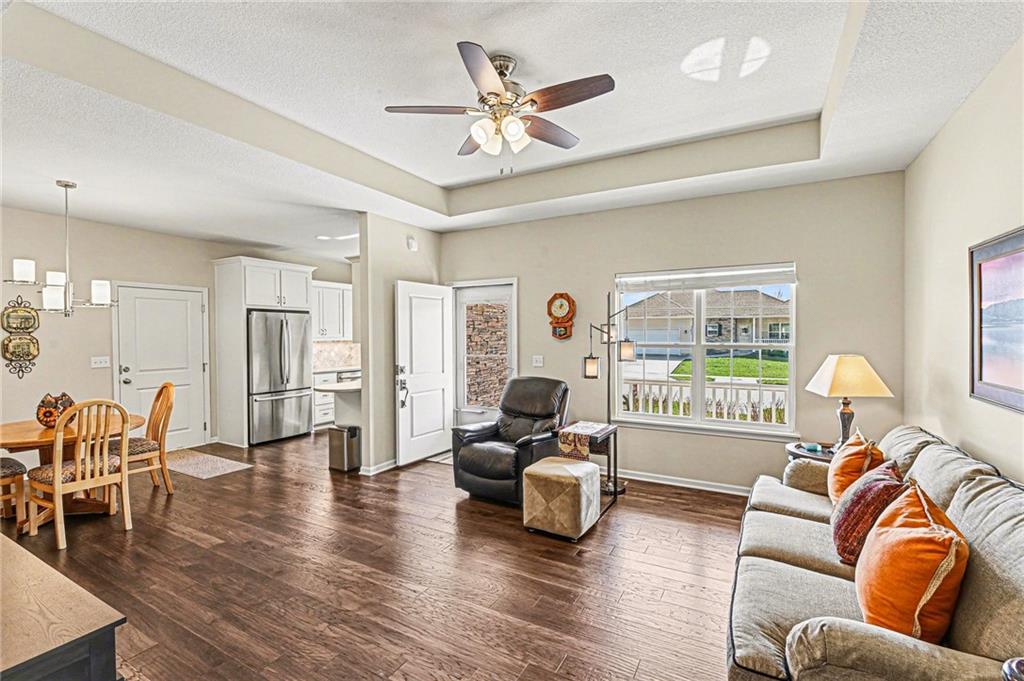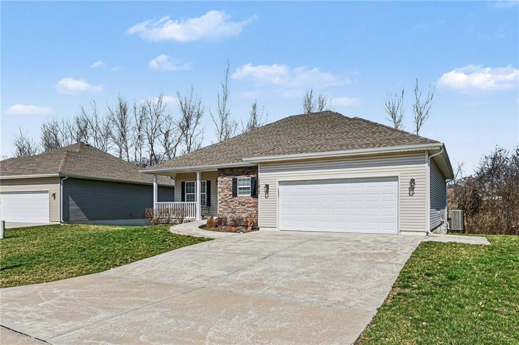 ***WOW! Shows like a MODEL HOME!*** Gorgeous Ranch Villa with Full WALK-OUT BASEMENT! Maintenance-Free Living! 55+ Community! Never Mow Grass or Shovel Snow Again! Loaded with UPGRADES! SUNROOM! Stunning Hardwood Floors Throughout! SOLID Surface Countertops, Stainless Steel Appliances Remain Including the Refrigerator! Sweet Kitchen with Custom Built Cabinets featuring Soft Close Doors & Drawers! Washer & Dryer! Custom Tile Shower with Recessed Accent Lighting, granite top! Extra Large Primary Bedroom with Huge Walk-In Closet and a secondary closet! Nice Front Porch and Large Back Patio Backing to TREES! Full Walk-Out Basement with EPOXY Floor Finish! XXX-TRA Clean! Move in Condition! Less than a Mile from The Legends Tanger Mall! Kansas Speedway! Sporting KC! Hottest Spot in KC! Hurry this one won't last!!!