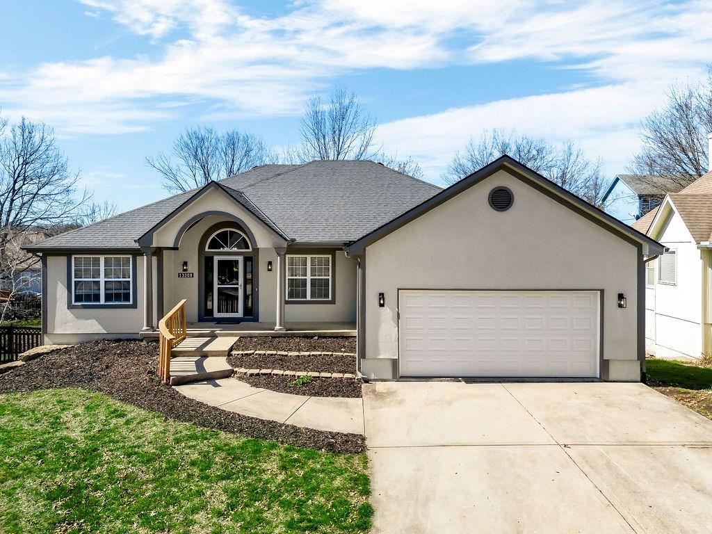 Tucked away on a quiet cul-de-sac with no through traffic, this spacious ranch backs to mature trees and offers incredible versatility with two separate living areas. The main level includes a full kitchen with stainless steel appliances, 3 bedrooms, including the primary suite, and two full bathrooms. The recently finished walkout lower level features its own full kitchen with stainless steel appliances, 3 additional bedrooms, a full bath, a rec room, and an office - perfect for multi-generational living or private guest space. Enjoy outdoor living with a large deck overlooking the fenced backyard, a walk-out patio on the lower level, and plenty of yard space. Updates include new exterior paint, newer HVAC, updated fixtures and hardware, and a new garage overhead door. This home is a short drive to many of Kansas City's best dining, shopping, and entertainment - without being in the city limits and paying the e-tax.