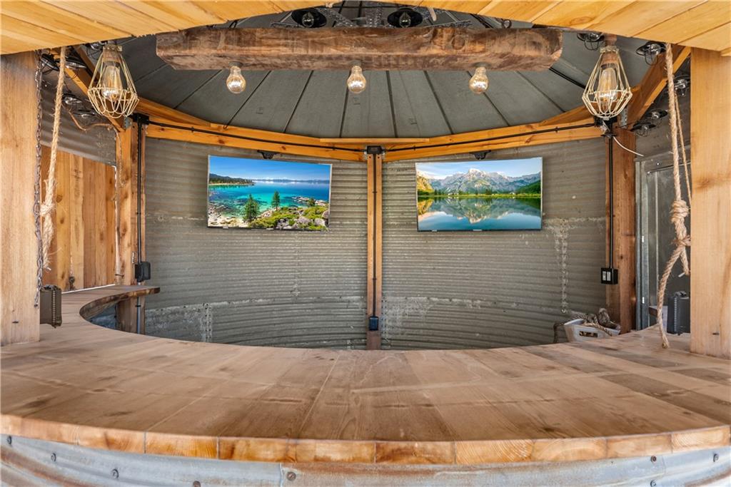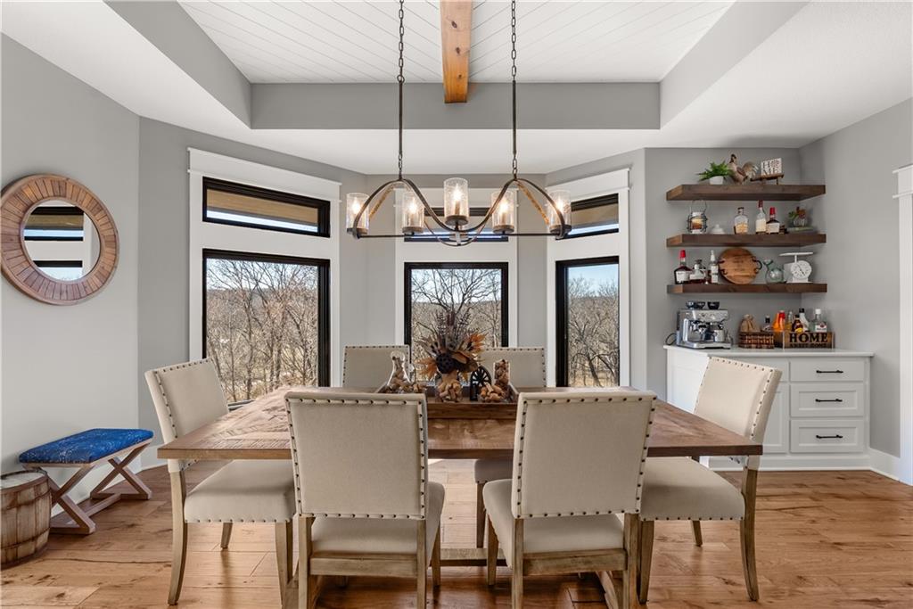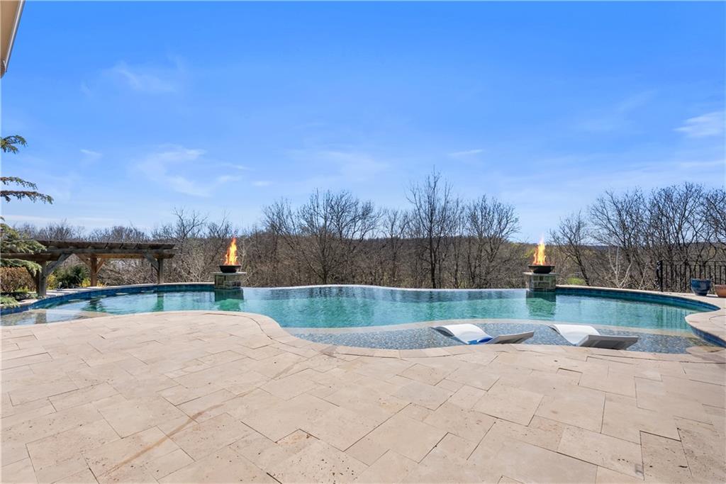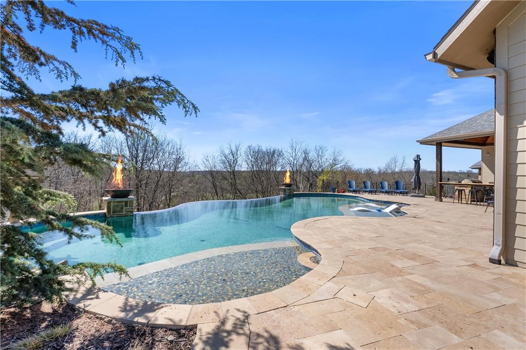 Dreams truly come alive in this one-of-a-kind custom Reverse 1.5 Story estate nestled on 9+ breathtaking acres in unincorporated Jackson County within the Lee’s Summit School District. This private retreat offers unmatched craftsmanship, panoramic treetop views & resort-level amenities that cannot be replicated. A grand front porch w/stone accents & custom doors welcomes you into a stunning interior featuring soaring 12-foot ceilings on both levels & architectural detail throughout. The main level showcases a dramatic living area w/west-facing views and a chef’s kitchen designed for everyday luxury and entertaining—complete with oversized island, custom shelving, walk-in pantry, double refrigerator/freezer combo, & oversized gas range. Light filled dining space, coffee bar-perfect for morning routines. The primary suite is a private sanctuary w/direct access to the covered patio for seamless indoor/outdoor living. The spa inspired bath features dual vanities,deep soaker tub, walk-in shower, & a generous walk-in closet w/custom built-ins. A main-level den (or 2nd bdrm) & convenient laundry complete the layout. The finished lower level is an entertainer’s dream featuring an oversized golf simulator & projector ,full wet bar, media/rec space, pool table area, exercise room w/sauna, & 2 additional bedroom suites each w/private baths & walk-in closets. A suspended garage provides rare lower-level 4th garage access—ideal for workshop, car collection, or storage. And then…This resort-caliber setting rivals luxury destinations. The vaulted covered patio w/stone FP creates year-round ambiance. Step outside to a spectacular infinity-edge pool with swim-up bar, tanning ledge, outdoor kitchen, & unobstructed treetop views offering 100% privacy. Entertain in your custom silo bar, practice on the putting green, unwind beside three cascading rock waterfalls surrounded by professional landscaping & custom exterior lighting. A signature property offering an unmatched lifestyle.