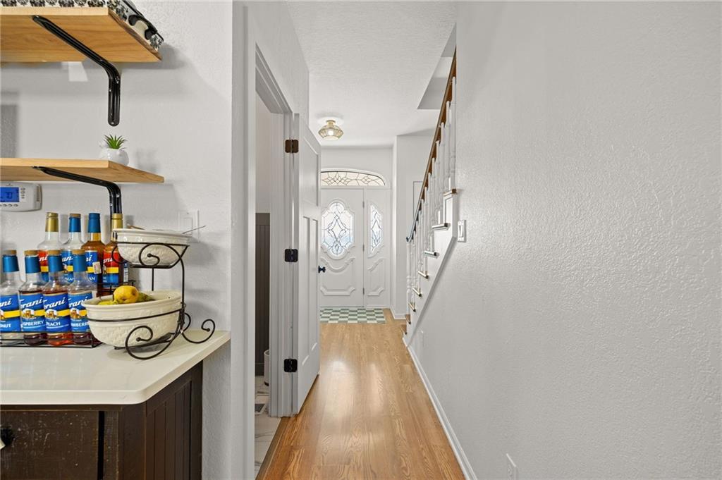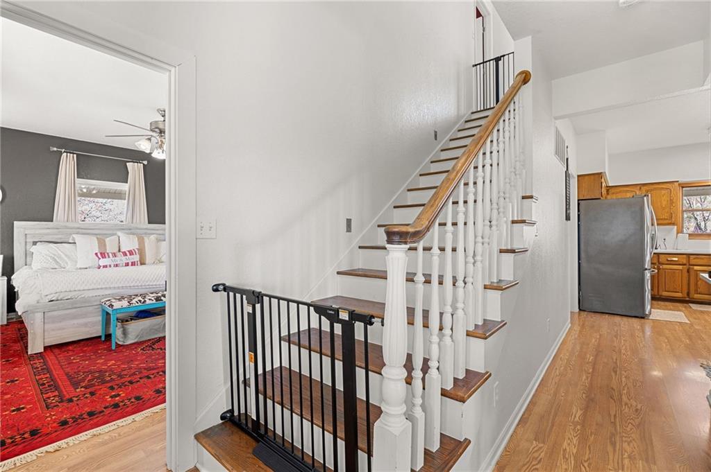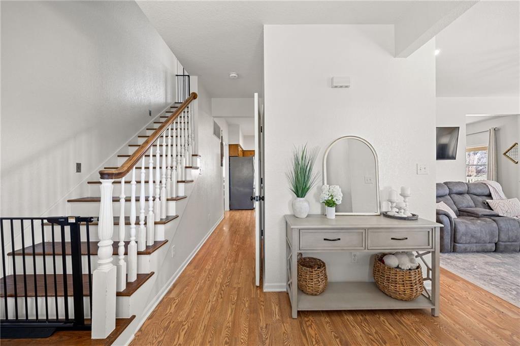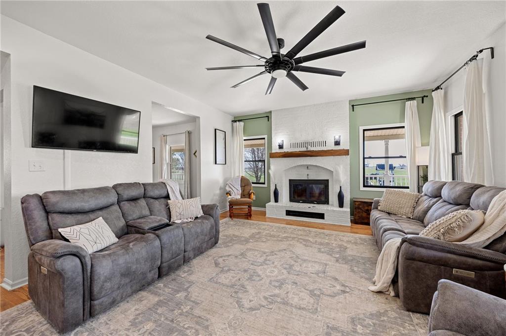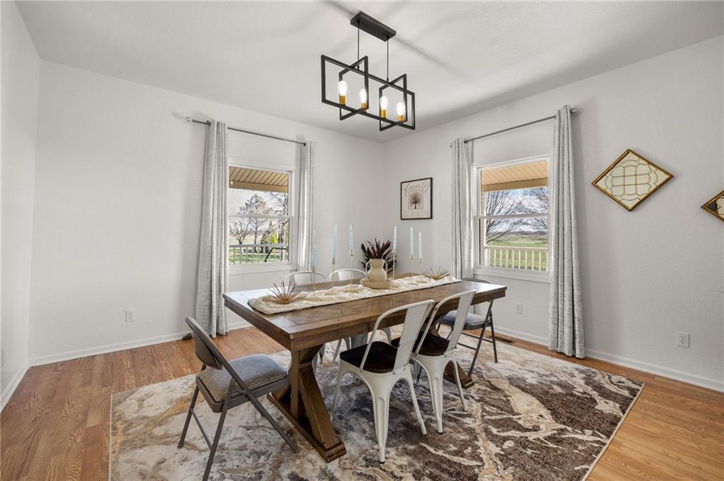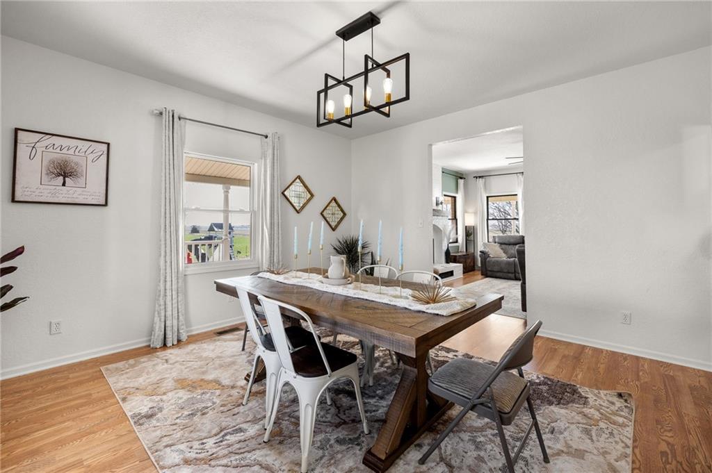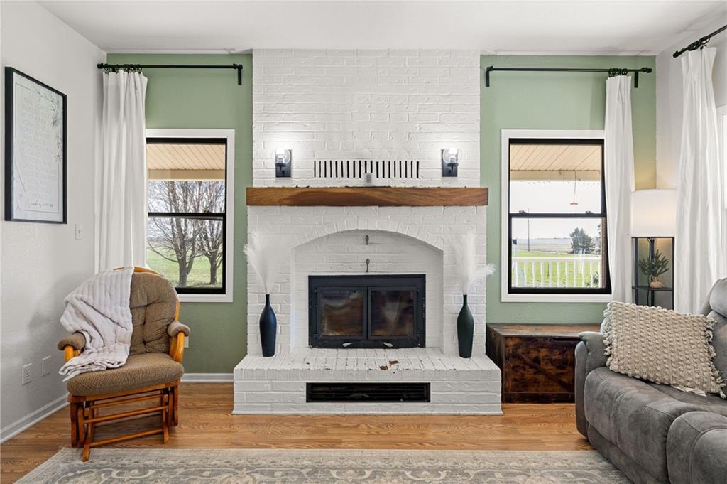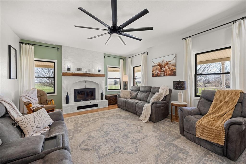 Beautiful traditional farmhouse on 3.75 acres offering 4 bedrooms, 2 bathrooms, and 2,557 square feet of inviting living space. This mostly brick home features wood siding on the second level, a durable metal roof, and a large covered wraparound porch perfect for enjoying the peaceful setting and beautiful yard. Inside, you will find 9-foot ceilings throughout the main level, a striking wood staircase, a spacious living room with a wood-burning fireplace, a large laundry room, and a main-level primary bedroom and bathroom for added convenience. The kitchen is beautifully updated with custom cabinetry and quartz countertops, and the attached 2-car garage plus two separate driveways provide plenty of space for parking and everyday function. Outside, the property includes a fruit orchard with a variety of fruit trees, adding even more charm to this picturesque country property.
