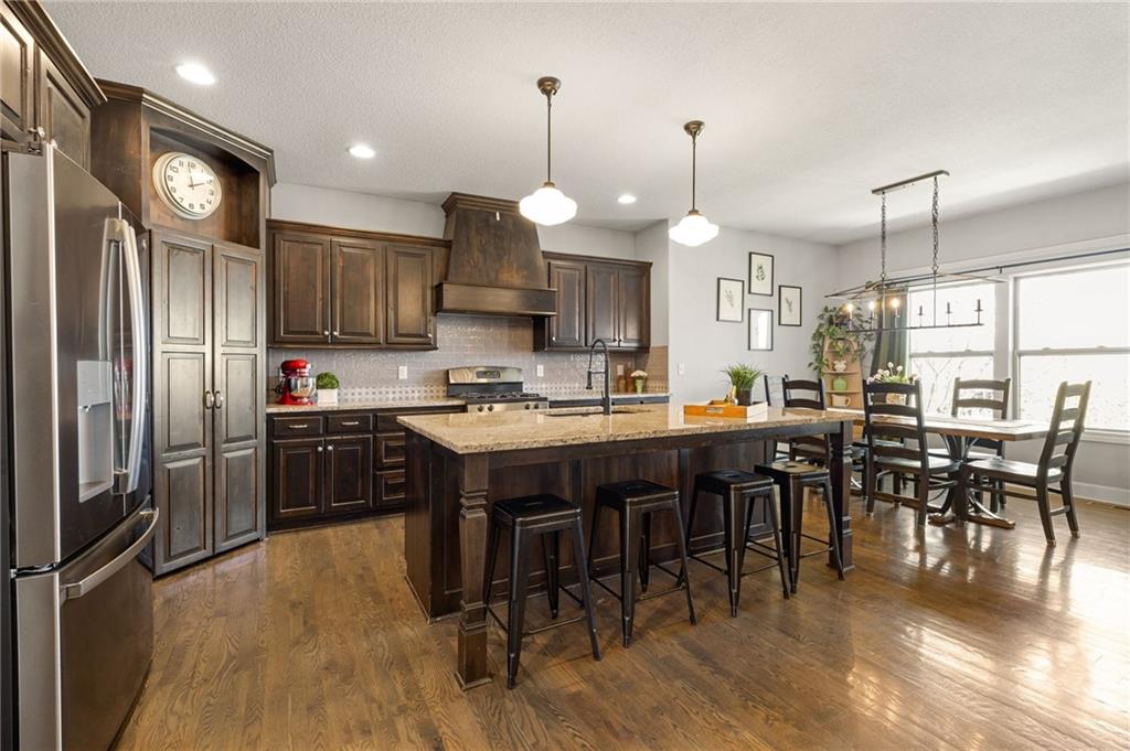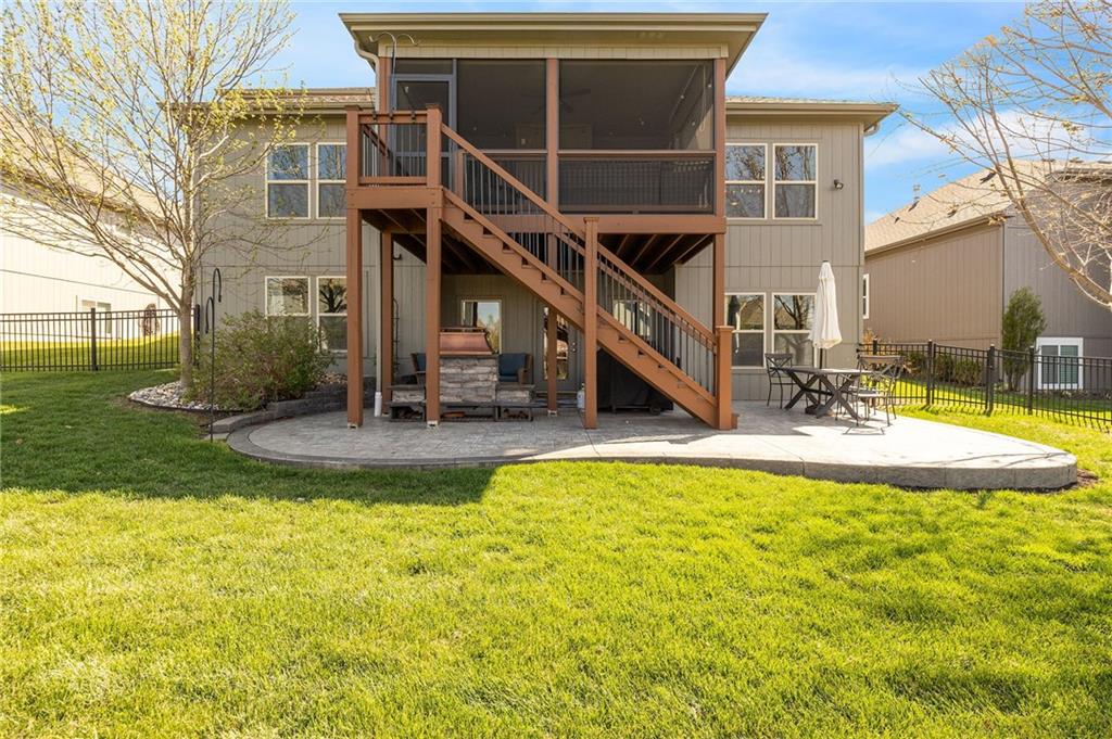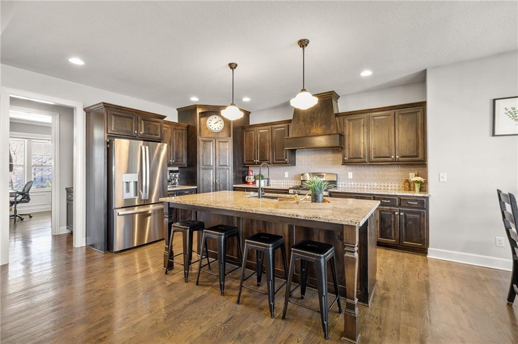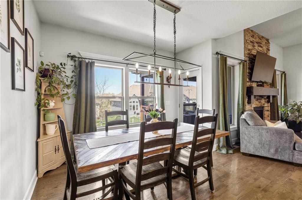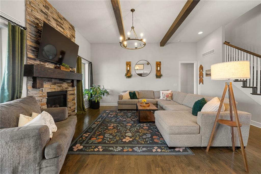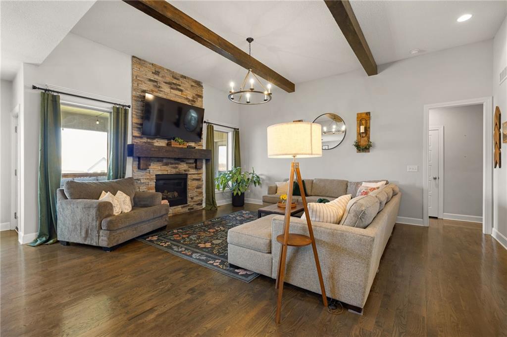 Stunning home in sought-after Chapel Hill, offering exceptional community amenities including two pools, clubhouse, playground, pickleball courts, and miles of scenic walking trails. A charming covered front porch welcomes you into a wood floor foyer, with hardwoods flowing throughout the main living areas, half bath, and mudroom. Thoughtfully designed, the mudroom features built-in bench seating, coat hooks, and cubbies, with convenient access to the garage and laundry room, which connects directly to the owner’s suite closet. The private main-level owner’s suite showcases a stepped ceiling, plush carpet, ceiling fan, and serene views of the wrought iron fenced backyard. The spa-like ensuite bath features tile flooring, a modern soaker tub, tiled shower, and direct access to the walk-in closet and laundry. The great room impresses with a wood-beamed ceiling, stone fireplace, and walls of windows, seamlessly opening to the kitchen and breakfast area. The kitchen is a true centerpiece with an oversized granite island with integral sink, walk-in pantry, stainless appliances, coffee nook, and butler’s pantry connecting to a front office or formal dining room with French doors. The breakfast area walks out to a covered deck, perfect for relaxing or entertaining. Upstairs offers four bedrooms, all with ceiling fans, including a private suite and a Hollywood bath shared between two bedrooms; all baths feature tile floors and granite counters. The finished walk-out lower level expands your living space with a family room, recreation area with wet bar, built-ins, microwave nook, and space for a full-size refrigerator. A fifth bedroom, full bath, and abundant storage complete the lower level. Enjoy outdoor living on the stamped and stained concrete patio within the fenced backyard. Ideally located near Heritage Park with golf, fishing, and an off-leash dog park just moments away.