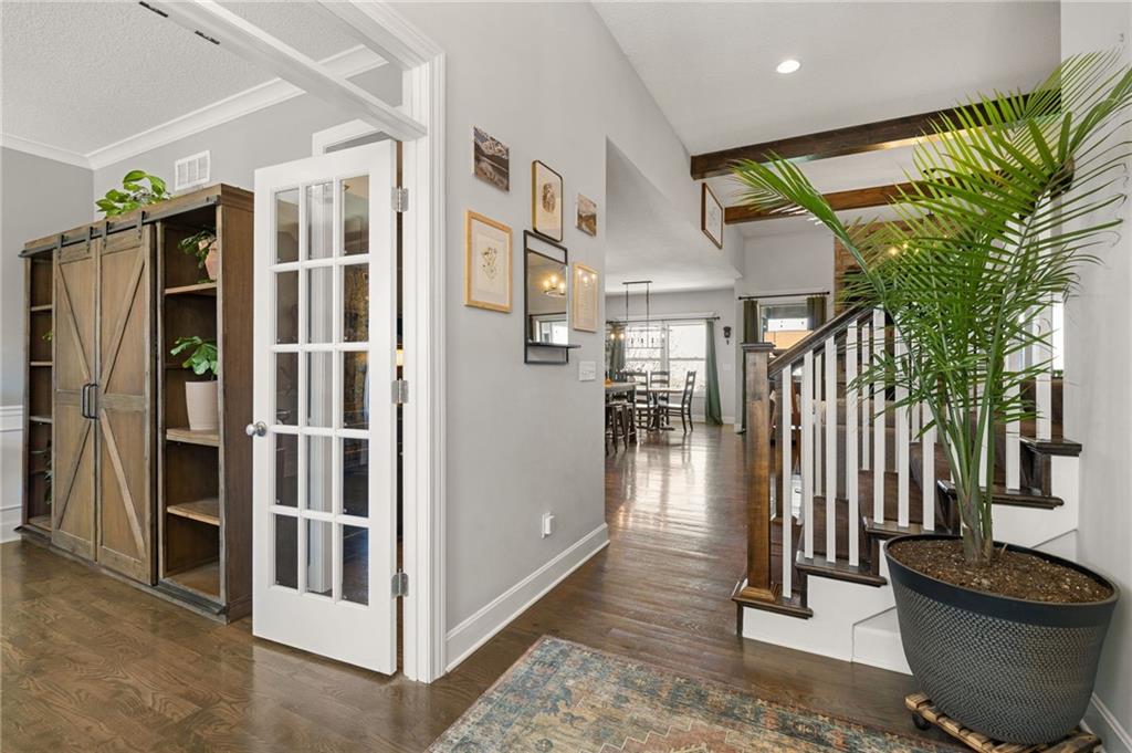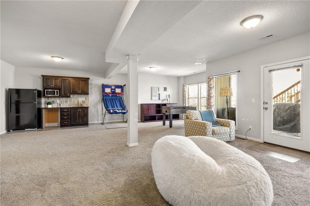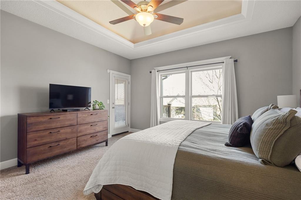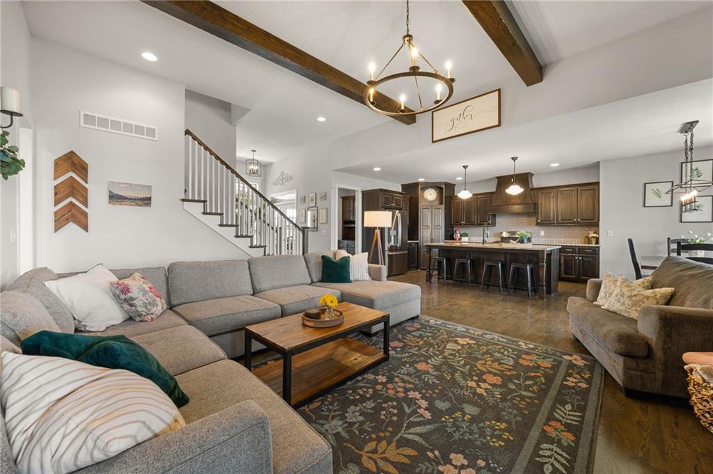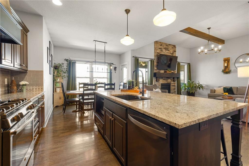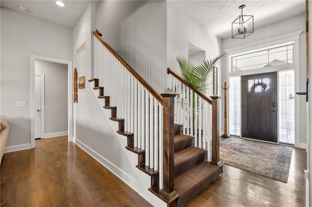 Stunning home in sought-after Chapel Hill, offering exceptional community amenities including two pools, clubhouse, playground, pickleball courts, and miles of scenic walking trails. A charming covered front porch welcomes you into a wood floor foyer, with hardwoods flowing throughout the main living areas, half bath, and mudroom. Thoughtfully designed, the mudroom features built-in bench seating, coat hooks, and cubbies, with convenient access to the garage and laundry room, which connects directly to the owner’s suite closet. The private main-level owner’s suite showcases a stepped ceiling, plush carpet, ceiling fan, and serene views of the wrought iron fenced backyard. The spa-like ensuite bath features tile flooring, a modern soaker tub, tiled shower, and direct access to the walk-in closet and laundry. The great room impresses with a wood-beamed ceiling, stone fireplace, and walls of windows, seamlessly opening to the kitchen and breakfast area. The kitchen is a true centerpiece with an oversized granite island with integral sink, walk-in pantry, stainless appliances, coffee nook, and butler’s pantry connecting to a front office or formal dining room with French doors. The breakfast area walks out to a covered deck, perfect for relaxing or entertaining. Upstairs offers four bedrooms, all with ceiling fans, including a private suite and a Hollywood bath shared between two bedrooms; all baths feature tile floors and granite counters. The finished walk-out lower level expands your living space with a family room, recreation area with wet bar, built-ins, microwave nook, and space for a full-size refrigerator. A fifth bedroom, full bath, and abundant storage complete the lower level. Enjoy outdoor living on the stamped and stained concrete patio within the fenced backyard. Ideally located near Heritage Park with golf, fishing, and an off-leash dog park just moments away.