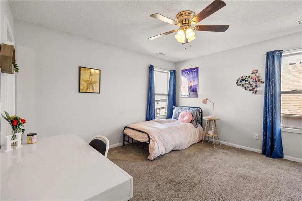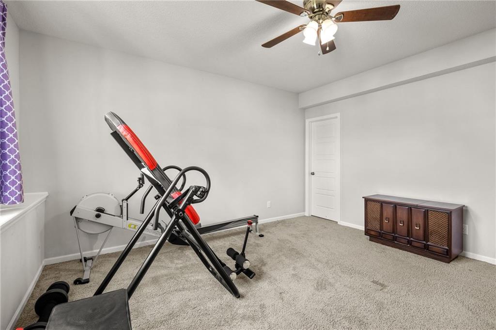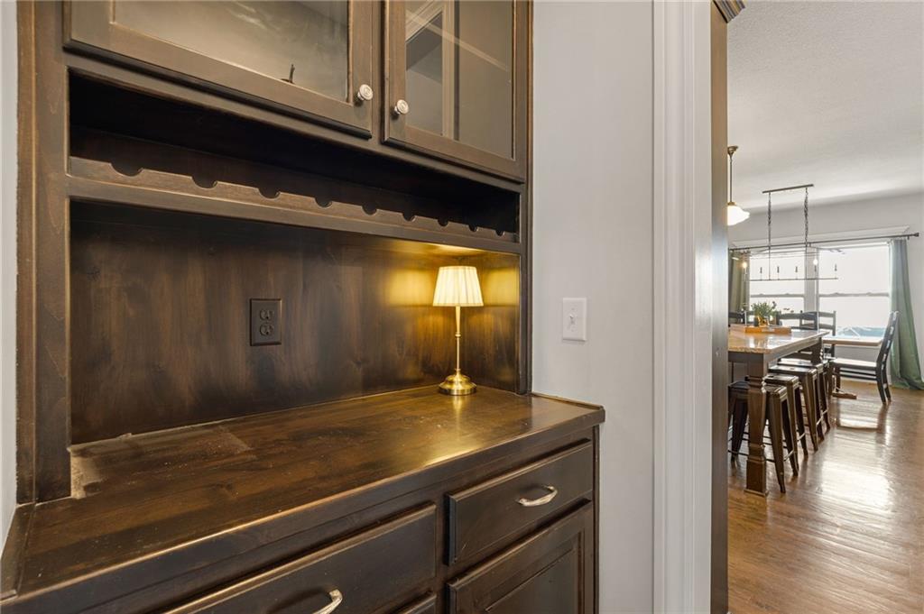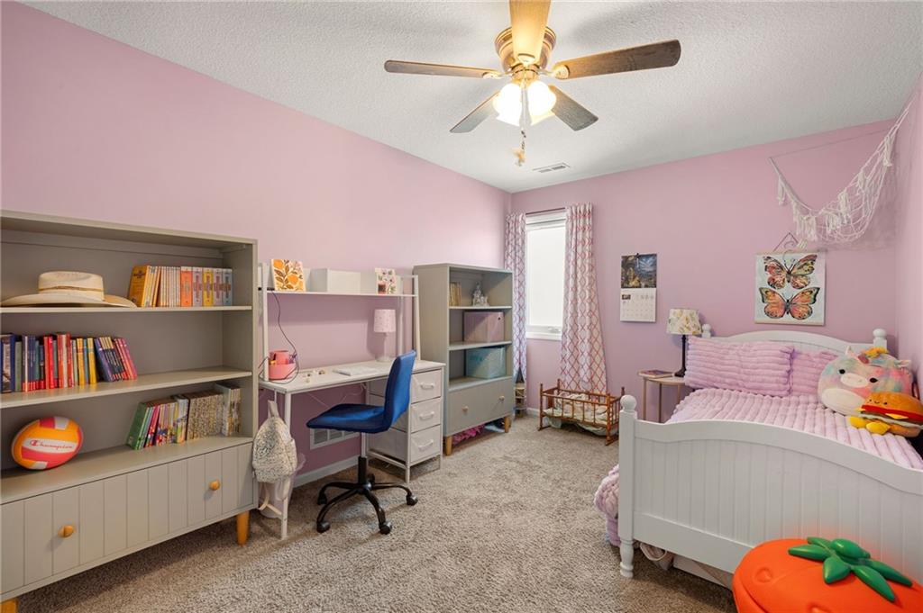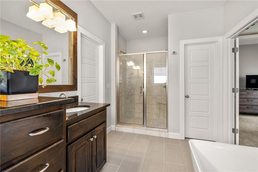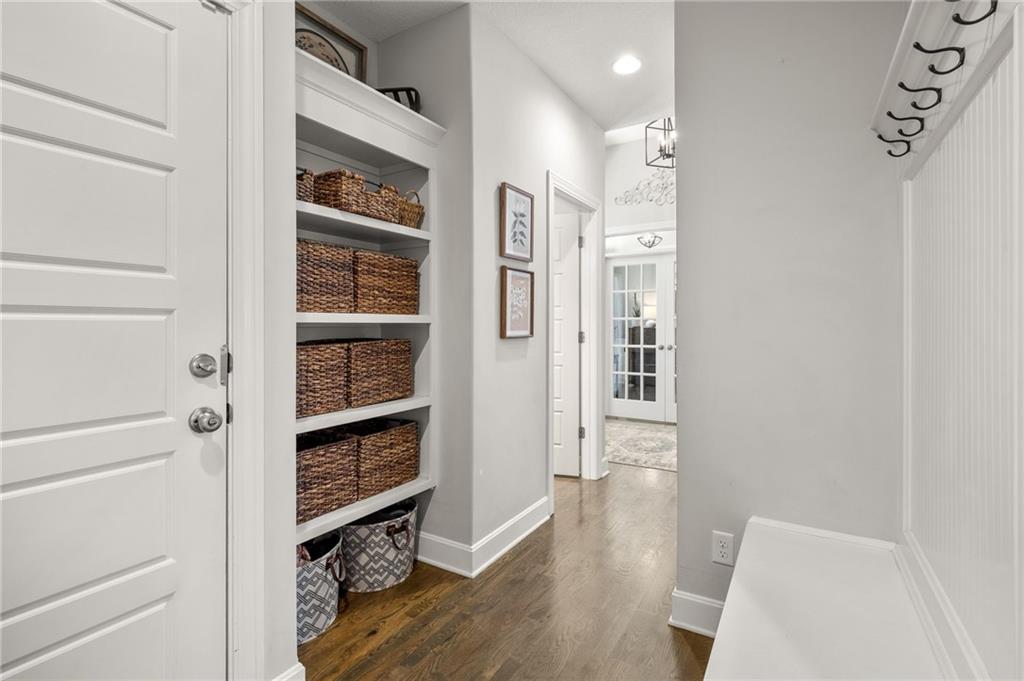 Stunning home in sought-after Chapel Hill, offering exceptional community amenities including two pools, clubhouse, playground, pickleball courts, and miles of scenic walking trails. A charming covered front porch welcomes you into a wood floor foyer, with hardwoods flowing throughout the main living areas, half bath, and mudroom. Thoughtfully designed, the mudroom features built-in bench seating, coat hooks, and cubbies, with convenient access to the garage and laundry room, which connects directly to the owner’s suite closet. The private main-level owner’s suite showcases a stepped ceiling, plush carpet, ceiling fan, and serene views of the wrought iron fenced backyard. The spa-like ensuite bath features tile flooring, a modern soaker tub, tiled shower, and direct access to the walk-in closet and laundry. The great room impresses with a wood-beamed ceiling, stone fireplace, and walls of windows, seamlessly opening to the kitchen and breakfast area. The kitchen is a true centerpiece with an oversized granite island with integral sink, walk-in pantry, stainless appliances, coffee nook, and butler’s pantry connecting to a front office or formal dining room with French doors. The breakfast area walks out to a covered deck, perfect for relaxing or entertaining. Upstairs offers four bedrooms, all with ceiling fans, including a private suite and a Hollywood bath shared between two bedrooms; all baths feature tile floors and granite counters. The finished walk-out lower level expands your living space with a family room, recreation area with wet bar, built-ins, microwave nook, and space for a full-size refrigerator. A fifth bedroom, full bath, and abundant storage complete the lower level. Enjoy outdoor living on the stamped and stained concrete patio within the fenced backyard. Ideally located near Heritage Park with golf, fishing, and an off-leash dog park just moments away.