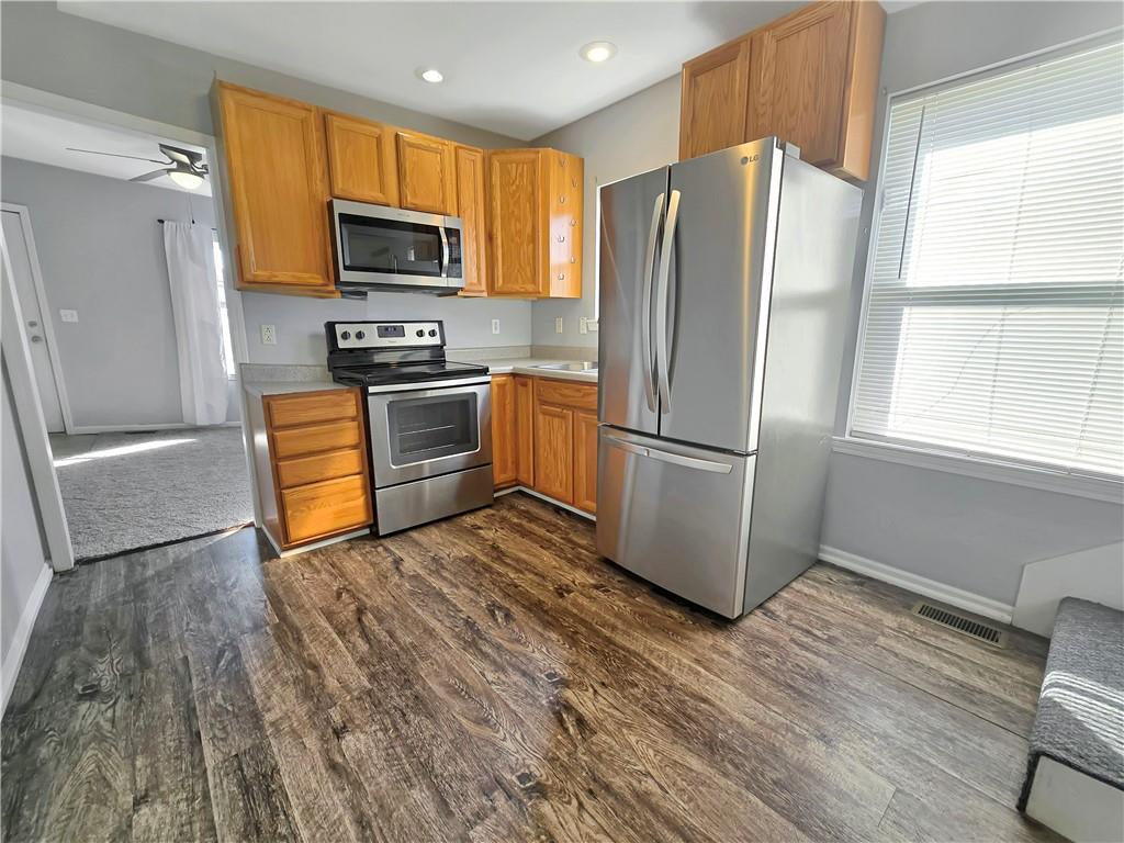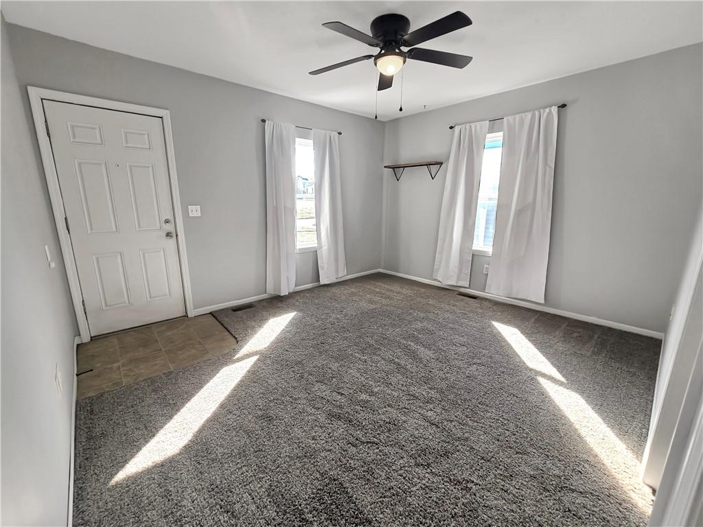 Charming 1.5-story home located just minutes from downtown Warrensburg! This inviting home offers 3 bedrooms and 1.5 bathrooms with a unique and functional layout. The main floor features two bedrooms and a full bathroom, while the third bedroom is an upstairs loft with its own private half bath, providing a comfortable and private space that works well as a primary bedroom, guest room, or office. Inside, the home features new carpet and living room curtains and has been professionally cleaned—making it completely move-in ready. Relax and unwind on the screened front porch, perfect for lounge furniture and cozy gatherings. The privacy-fenced backyard includes a firepit, creating a great space for outdoor entertaining or quiet evenings. Additional features include an enclosed back porch ideal for utility use or extra storage, as well as a spacious unfinished basement with washer and dryer included, offering plenty of additional storage space. Tenants will also enjoy access to four off-street parking spaces located adjacent to the backyard, making parking convenient for multiple vehicles or guests. Conveniently located near downtown shopping, dining, and amenities in Warrensburg. No pets allowed.