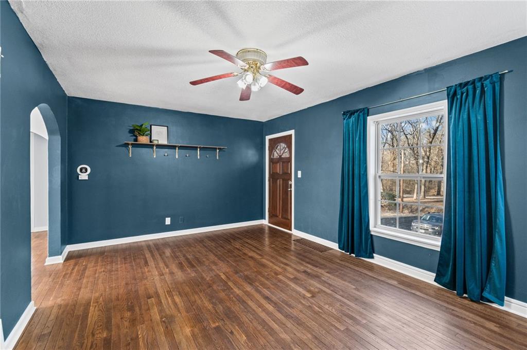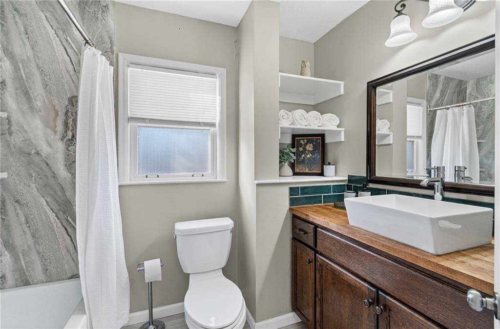 Charming home nestled on an oversized lot! Lovely living room with wood floors, brick fireplace, and room to welcome guests. Dining with arched details and provides plenty of room to entertain. Beautiful, remodeled kitchen with gas stove, white cabinetry, storage hutch, granite countertop, undermount sink, sleek faucet, panel wall, and easy patio access. Two main level bedrooms with wood floors and fans. Main level bath is freshly updated with custom vanity, green tile detail, shelving for additional storage, upgraded rain showerhead, and new tub with surround. Bonus main level space ready to be finished with double doors offering plenty of sunshine. Venture upstairs to the large loft bedroom with deep closet. Walkout basement offers so many possibilities and ample storage. In the backyard you will discover tranquility with the privacy fence and patio large enough for summer BBQs. Workshop with garage door is a nice space for hobbies, projects, or even more storage. Plus, all appliances stay! Deep driveway with plenty of parking. Located across from the street from the picturesque North Troost Trail with paved walkway and bridge, leading to the Englewood Park with a fishing pond, recreational fields, and playground. Conveniently located near highways, shopping, and restaurants. The perfect blend of character, comfort, and updates will win you over!