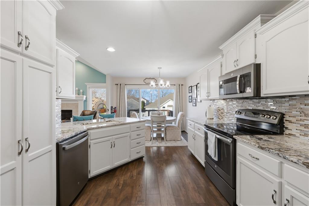 Extremely neat and beautifully maintained traditional ranch tucked away on a cul-de-sac. This three bedroom 2 1/2 bath Home features a finished walkout basement, abundant, natural light, and updates that make it move-in ready. Recent improvements include Kitchen counters and backsplash and painted cabinets, LVP flooring, new carpet, a new roof and gutters, and windows by the fireplace. Enjoy the open and welcoming feel of the home along with the outdoor living on the deck and patio. Fantastic lower level rec room for entertaining. The pool table stays, adding even more value to this wonderful property. Close to Zona Rosa, Highways, KCI Airport, and 20 minutes to downtown KC. Preferred school district by many. Seller needs delayed closing to May 20th, for move out of state. Room measurements to be verifed by buyer.