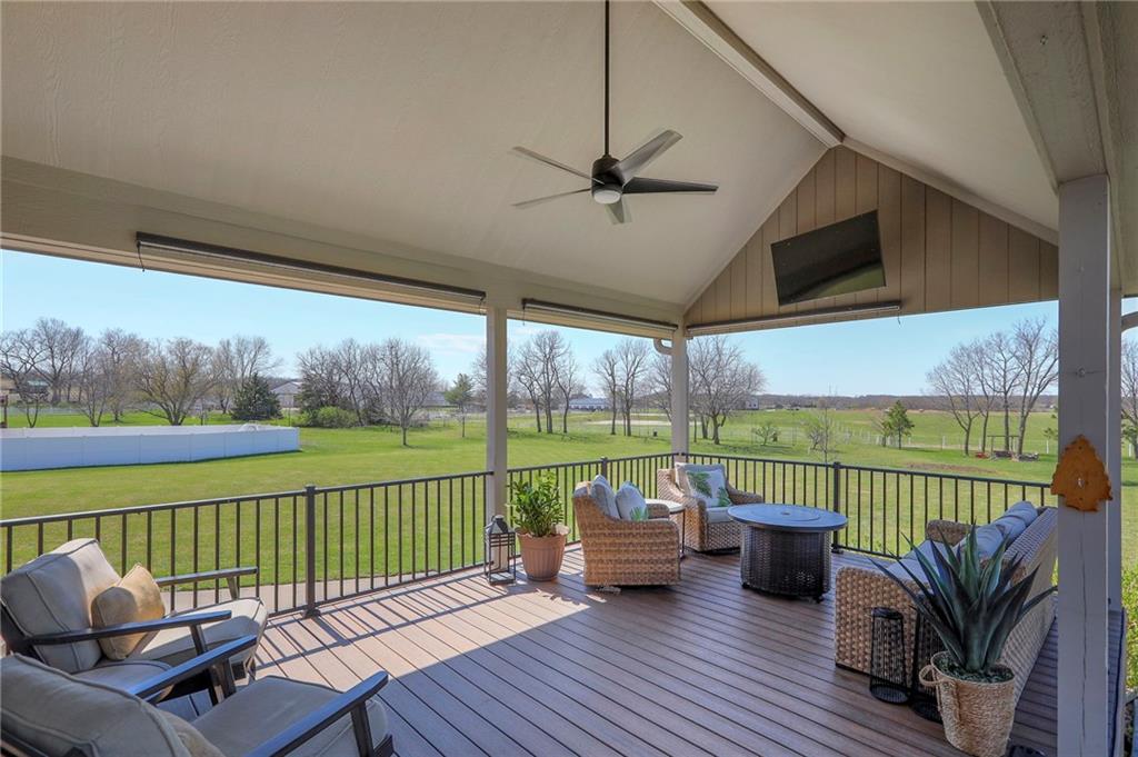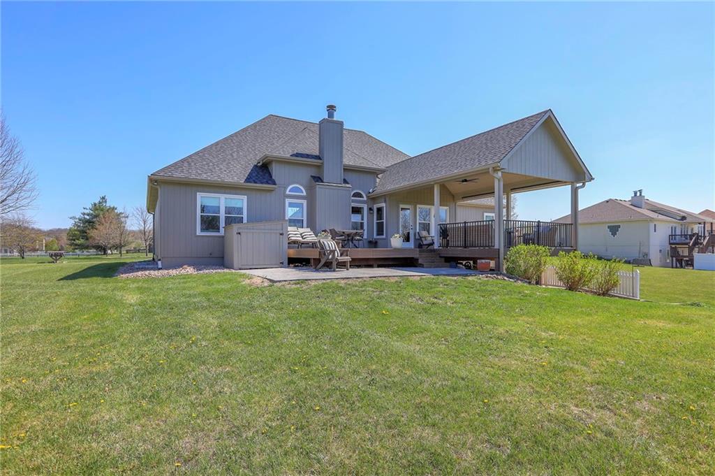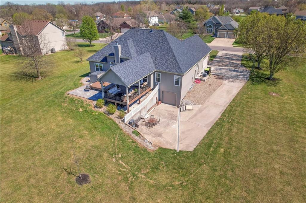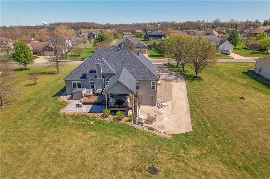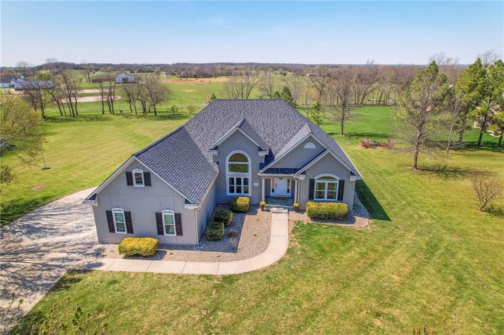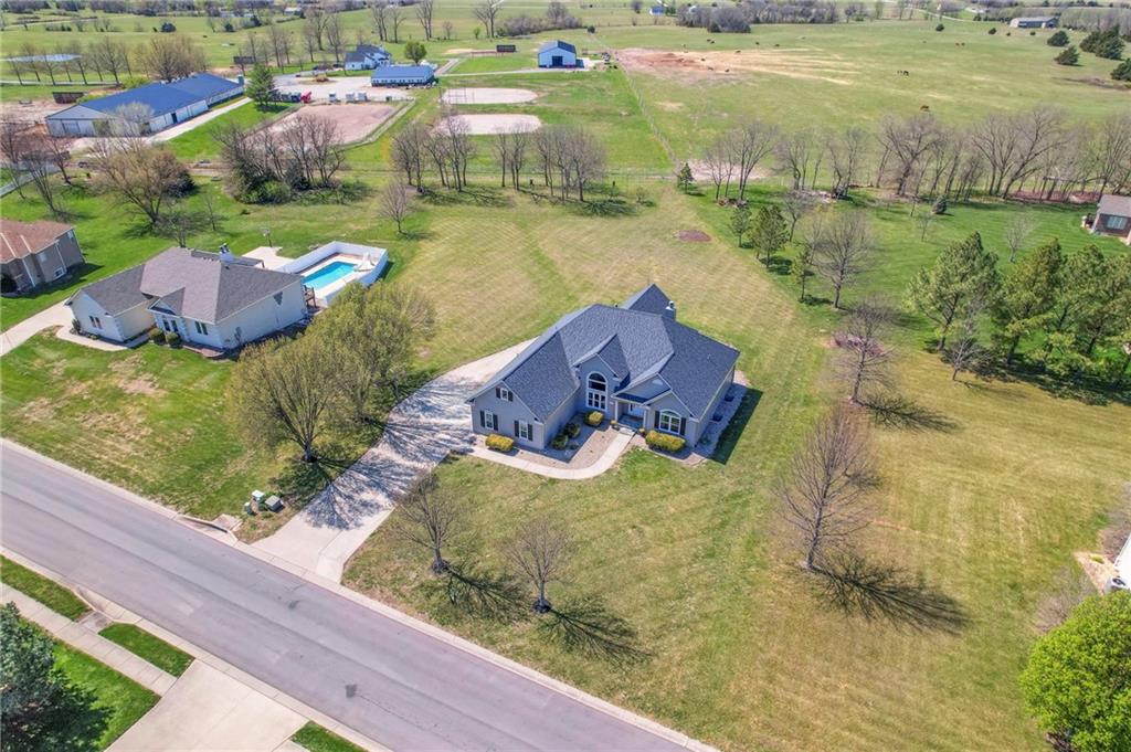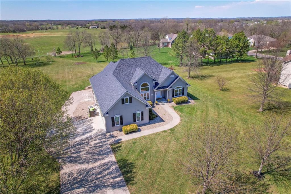 Homes in Edgewood Estates rarely come to market—even more rarely on 1.29 acres with breathtaking sunset views overlooking a horse farm. This beautifully appointed 5-bedroom, 3-bath home offers expansive living spaces, exceptional outdoor entertaining, & one of the largest lots in the neighborhood. Inside, soaring ceilings & a stately fireplace anchor the main living space, creating an atmosphere that feels both grand & welcoming. The expansive kitchen offers abundant cabinetry & workspace rarely found in newer homes, complemented by a family dining area with bar-top seating, while the formal dining room provides an elegant setting for gatherings. The primary suite offers a peaceful retreat with west-facing windows capturing spectacular sunsets, along with a generous ensuite & oversized walk-in closet. Two additional bedrooms & a spacious hall bath are positioned on the opposite side of the home, offering privacy & flexibility for additional living space or a home office. The finished lower level expands the home with a large family room, oversized recreation area with pool table space, & a fully equipped kitchenette—ideal for entertaining or a true second living space. Two additional bedrooms & a full bath add flexibility for guests, hobbies, or a home gym. With direct access from the third-car garage, the lower level creates an ideal private retreat. A safe room, generous storage, & third garage bay, currently outfitted as a woodworking shop, add additional functionality. Outdoor entertaining shines with a covered deck featuring vaulted ceilings, built-in floor outlets, mounted TV, & sunshade—perfect for sunset gatherings. A stamped concrete patio & beautifully maintained landscaping complete the outdoor setting. Located on the west side of Oak Grove in the Grain Valley School District, this Edgewood Estates property offers a rare opportunity to own a truly exceptional home.