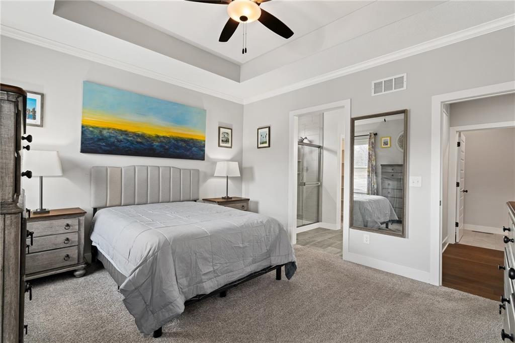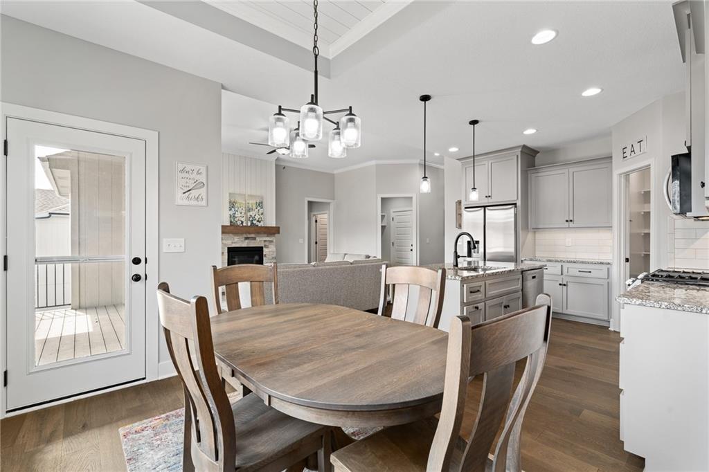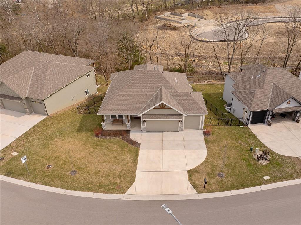 Main level living features wood floors, soaring ceillings, and full length windows that overlook treed back yard. Kitchen w/amazing pantry, gas stove, granite tops and island. 2 beds and laundry on main, 2 beds and family room in lower level. 3 outdoor living spaces. Fully fenced yard has a fantastic patio ready for entertaining or relaxing w/your nearest and dearest. 3 car garage. High ceilings in basement. Great light throughout. Neighborhood is walkable. Location is convenient to highway access, local restaurants and shops, all 3 public schools, JoCo. parks and rec + dog park.