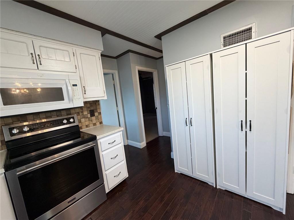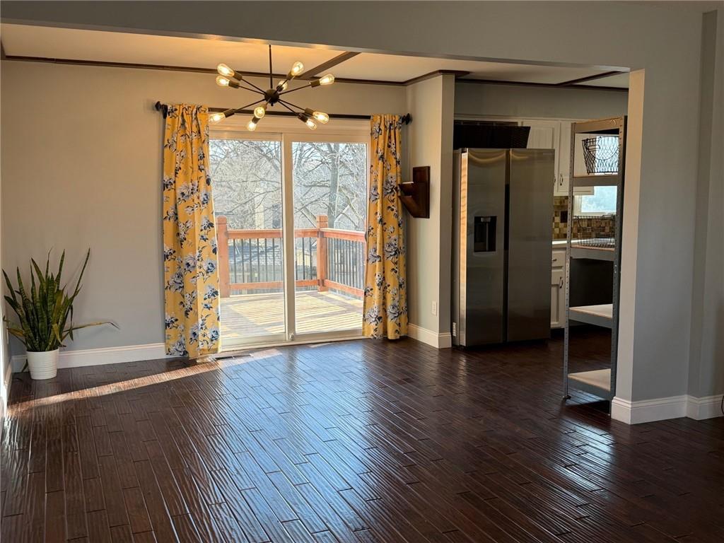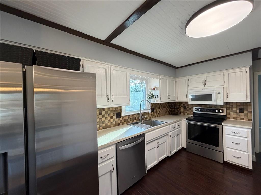 Peaceful cul-de-sac lot allowing for a generous back yard with a beautiful new deck, privacy wall and herringbone laid concrete block patio! Hard to find true 4 bedroom, raised ranch/2 story. Primary bedroom is on the second floor along with a large secondary bedroom and tiled 3/4 bathroom. Both bedrooms have walk-in closets. TWO bedrooms on the main floor with full bathroom. Slider to deck that overlooks the rear entry garage/basketball area. Landscaped fenced rear yard, fire pit area and play area. Farm-house single bowl, stainless steel kitchen sink, white cabinets, built-in microwave, white pantry cabinets and industrial shelves round out the kitchen. Front living room has a large picture window. Finished rec room has projector and pull down screen that will remain with the home. Masonry fireplace. Roof 8 years old. Lennox air conditioner new in 2022. Lennox furnace new in 2016. Rheem water heater new in 2017. Refrigerator to remain with the home.