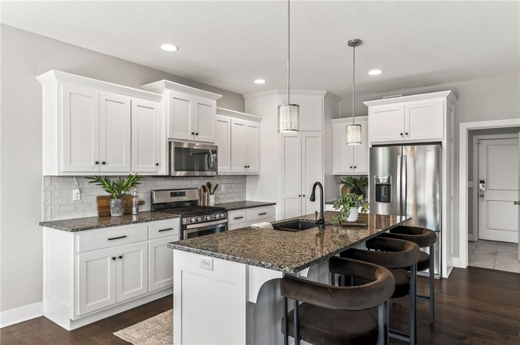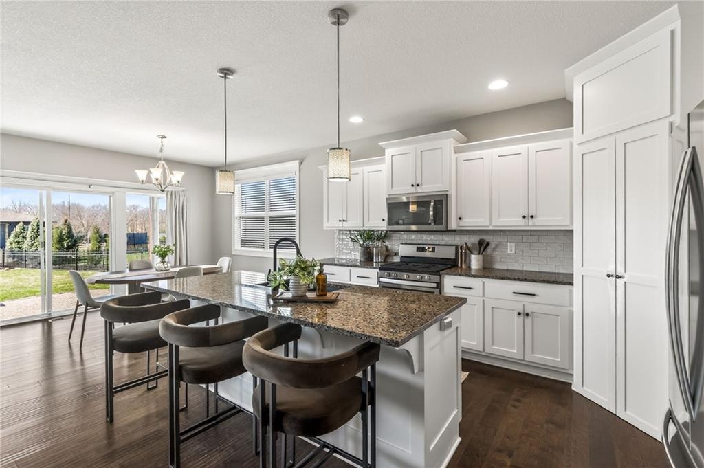 Welcome to this rare 6-bedroom, 5-bathroom luxury home that truly feels better than new. The owners have put in over 100k of upgrades in the last couple years in addition to it being a former parade of homes house built with premium finishes. A main-level bedroom offers incredible flexibility with direct access to a full bathroom and to the 3rd garage, making it ideal for guests, multi-generational living, or a private office setup. This house has all of the qualities you see in a new build plus major upgrades like a whole home generator, solar panels, Halo water filtration, HVAC ionizer air purification, and an extended front room that can serve as a formal dining, sitting room, or piano space. You’ll love the open floor plan highlighted by a stunning wall of windows, built-ins, a floor to ceiling fireplace, rich engineered wood flooring, and a chef-inspired kitchen featuring a center island, HUGE walk-in pantry, granite counters and custom cabinets. Upstairs, the expansive primary suite is a true sanctuary complete with a luxurious tub, tiled shower, his/her vanities, and an impressive walk-in closet. Three additional oversized bedrooms all have walk-in closets and bathroom access. The newly finished basement adds even more living space, including a 6th bedroom, beautifully finished bathroom with an incredible spa-like shower, and room designed for fun — already stubbed for a wet bar and measured for a shuffleboard table. Every basement window is an egress, adding safety and peace of mind. Step outside to enjoy the flat backyard, surrounded by a no-maintenance aluminum fence. A sprinkler system keeps the lawn looking great as you relax and enjoy the night on the covered back patio. Located on a cul-de-sac in Liberty Schools and part of an amenity-rich community featuring multiple pools, a lazy river, water slides, scenic trails, and more, this home offers a lifestyle that is truly hard to match.
