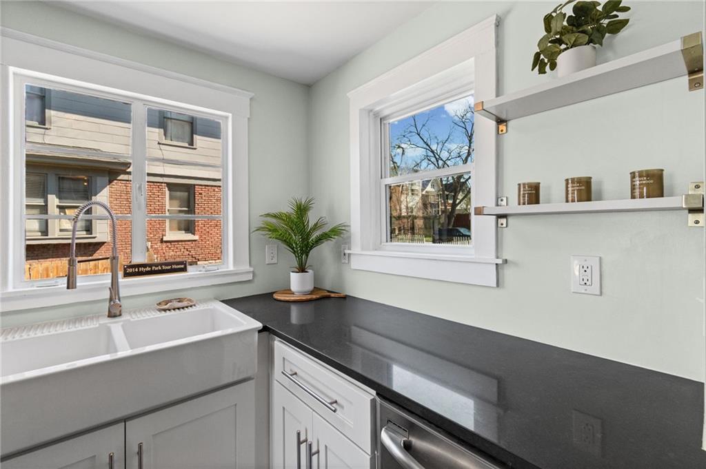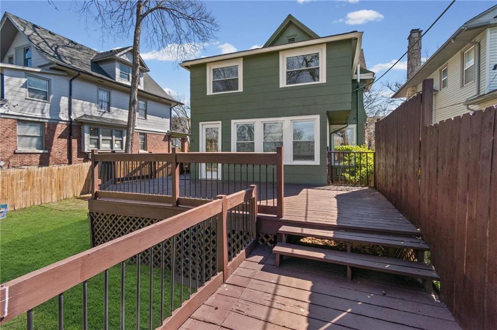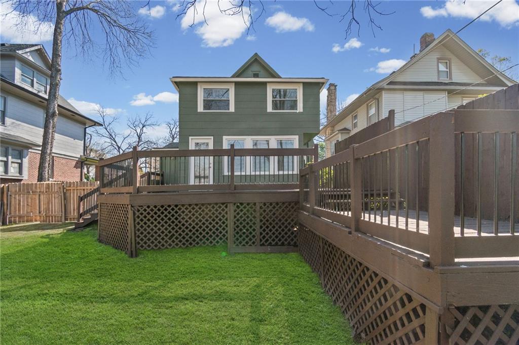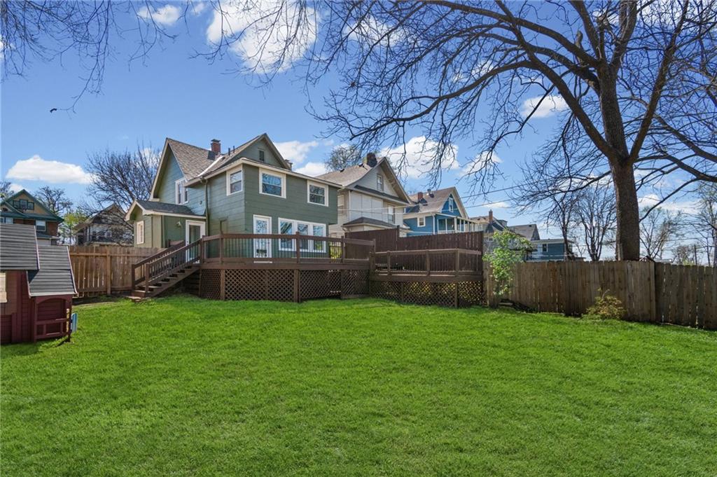 Hyde Park South gem blending historic elegance with modern comfort! Inviting front porch features a bench swing to enjoy the seasons. Hardwoods take you through the generous living and dining areas showcasing abundant natural light. Rear of home provides a full bathroom, and a bonus main level bedroom that could also work well as an office or TV room. Updated kitchen offers granite countertops, ample cabinetry, soft close drawers, farm sink, SS appliances, and walkthrough food pantry with additional back deck entry. Take the original classic stained staircase up to the upper level. Front bedroom showcases a beautiful beadboard ceiling, lively walls, hardwood floors and two walk-in closets. Primary Bedroom of your dreams. With a sitting room and ample closet, it offers plenty of space to feel at ease. Laundry room with plenty of storage space and a 2nd full bath completes the second level. Basement ideal for your storage needs. Step outside to a private backyard made for relaxing, gardening or hosting family and friends. Oversized deck with the perfect sunset view and space for your BBQ masterpieces. Plenty off-street parking with its sizable drive. Plus, a new roof and fresh exterior paint! Just minutes from Gillham Park, the Plaza, Midtown, museums, & local restaurants and shopping. Don't miss the chance to own in one of KC's most desirable historic neighborhoods!