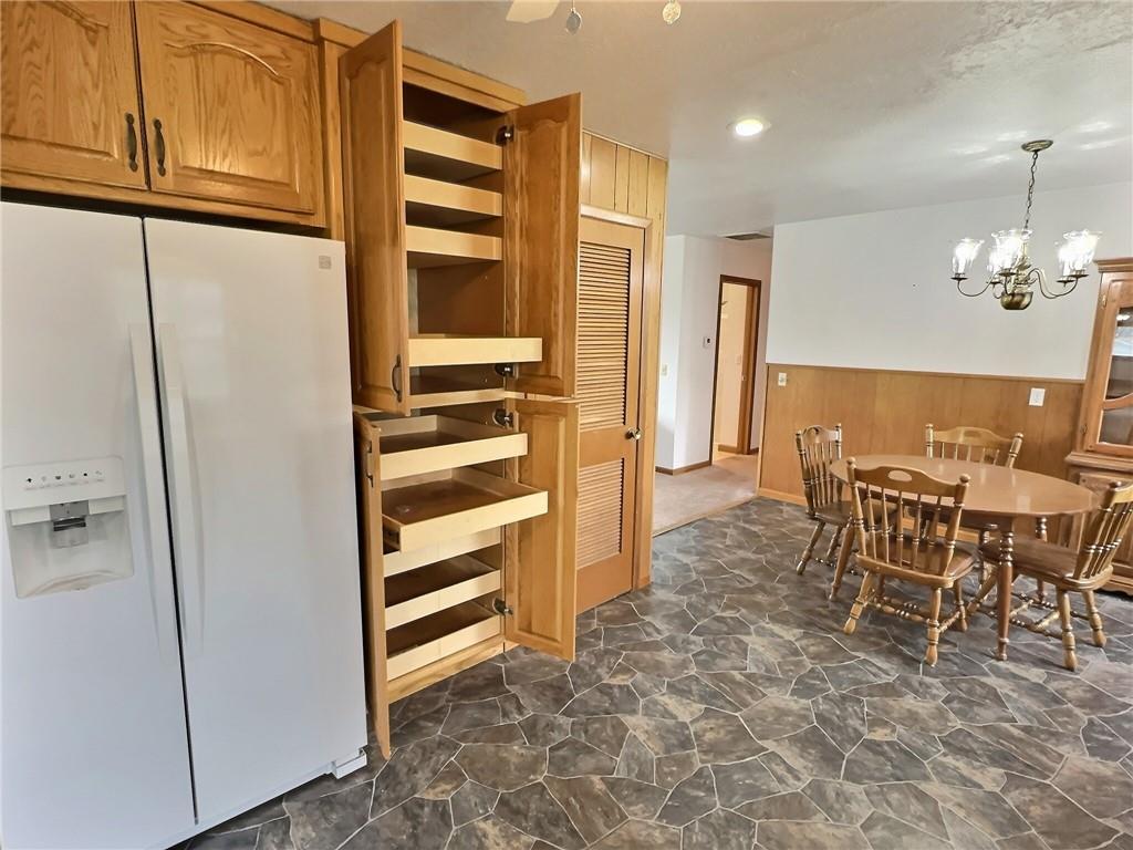 Kitchen with white appliances, a wainscoted wall, stone floors, wooden walls, and suspended lighting