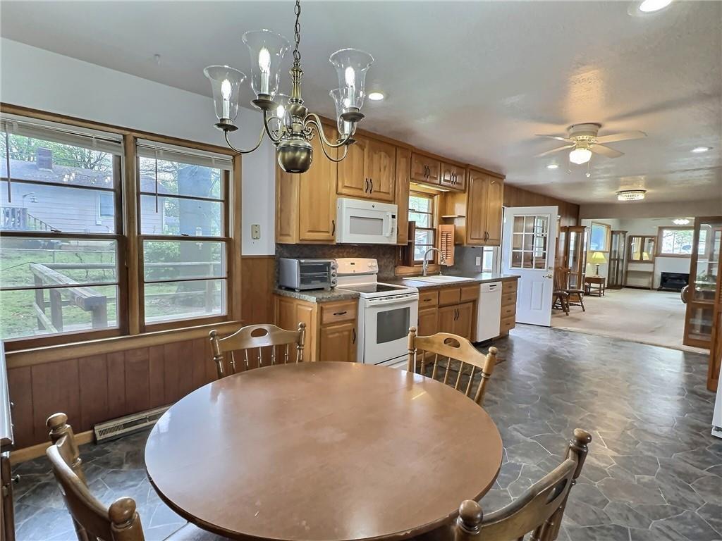 Kitchen featuring stone flooring, white appliances, a chandelier, a ceiling fan, and a baseboard heating unit