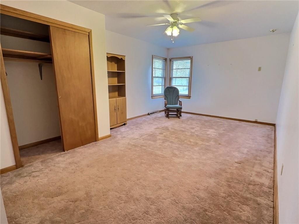 Unfurnished bedroom featuring light carpet, a ceiling fan, and a closet