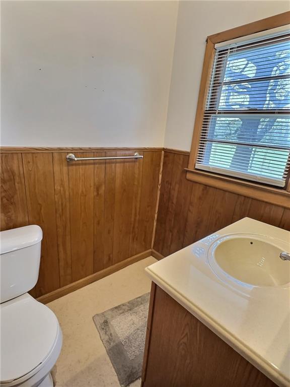 Half bath with vanity, wooden walls, and wainscoting