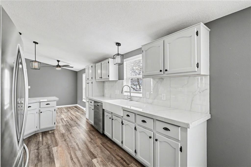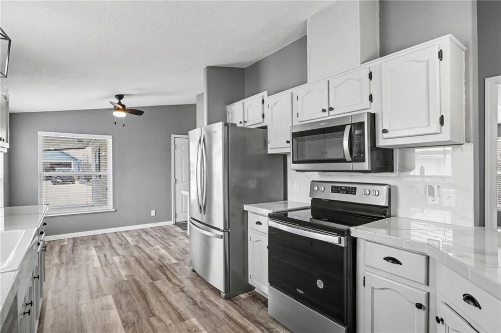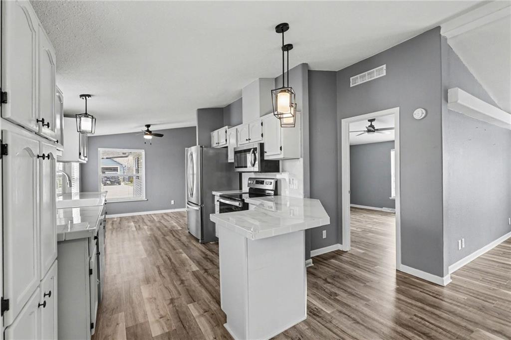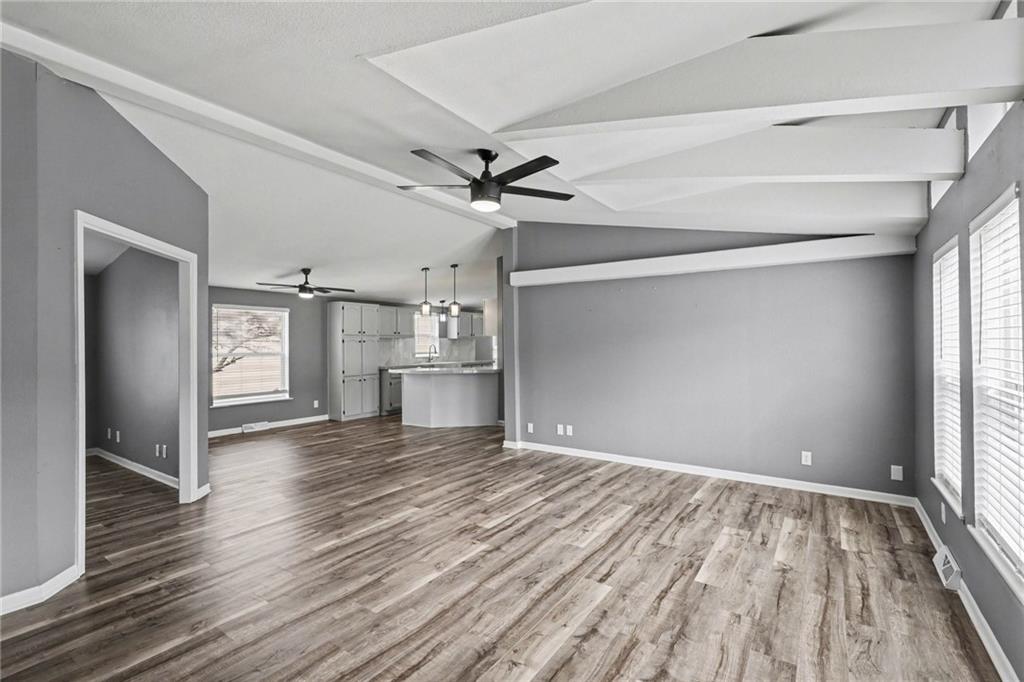Clean, updated, and move-in ready—this one is easy to love. Step inside to a bright, open layout with vaulted ceilings, exposed beams, and durable flooring that flows throughout the main living spaces. The kitchen has been refreshed with white cabinetry, solid surface countertops, stainless appliances, and modern lighting, opening seamlessly to the living area—perfect for everyday living or entertaining. Spacious bedrooms offer flexibility, including a primary suite with private access and comfortable finishes. Outside, enjoy the covered carport, low-maintenance exterior, a deck for relaxing, and a storage shed for added convenience. If you’re looking for something that feels fresh, functional, and ready to go without the work—this is it. Schedule your showing before someone else grabs it.