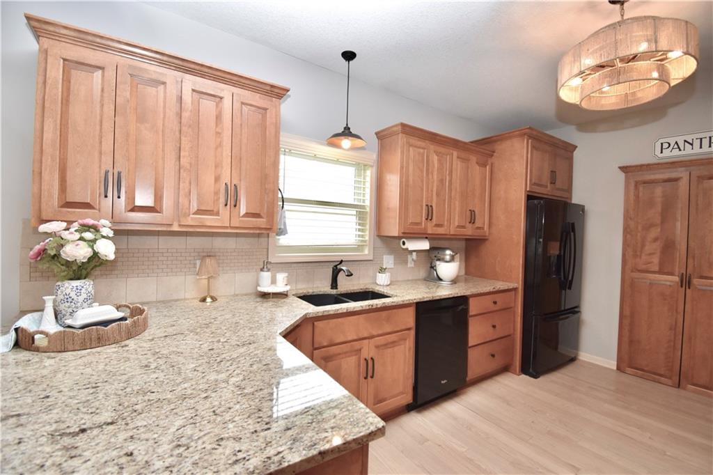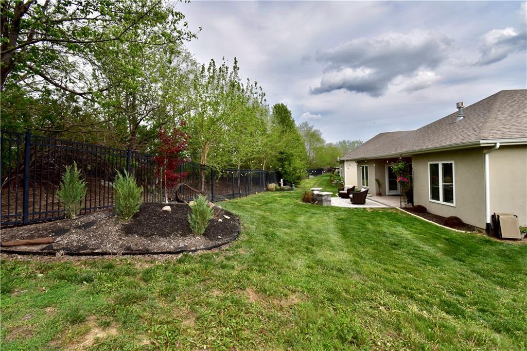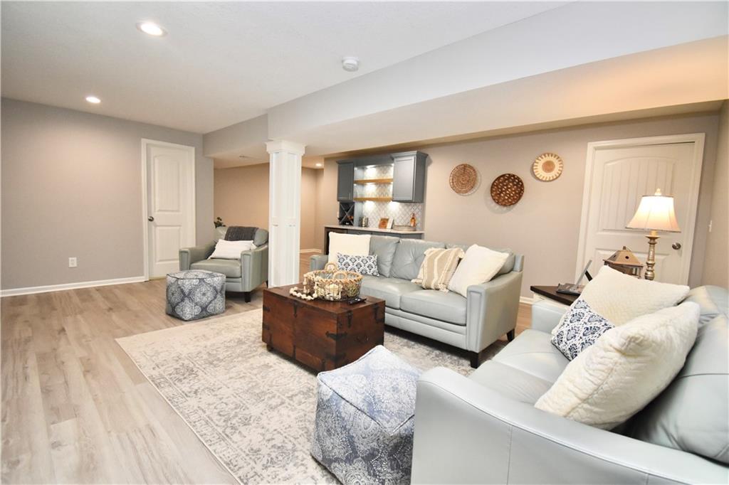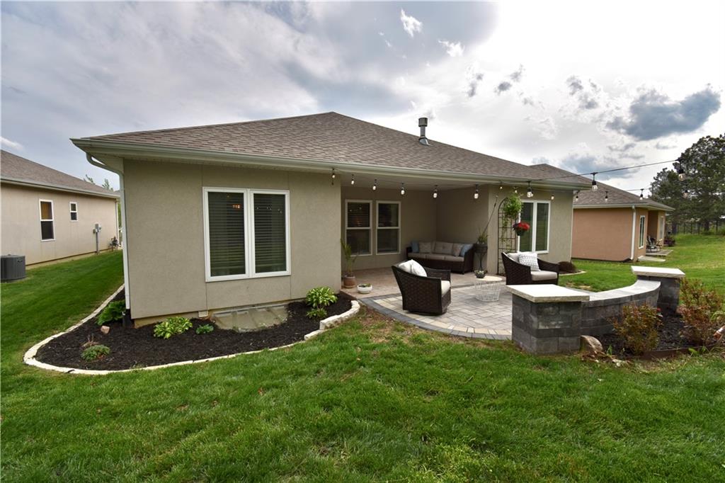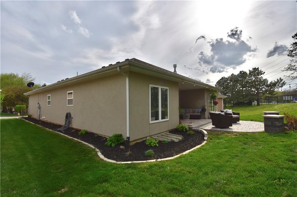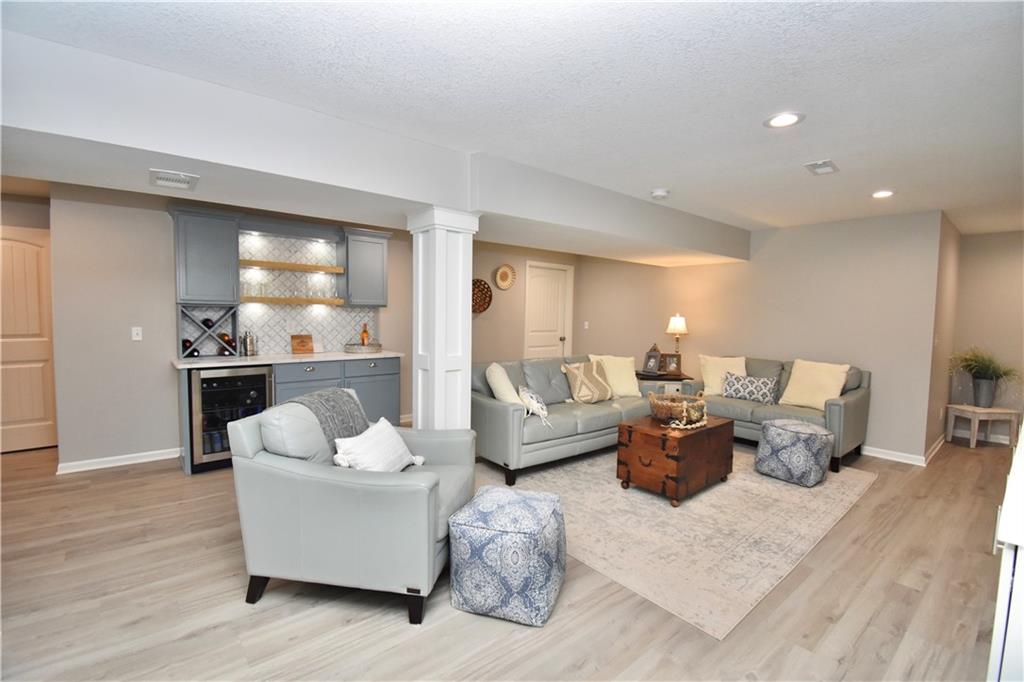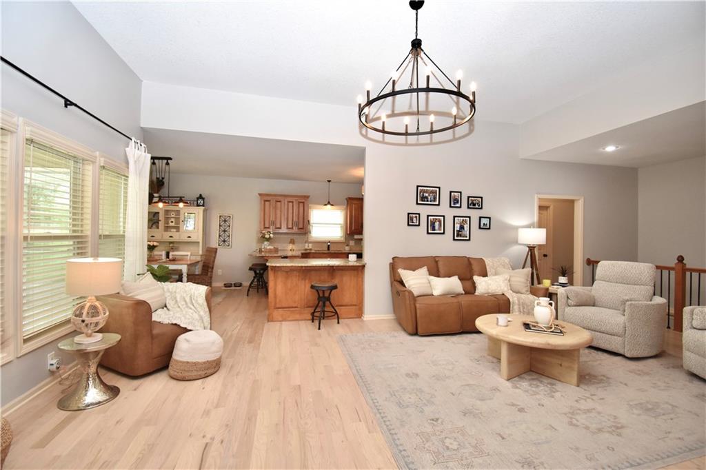 Beautifully updated reverse 1.5 Story on a quiet cul-de-sac in Liberty w/CRAZY LOW HOA fees of JUST $67/month! This well-maintained, 10-year-old home offers approximately 2,600 sq ft of finished living space plus aprox. 900 sqft in the lower level. Seller spent $80,000+ in upgrades completed in the past two years. HOME Designed for easy main-level living, this home features zero-entry access, wider doorways, & low-profile step-in showers. Open floor plan showcases fresh interior paint, new hardwood floors, natural color, throughout the entry, living, dining, and kitchen areas, and a stylish board-and-batten accent wall, refrigerator stays! Kitchen is both functional and inviting with a granite peninsula island, full-extension drawers, pull-out shelving, and all-new lighting. The primary suite offers a spa-like retreat with a fully remodeled bathroom featuring Carrara marble finishes, frameless glass shower, tiled floors, and trendy built-in shelving. The main level includes a total of two bedrooms, a second full bath with linen closet, and a spacious laundry room with additional storage. All new Lighting, new stair carpet, & carpet in 1 bdrm. The recently finished lower level expands the living space w/luxury LVP flooring, large family room w/custom built-ins, a stunning 7-foot bar w/Carrara marble, two additional bedrooms (one non-conforming), walk-in closets, a full bathroom & plentiful storage space. Enjoy nearly 400 sq ft of outdoor living space, including a covered patio and extended paver patio with a lighted sitting wall—perfect for relaxing or entertaining—backing to a private tree-line w/ frequent wildlife & beautiful sunsets. HOA does allow fencing! Ideally located just minutes from Liberty Hospital, I-35, 291, and 152, offering quick access to downtown Kansas City and KCI Airport. Maintenance-provided community includes lawn care and snow removal for ONLY $67.00 A Month! HOA has SURPLUS! balance! Liberty School District! Sellers closing date is FLEXIBLE!