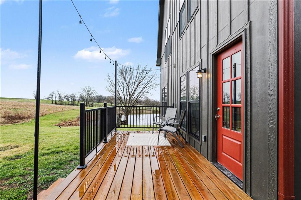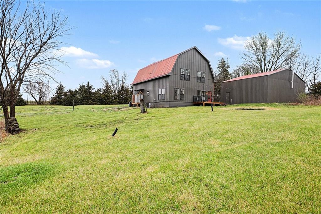 Experience the perfect marriage of turn-of-the-century character and cutting-edge luxury in this stunning 1900 barn conversion! Situated on 4.75 private acres, a half-hour from KC International airport, this three-story masterpiece has been meticulously reimagined into a sophisticated four-bedroom, five-bathroom retreat that defines "one of a kind." The main level anchors the home with a chef’s dream kitchen. Designed for both high-function and high-style with premium GE Café appliances and professional-grade finishes. With warm pine accents that nod to the structure's historic roots, an expansive layout flows effortlessly into the first of two distinct living areas. Ascend to the second floor to find a spectacular lofted great room. This massive secondary living space is the ultimate "game-day" destination, complete with a dedicated wet bar and a layout designed for large-scale entertaining or quiet relaxation. The primary suite is a masterclass in convenience and comfort, offering dual walk-in closets and integrated secondary washer/dryer hookups, ensuring laundry day is effortless. Spa-like finishes that create a true sanctuary. The beauty of the 4.75-acre lot is pulled indoors through thoughtful design, but the outdoor features are equally impressive. After a day exploring the grounds, use the outdoor shower to rinse off while overlooking the serene pond—perfect for keeping both owners and pets clean. A 42x30 outbuilding provides ample space for a workshop, studio, or equipment storage. This isn't just a home; it's a piece of history updated for the modern connoisseur with Smithville Lake, shopping and dining less than 20 minutes down the road. Schedule your private tour today to experience the scale and craftsmanship of this rural luxury estate!
