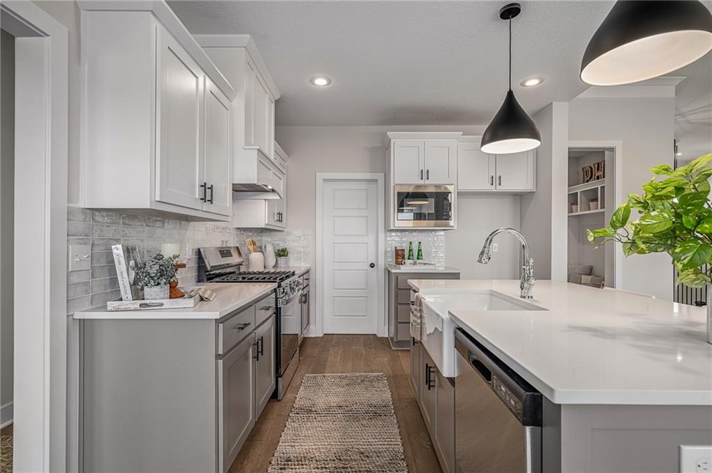 Discover The Payton, a masterfully designed floor plan by Prieb Homes that offers the perfect blend of luxury, comfort, and modern functionality. Located in the highly sought-after Prairie Farms community, this home features 4 spacious bedrooms, 3 full bathrooms, and a 3-car garage across an expansive 3,121 sq. ft. layout. A chef’s dream featuring a large center island, granite countertops, custom cabinetry with soft-close drawers, a walk-in pantry, and stainless steel appliances. A wide-open space centered around a cozy fireplace, flooded with natural light from a wall of windows. A private retreat with vaulted ceilings, double vanities, a tiled walk-in shower, and a massive closet that conveniently connects to the laundry room. Two additional bedrooms and a full bath are located on the main floor, perfect for guests or a home office. The finished lower level boasts a massive rec room that walks out to a patio, plus a 4th bedroom and full bath. Significant unfinished space for storage. Living in Prairie Farms means enjoying top-tier amenities including a swimming pool with a "Signature Barn" cabana, a play area, and miles of walking trails. You are just steps away from the newly renovated Lake Olathe, offering a swim beach, marina, and aqua park. Located in the award-winning Olathe School District (Clearwater Creek Elementary, Oregon Trail Middle, and Olathe West High), this is more than a home—it's a lifestyle. Located in the new phase of Prairie Farms