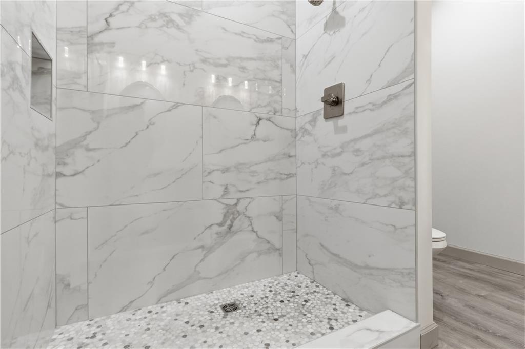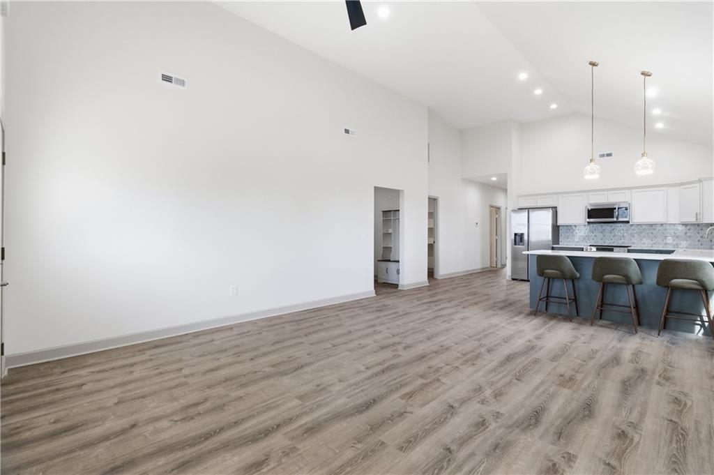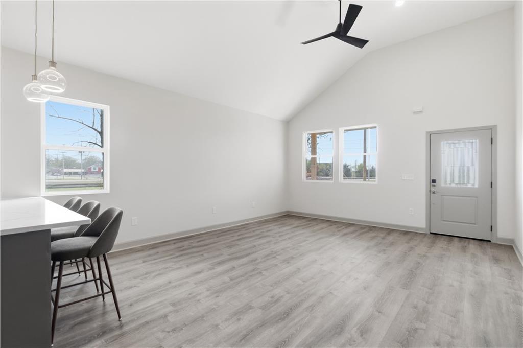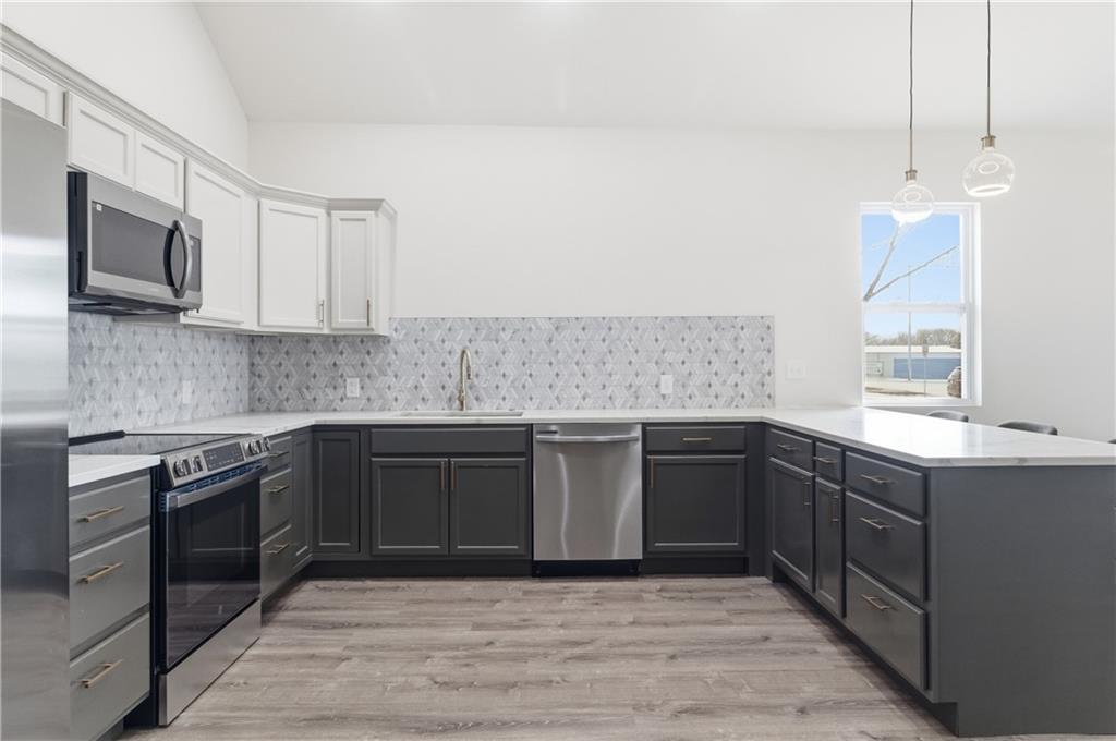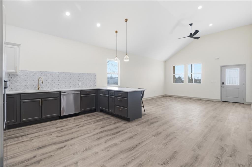 Welcome to this stunning brand-new construction home offering over 1,800 square feet of thoughtfully designed living space. This 3-bedroom, 2-bath home features a bright and open layout, highlighted by a spacious living room with impressive 16-foot vaulted ceilings and abundant natural light, while the remainder of the home offers comfortable 9-foot ceilings throughout. The modern kitchen is a true centerpiece, complete with sleek quartz countertops, a stylish marble backsplash, stainless steel appliances, and an oversized pantry providing ample storage. Durable and attractive LVP flooring flows seamlessly through the living, dining, and kitchen areas. The private primary suite serves as a relaxing retreat, featuring a spa-like bathroom with a double vanity, quartz countertops, and a beautifully tiled walk-in shower. The suite also includes a walk-in closet with built-in shelving for optimal organization. Each bedroom is equipped with ceiling fans for added comfort. Step outside to a brand-new deck, perfect for relaxing or entertaining. This is the one you’ve been waiting for—don’t let it slip away!