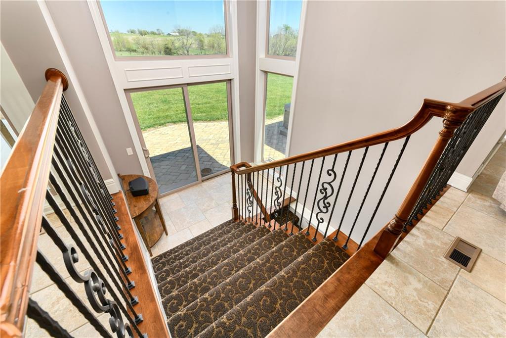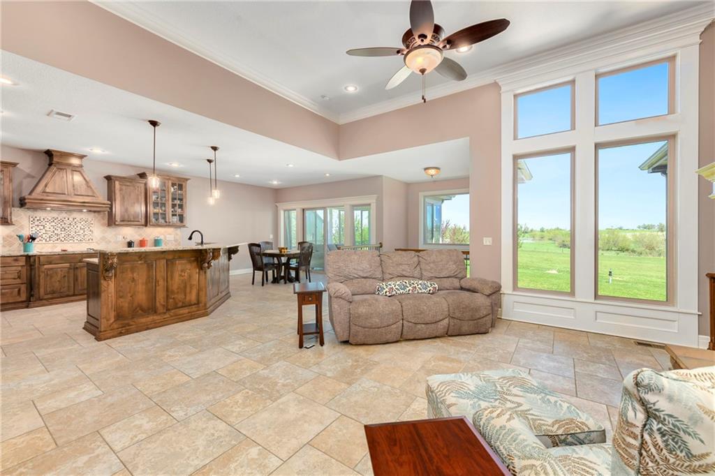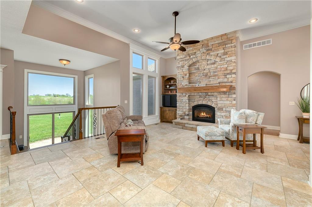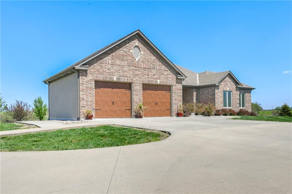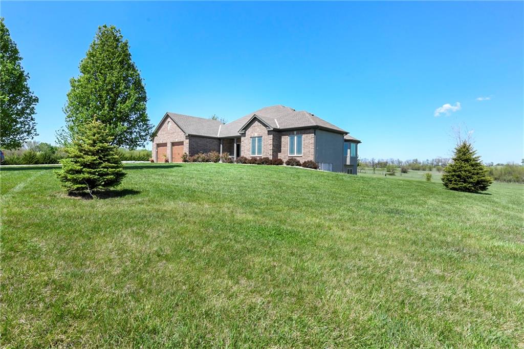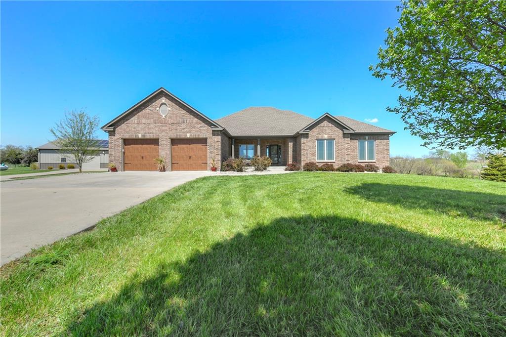 This stunning custom-built all-brick ranch sits majestically atop a hill, offering breathtaking views and the perfect blend of luxury and functionality. Designed for true main-level living, the home features three spacious bedrooms on the main floor. Two secondary bedrooms provide excellent flexibility for guests, family, or a home office—complete with abundant natural light and beautiful wood flooring. The expansive primary suite is a true retreat, easily accommodating large furniture and complemented by a spa-like ensuite featuring a walk-in shower, jetted soaking tub, double vanities, and an impressive walk-in closet. Enjoy both formal and casual living with a dedicated dining room and an open-concept kitchen equipped with a cooktop, granite countertops, stained wood cabinetry, and a large pantry. The kitchen flows seamlessly into the great room, where a striking stone fireplace and walls of windows showcase the property’s scenic surroundings. An enclosed four-season sunroom extends the living space, perfect for relaxing or entertaining year-round. Additional main-level conveniences include a drop zone off the garage, and a second laundry option in the pantry. The partially finished walk-out basement adds even more versatility with a fourth bedroom, full bathroom, family room, and a second laundry area. There is ample opportunity to expand, with space for two additional bedrooms and a fourth bathroom—featuring daylight windows for added comfort and value. Outside, the property truly shines with approximately 12 acres of agricultural land, plus an additional 2 acres surrounding the home. A massive 2,900 sq ft utility building includes solar power that saves tons on utility bills, ideal for a variety of uses. The property is fully fenced and secured with a grand electric entry gate. Enjoy the best of both worlds—peaceful country living with a prime location offering convenient access to everything the Kansas City area has to offer.