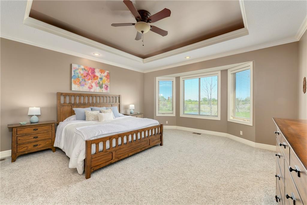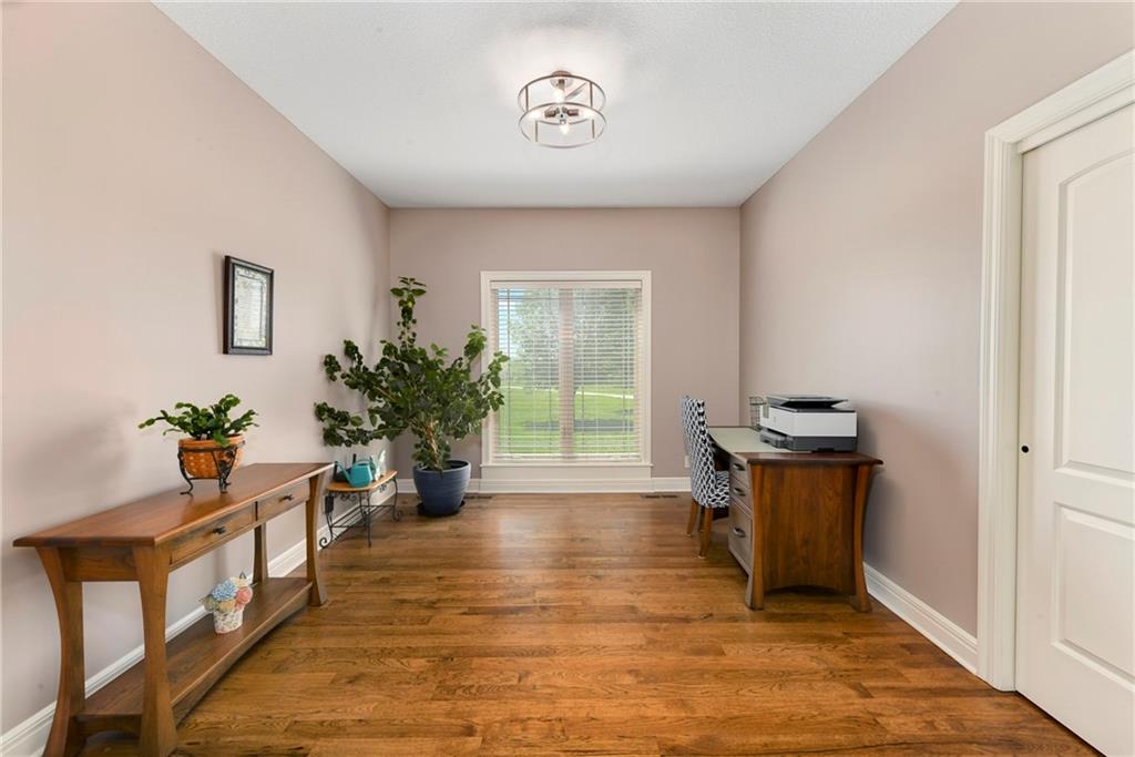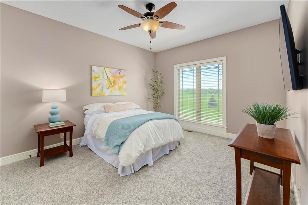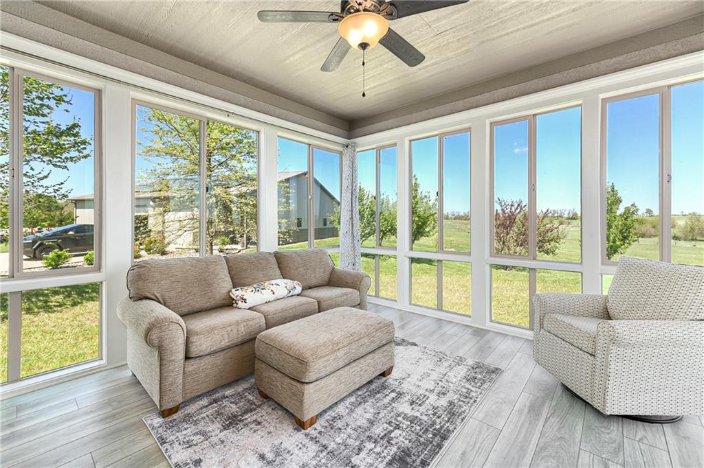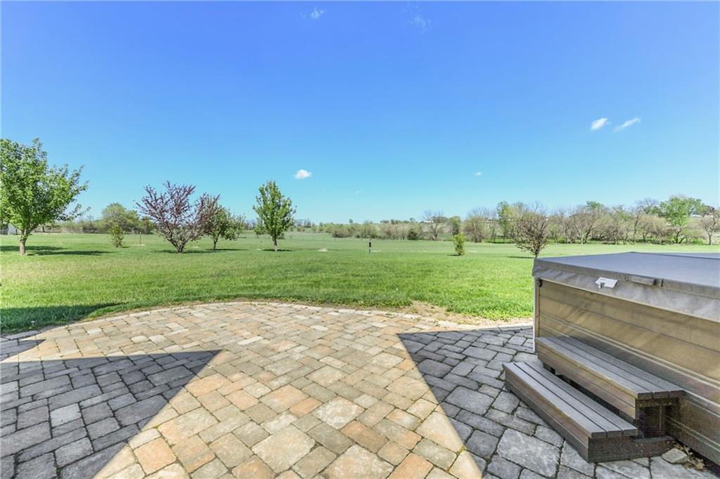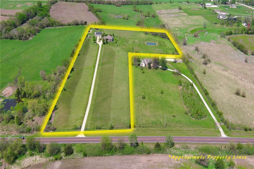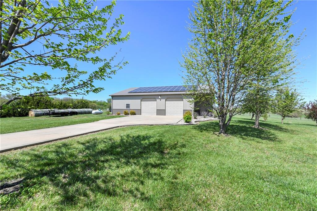 This stunning custom-built all-brick ranch sits majestically atop a hill, offering breathtaking views and the perfect blend of luxury and functionality. Designed for true main-level living, the home features three spacious bedrooms on the main floor. Two secondary bedrooms provide excellent flexibility for guests, family, or a home office—complete with abundant natural light and beautiful wood flooring. The expansive primary suite is a true retreat, easily accommodating large furniture and complemented by a spa-like ensuite featuring a walk-in shower, jetted soaking tub, double vanities, and an impressive walk-in closet. Enjoy both formal and casual living with a dedicated dining room and an open-concept kitchen equipped with a cooktop, granite countertops, stained wood cabinetry, and a large pantry. The kitchen flows seamlessly into the great room, where a striking stone fireplace and walls of windows showcase the property’s scenic surroundings. An enclosed four-season sunroom extends the living space, perfect for relaxing or entertaining year-round. Additional main-level conveniences include a drop zone off the garage, and a second laundry option in the pantry. The partially finished walk-out basement adds even more versatility with a fourth bedroom, full bathroom, family room, and a second laundry area. There is ample opportunity to expand, with space for two additional bedrooms and a fourth bathroom—featuring daylight windows for added comfort and value. Outside, the property truly shines with approximately 12 acres of agricultural land, plus an additional 2 acres surrounding the home. A massive 2,900 sq ft utility building includes solar power that saves tons on utility bills, ideal for a variety of uses. The property is fully fenced and secured with a grand electric entry gate. Enjoy the best of both worlds—peaceful country living with a prime location offering convenient access to everything the Kansas City area has to offer.