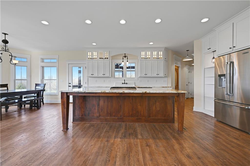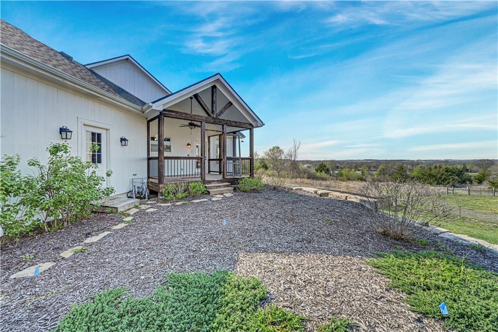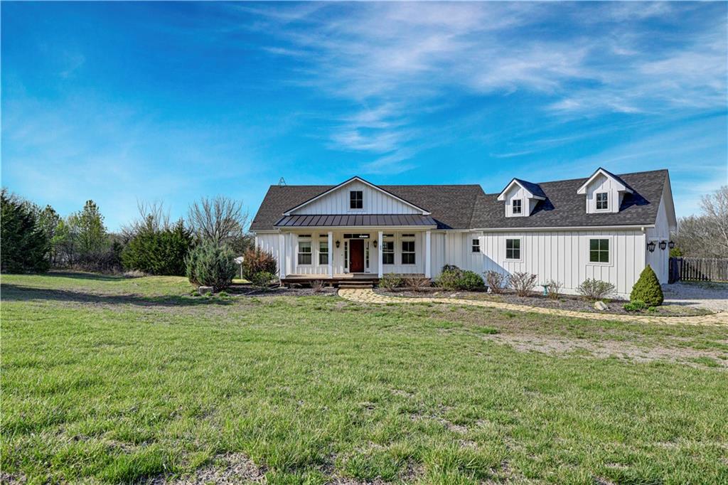 Just 30 minutes south of Overland Park, this peaceful retreat near Hillsdale Lake is your DREAM country property! Built in 2018, the reverse 1.5 story home STILL FEELS NEW with high quality finishes and lots of windows that capture the incredible views. Almost 8 private acres that adjoin the Army Corps of Engineer's land offer with a stocked shared pond on the north end of the property that is the perfect fishing spot. The nearby Hillsdale Lake trail system is over 50 acres and perfect for nature lovers or horse riding. A 54'x30' outbuilding with power and water has stalls for livestock or horses. Inside you'll find an open floorplan with 2 main level bedrooms and 2 more bedrooms in the walk-out lower level. Gorgeous kitchen with farmhouse sink and walk in pantry opens to the lovely hearth room living and dining rooms. Laundry room off the kitchen with extra storage. A dreamy screened in porch is the perfect spot to relax and take in the serene views of wildlife. The main level primary suite with a large walk in closet is a fabulous retreat. The lower level has a kitchenette and a large rec space and it’s own screened in porch. Take the cleared trail down to the lake that is shared by just a few other properties that touch it. Several fenced areas for riding or grazing. This property must be seen to be appreciated...don't miss it!