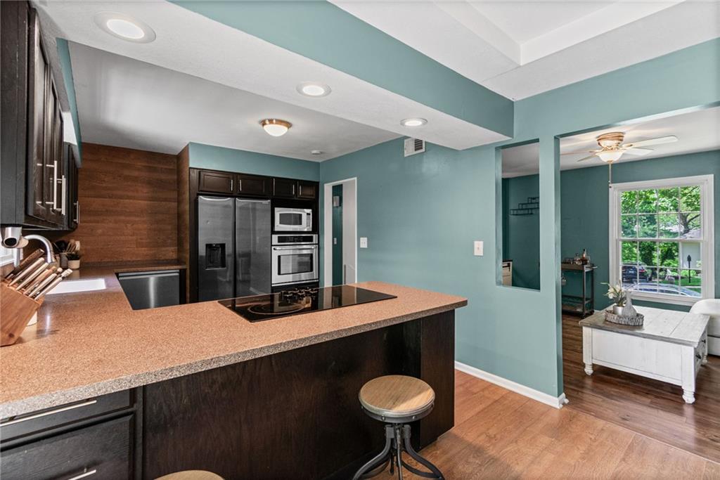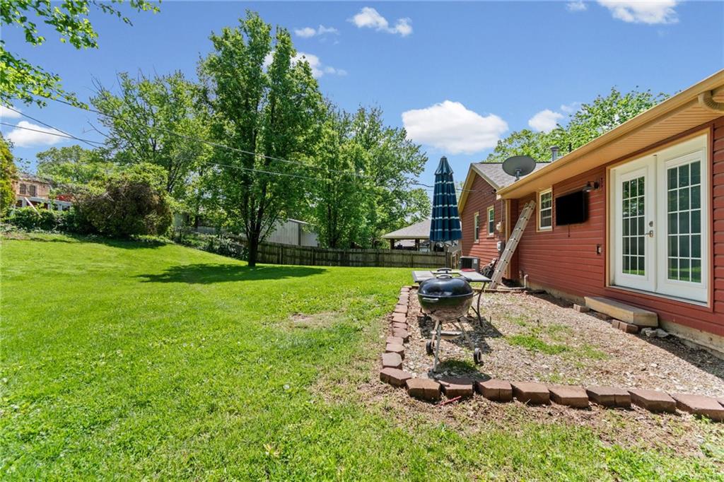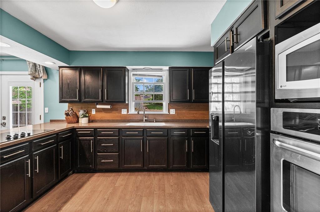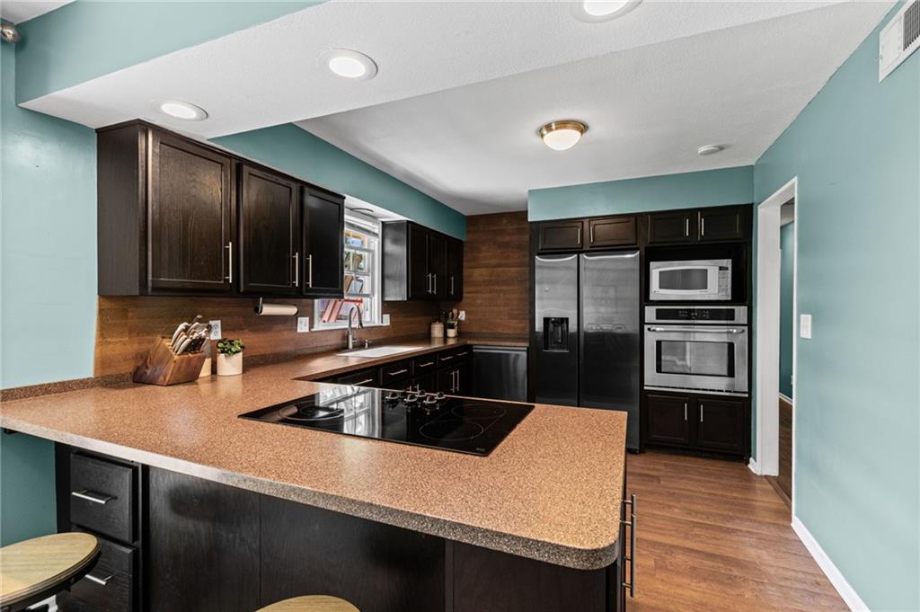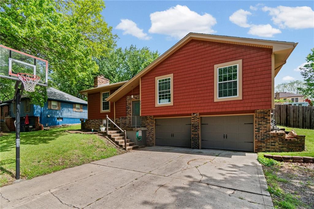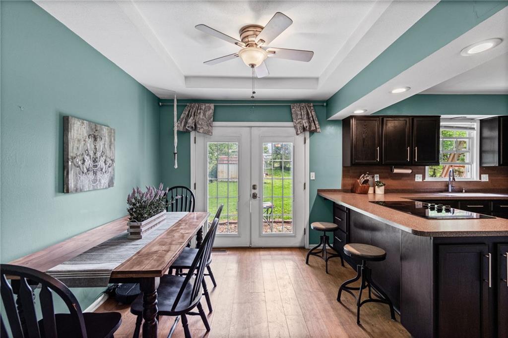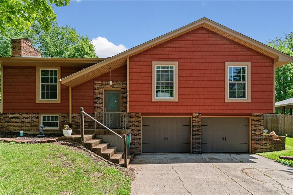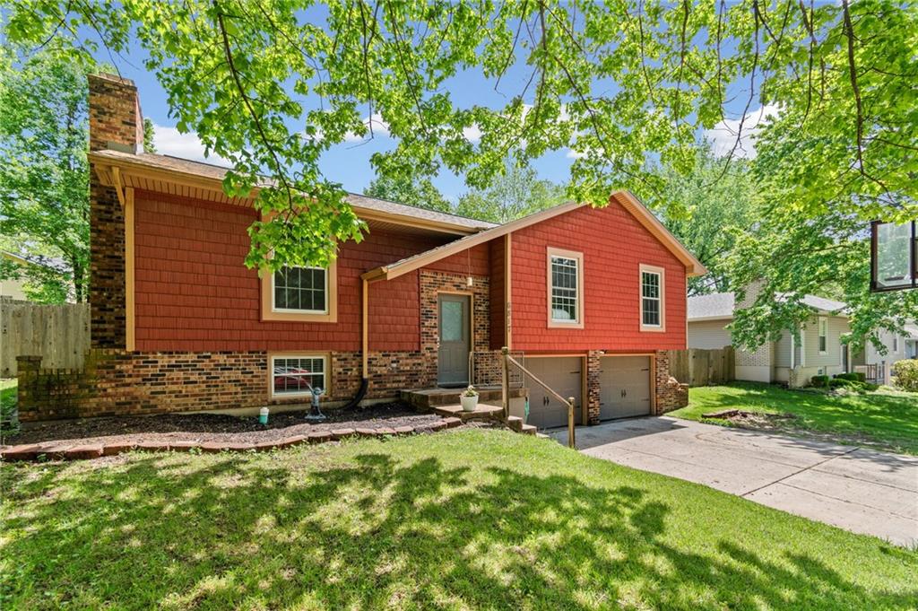 Tucked into a quiet, mature treed cul-de-sac, this inviting raised ranch offers comfort, style, and a highly functional layout. Step inside and head upstairs to find laminate wood flooring flowing seamlessly through the main living areas, hallway, and bedrooms. The light-filled living room sits just off the top of the stairs, featuring a ceiling fan and a large picture window overlooking the front yard, and opens easily to the breakfast area. French doors lead from the breakfast space to the fenced backyard, creating a natural flow for everyday living and entertaining. The kitchen is well-appointed with solid surface counters, a breakfast peninsula with built-in cooktop, modern dark-stained cabinetry, tile backsplash, and stainless appliances including a built-in oven. Down the hall, the owner’s suite offers wood blinds, ceiling fan, a long closet, and a private ensuite bath with tile flooring, solid surface vanity, and tiled shower. Two additional bedrooms with ceiling fans and wood blinds share a hall bath with tub/shower combination and extended vanity. The lower level expands your living space with a daylight family room featuring a wood-burning masonry fireplace and walkout access to the garage. An adjoining recreation area includes an L-shaped rustic wood bar with sink—perfect for gatherings. A convenient half bath and laundry room complete the lower level. Enjoy the privacy of a fenced backyard and a location just minutes from The National Golf Club, Highway 45, shopping, dining, and everyday amenities.